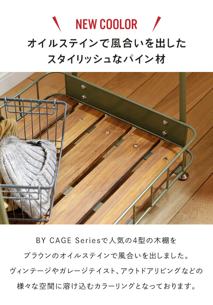 | BY CAGE HANGER| パインウッド×アイアンの組み合わせでノスタルジックな”自転車カゴ”をイメージしたコートハンガー。 足元の棚には大容量のスペースを確保。 コンパクトでありながら充実した収納力が魅力です。 サイドのフックは帽子やバッグなど身の回りのモノを掛けるのに便利。 圧迫感のない控えめなサイズ感でお部屋を選ばずお使いいただけます。 脚部にはガタつき防止のアジャスターが付いています。 ----- 木棚をブラウンのオイルステインで風合いを出したアイテムを追加。 フレーム色は、定番色のブラックとブラウン棚に相性の良いカーキの2色展開。 ヴィンテージやガレージテイスト、アウトドアリビングなどの様々な空間に溶け込むカラーリングとなっております。 |