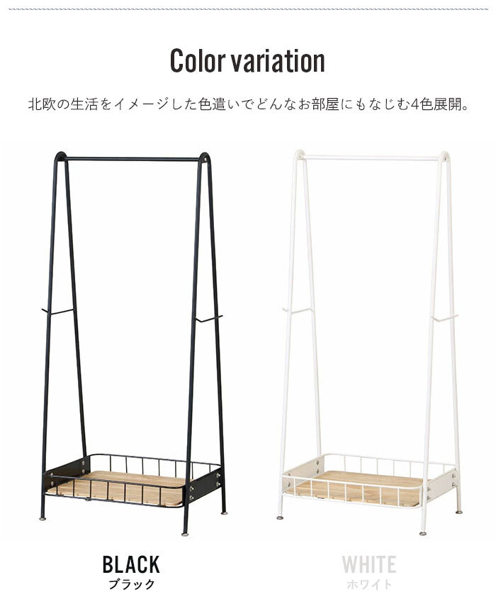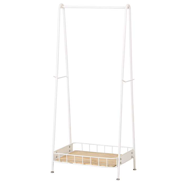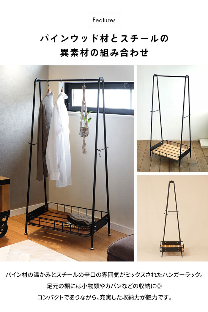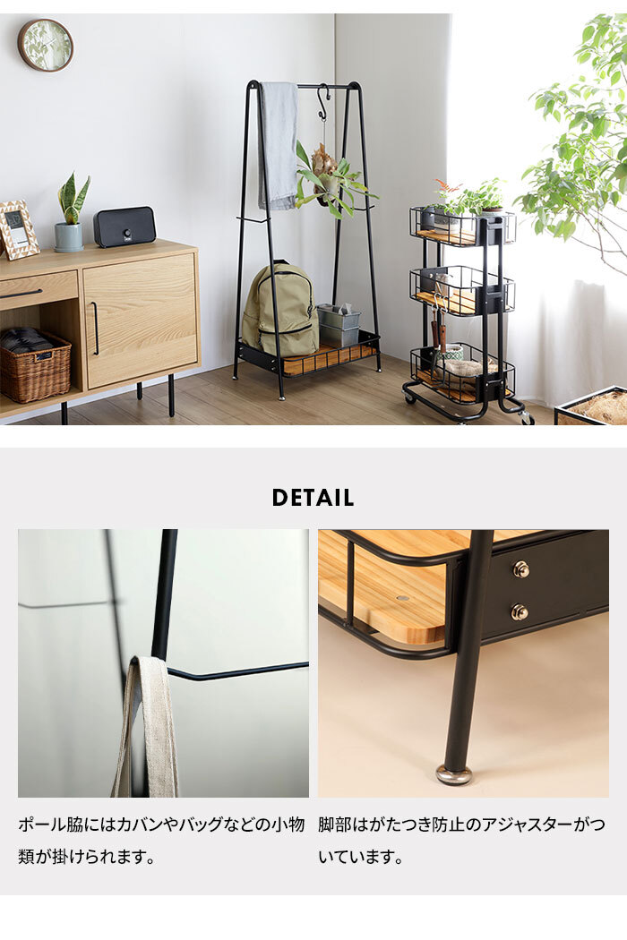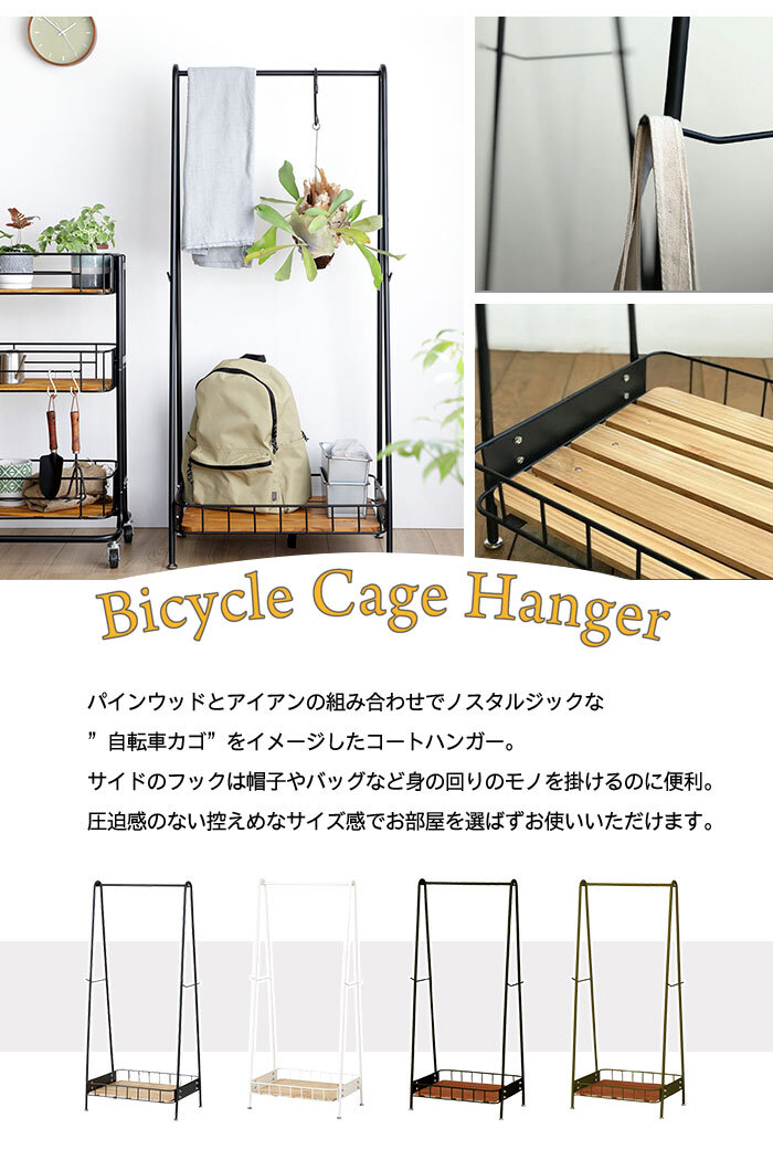 | ・自転車カゴをイメージしたアイアンとパイン材の組み合わせがおしゃれなコートハンガー ・圧迫感の出ない控えめなサイズ感とシンプルなデザインでお部屋を選ばず使えます ・両サイドにフックバーがあり身の回りのものを掛けておくのに便利です ・ハンガー部の耐荷重は約15kg ・足元の棚には大容量の収納スペースを確保しており、バッグや小物などが置けます。 |