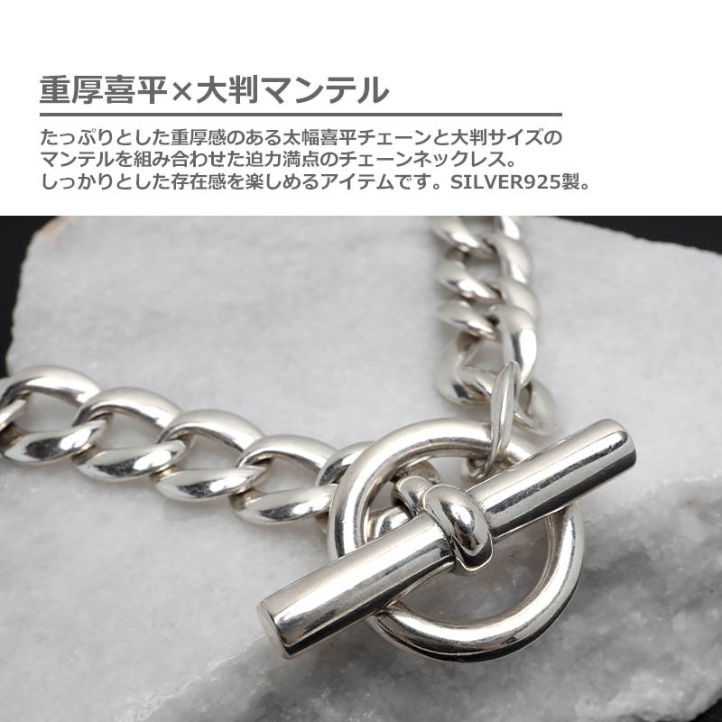 たっぷりとした重厚感のある太幅喜平チェーンと大判サイズのマンテルを組み合わせた迫力満点のチェーンネックレス。単体でしっかりとした存在感を楽しめるアイテムです。