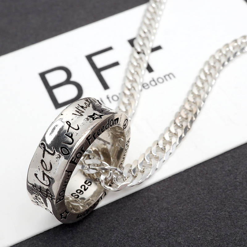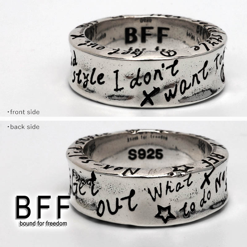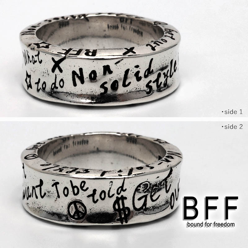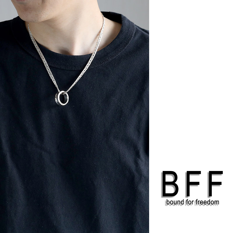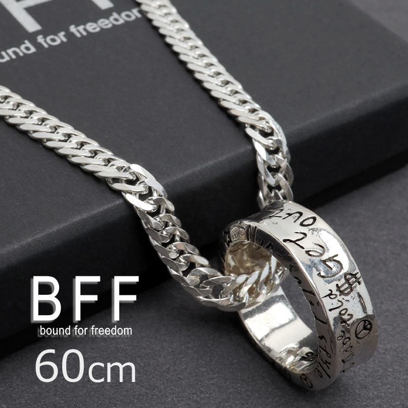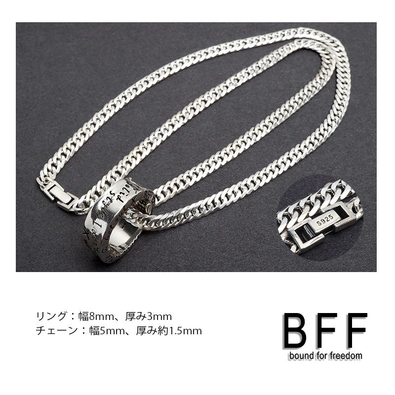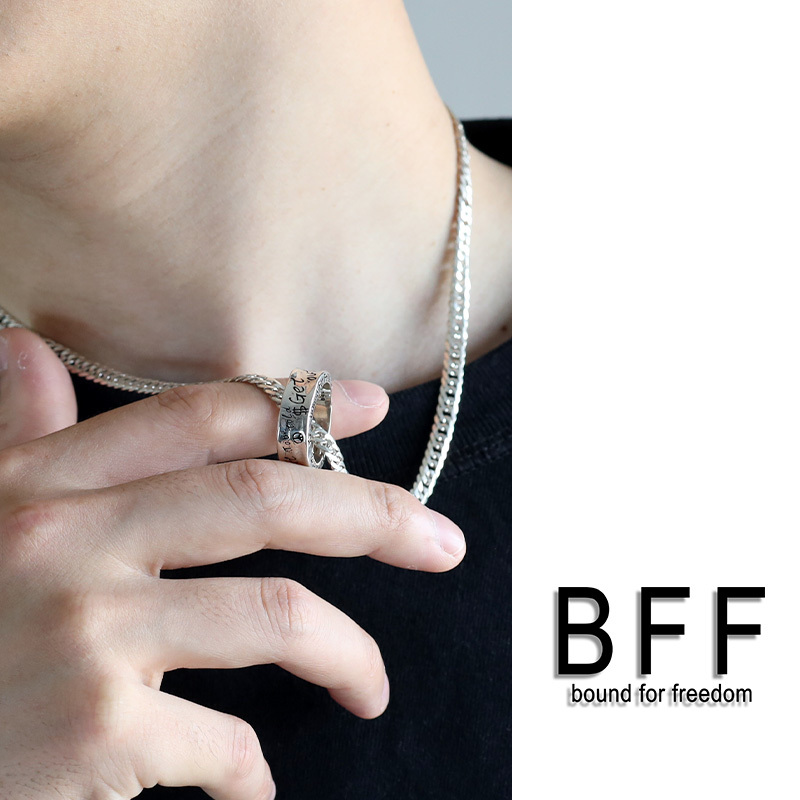 ”Non solid style" 重厚感溢れるシルバー925製のリングのボディにBFFを体現するワードをユニークに彫り込んだRAKUGAKIリングをペンダントに据えたネックレス。チェーンは重厚なダブル喜平チェーンをセット。