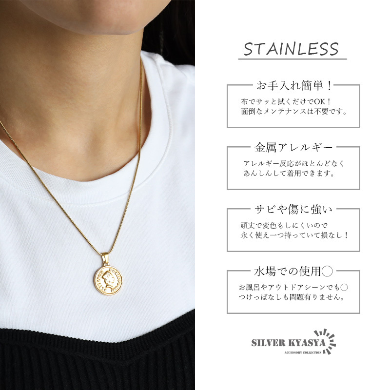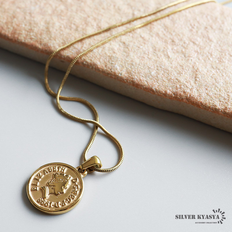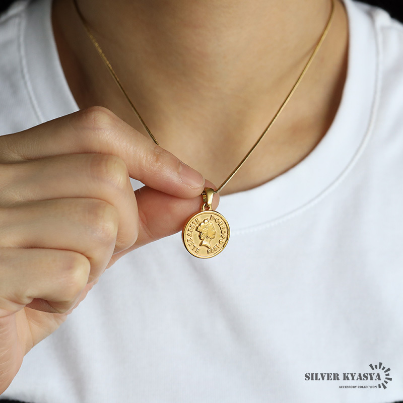 | 商品概要 | ■ITEM DETAIL エリザベス女王が描かれた硬貨をモチーフにしたネックレス。チェーンはスネークタイプで首元にフィットするデザイン。 ■ステンレス素材を使用 金属部分は頑丈なことで知られるステンレス素材を採用。耐久性はもちろん耐水性も高く水場での着用も可能。金属アレルギーも出にくいとされている金属です。 |