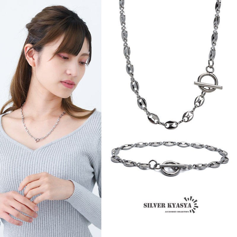 お洒落なデザインのアンカータイプのチェーンアイテム。留め具は人気のマンテルタイプです。ブレスレットとネックレスのセットで統一感あるスタイルを楽しめます。
