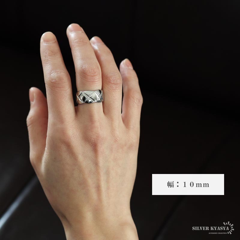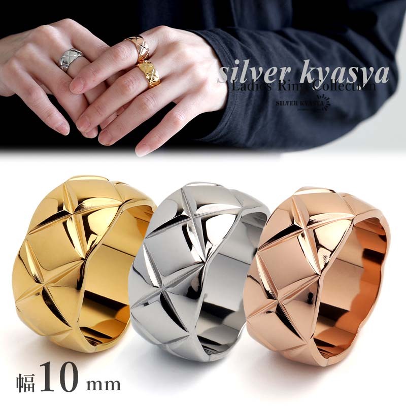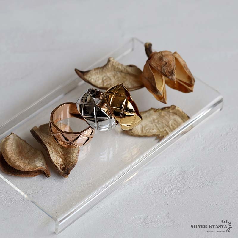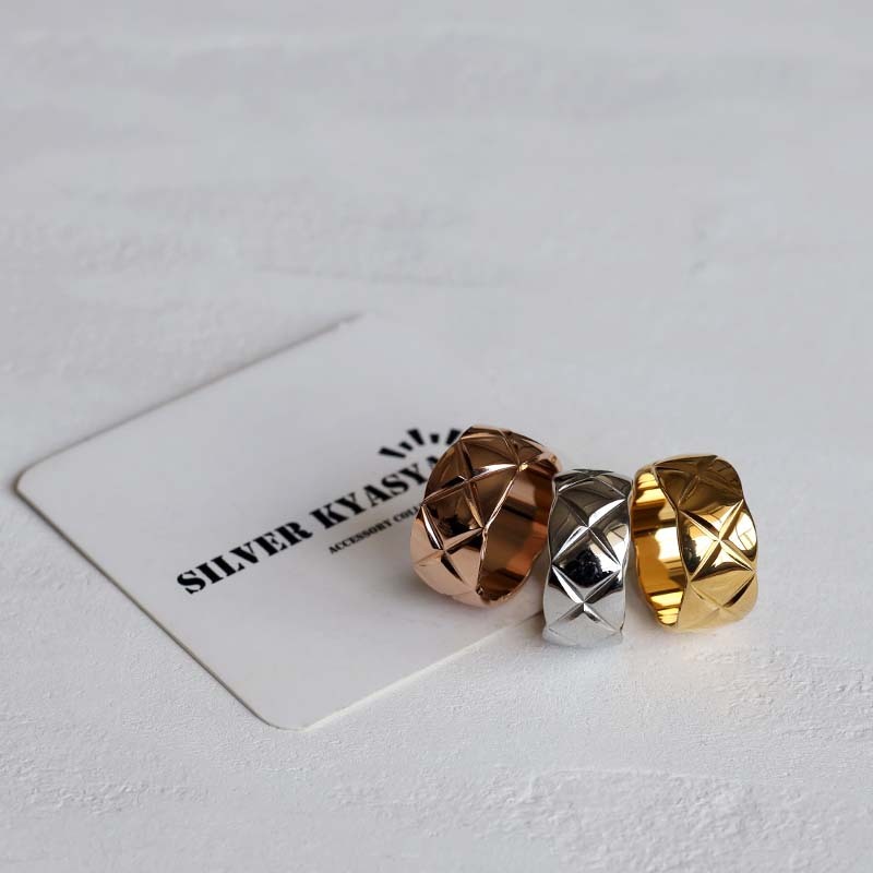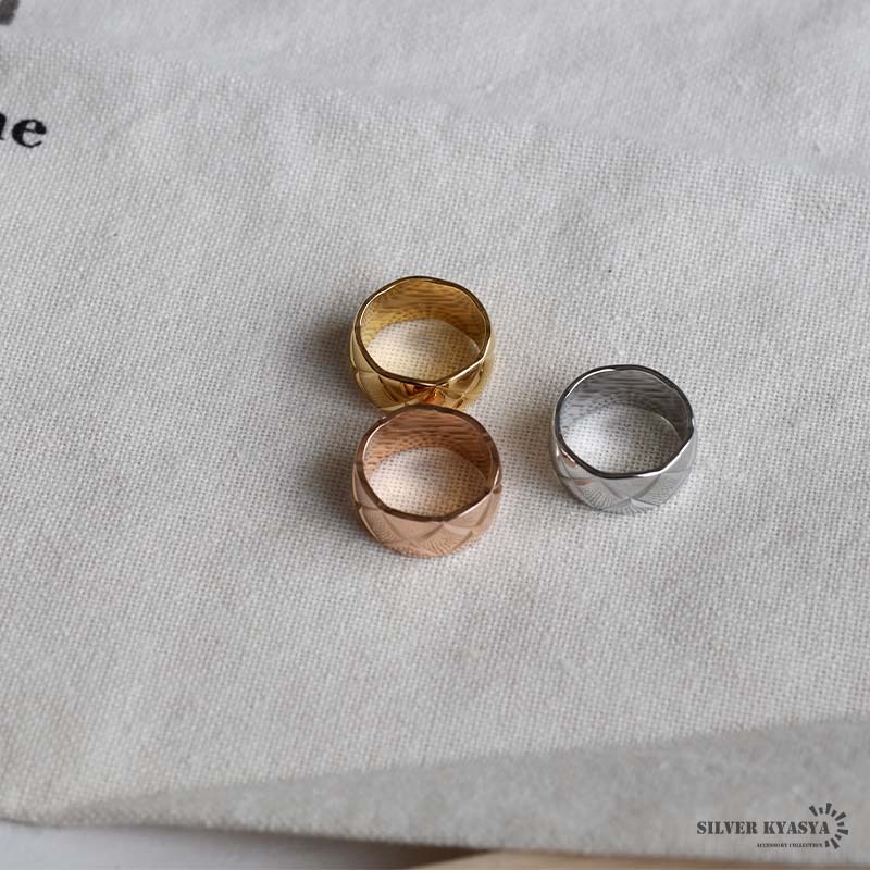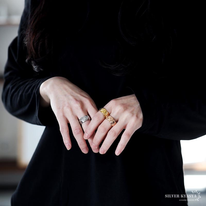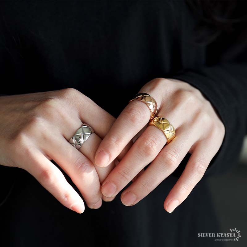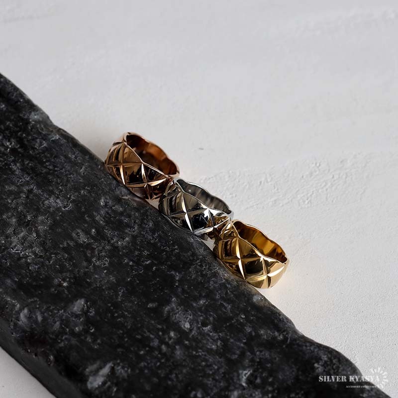 キルティング模様がカジュアルな可愛らしさを生むリング。幅広のデザインが存在感たっぷりでアクセントとして活躍します。