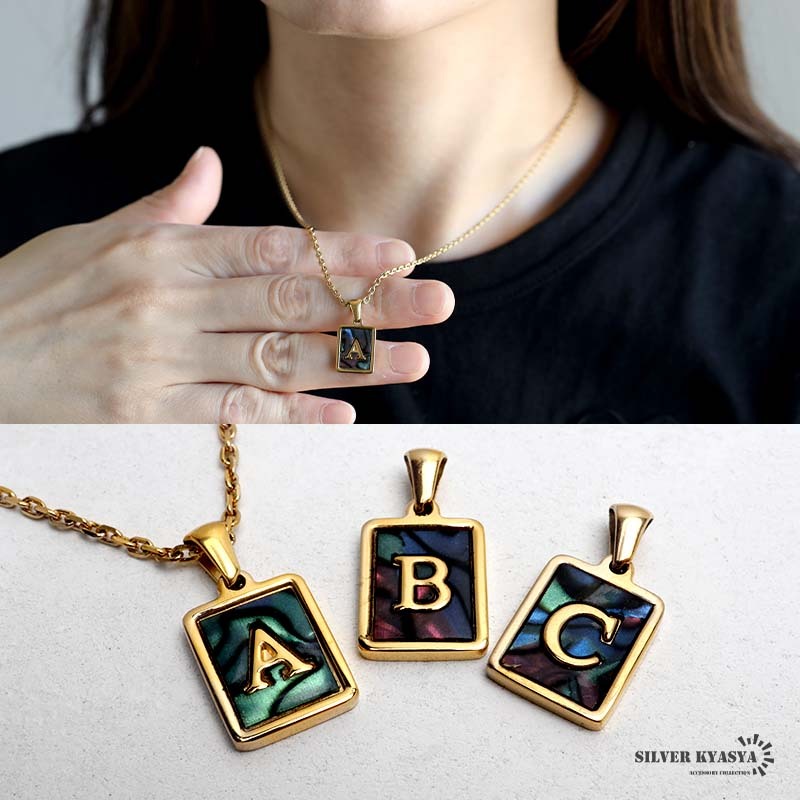 スクエア型プレートにアルファベットをあしらったネックレス。オーロラのような美しい色彩にゴールドが映えるアイテムです。自分へのご褒美や、大切な人への贈り物としてもおすすめ。