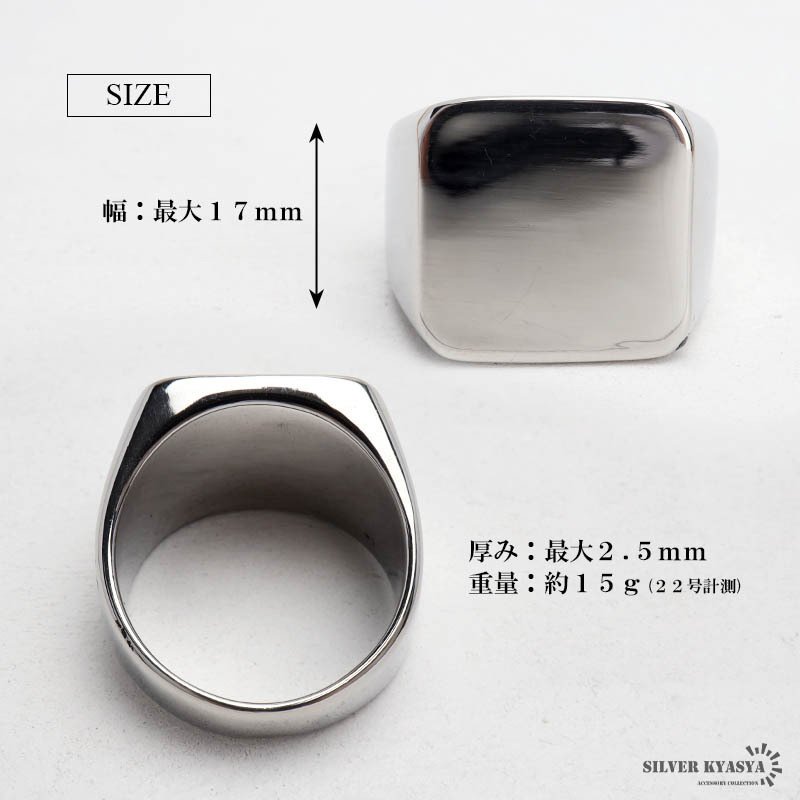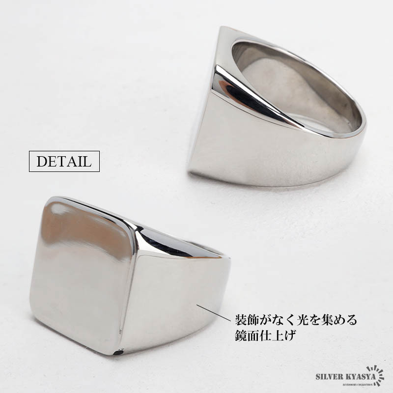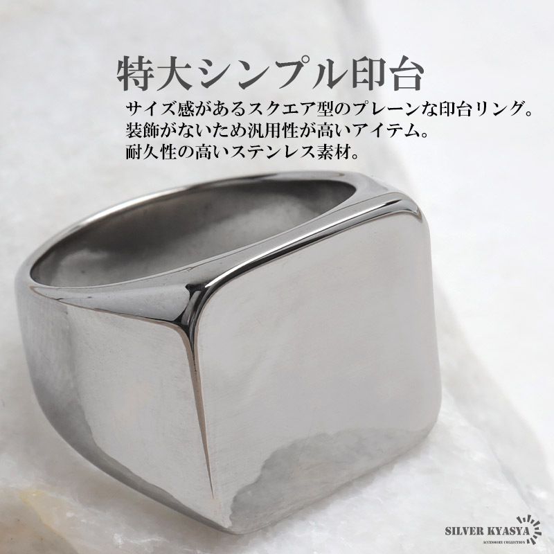 | 商品概要 | ■特大シンプル印台 サイズ感があるスクエア型のプレーンな印台リング。装飾がないため汎用性が高いアイテム。耐久性の高いステンレス素材。 ■ステンレス素材を使用 金属部分は頑丈なことで知られるステンレス素材を採用。耐久性はもちろん耐水性も高く水場での着用も可能。金属アレルギーも出にくいとされている金属です。 |