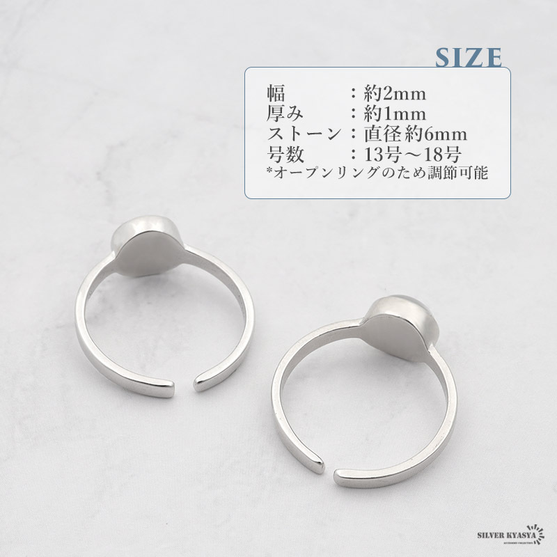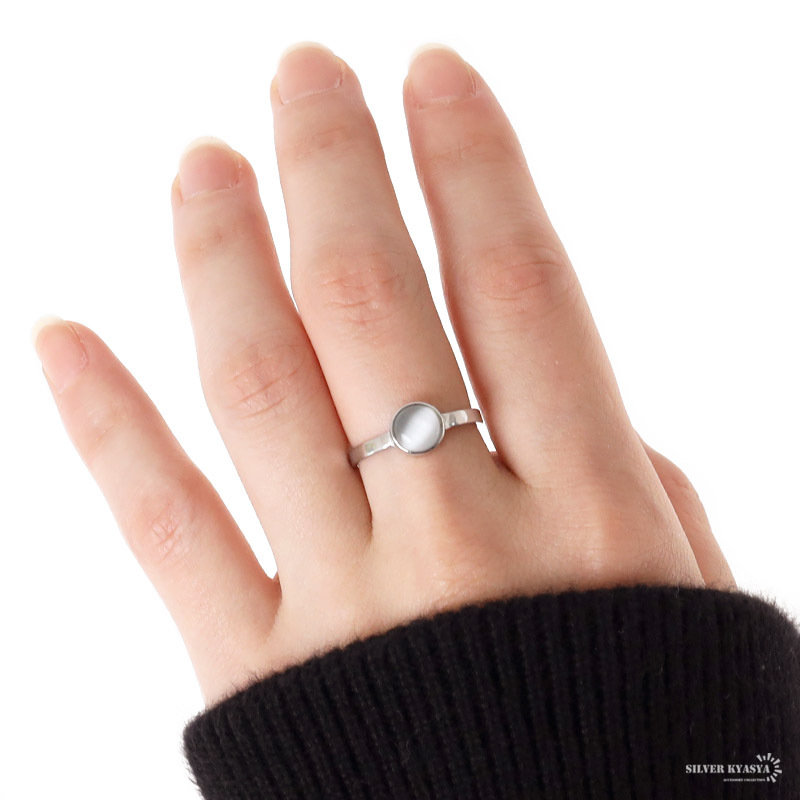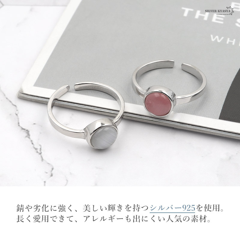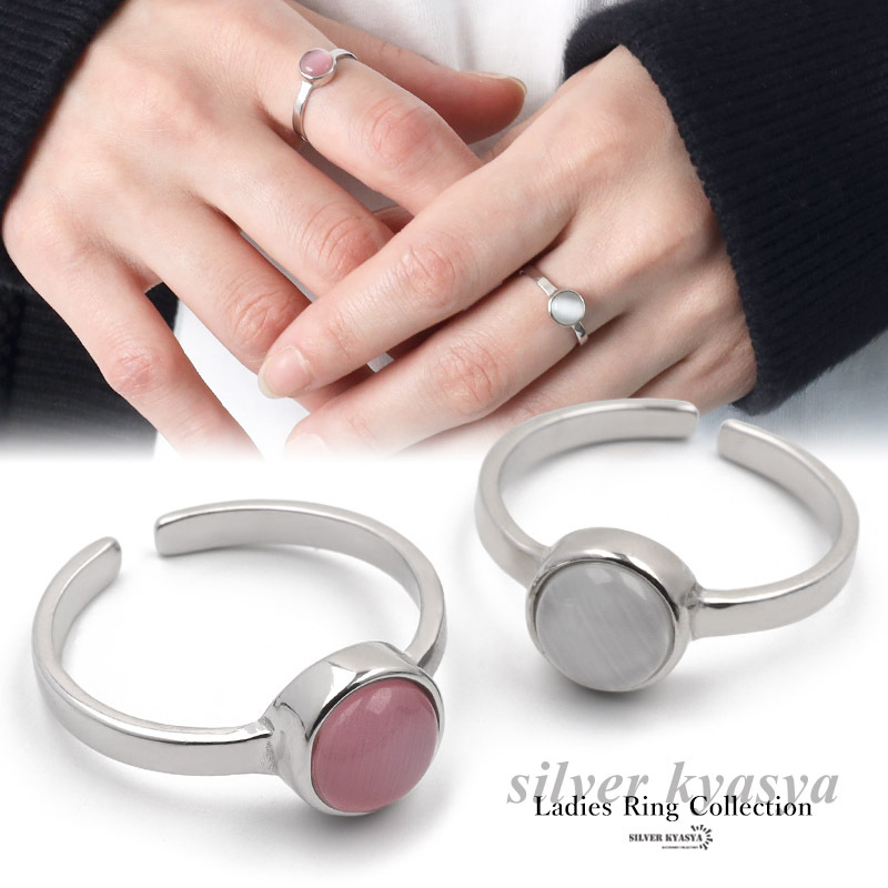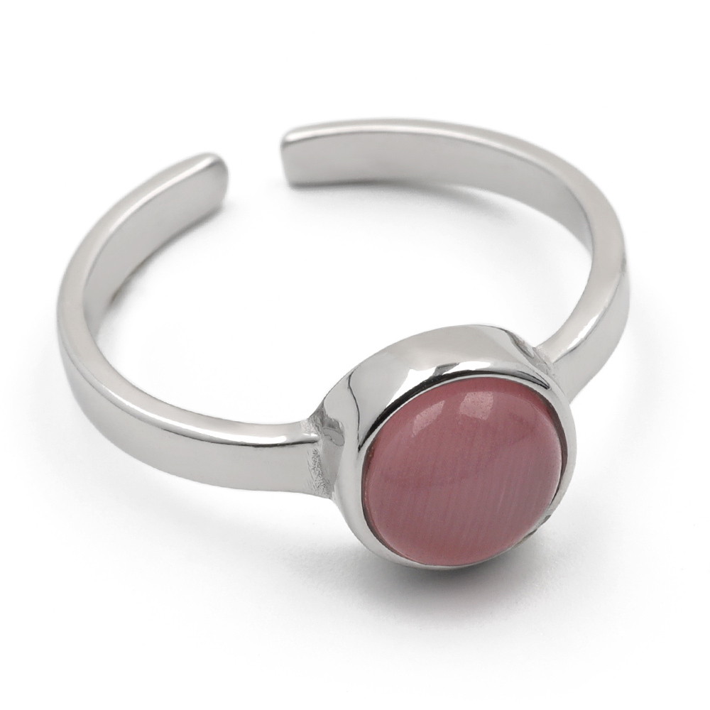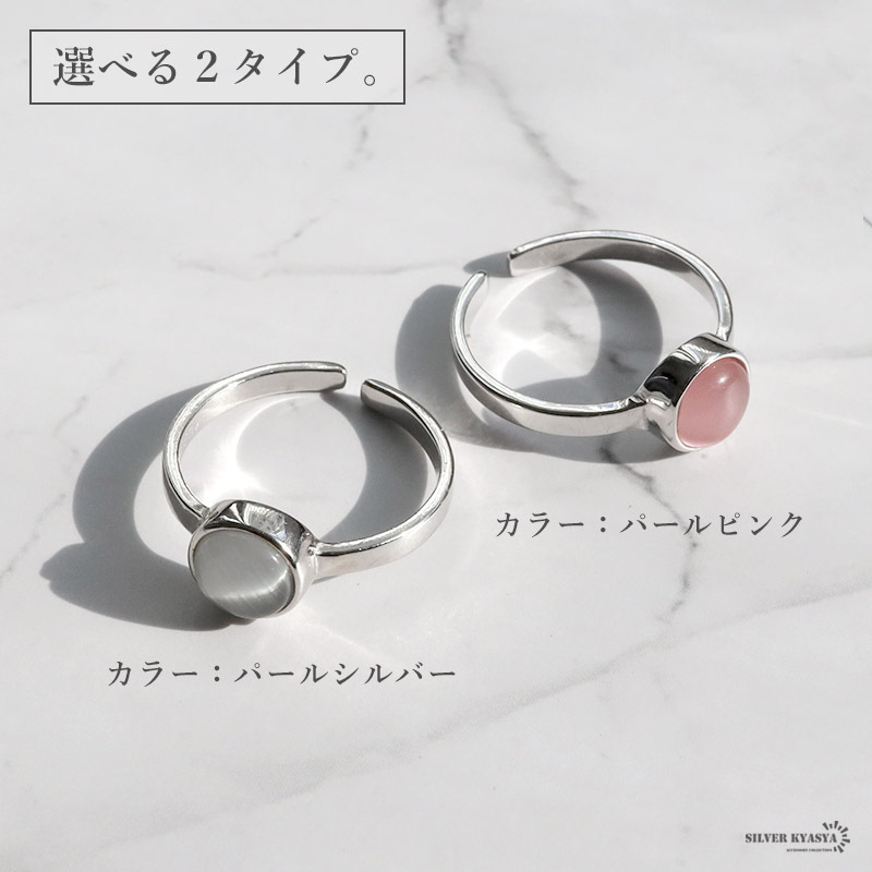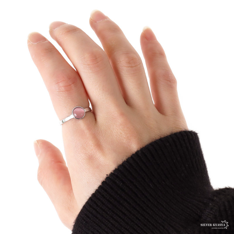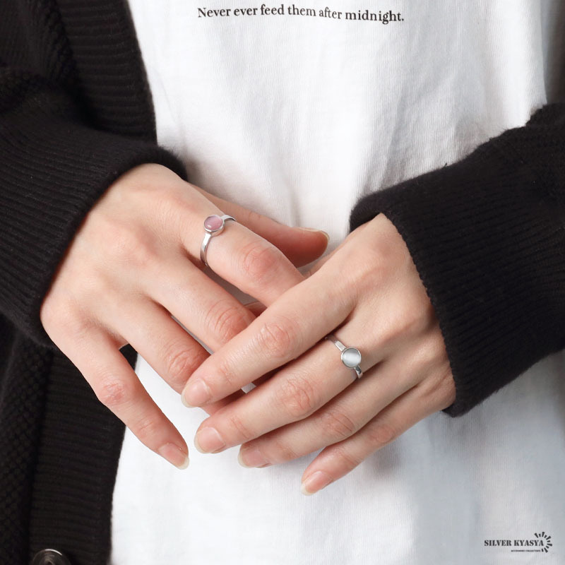猫目石と呼ばれる天然石を使用した、透明感のあるシンプルなリング。ピンクとブルーの2カラー展開。