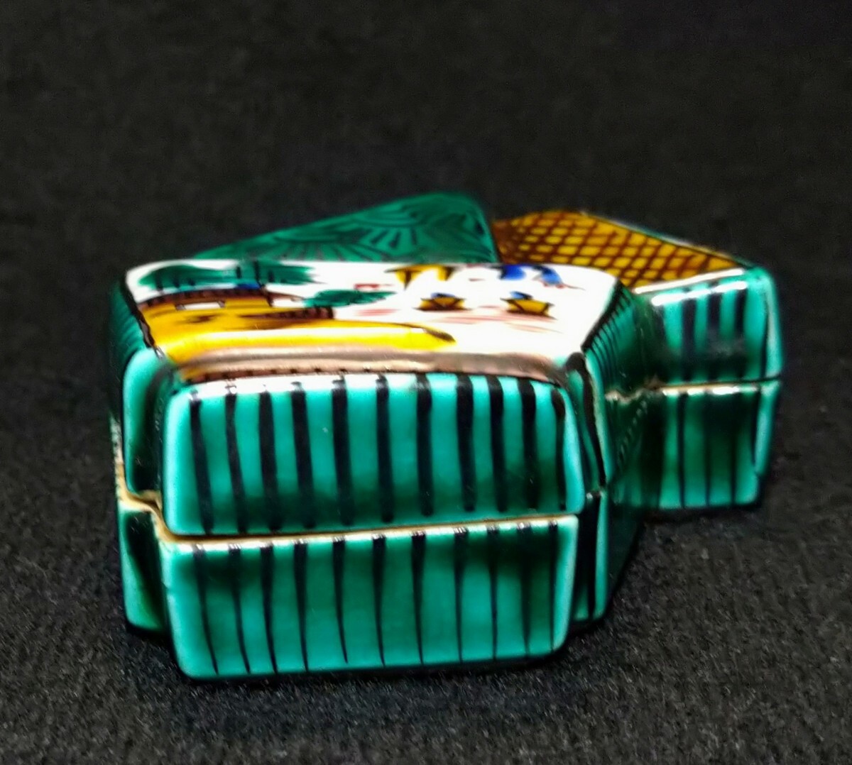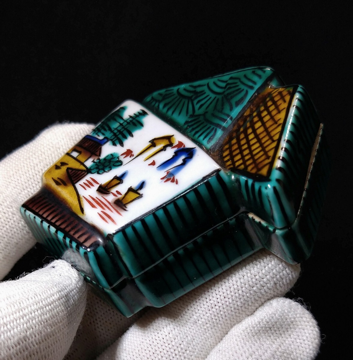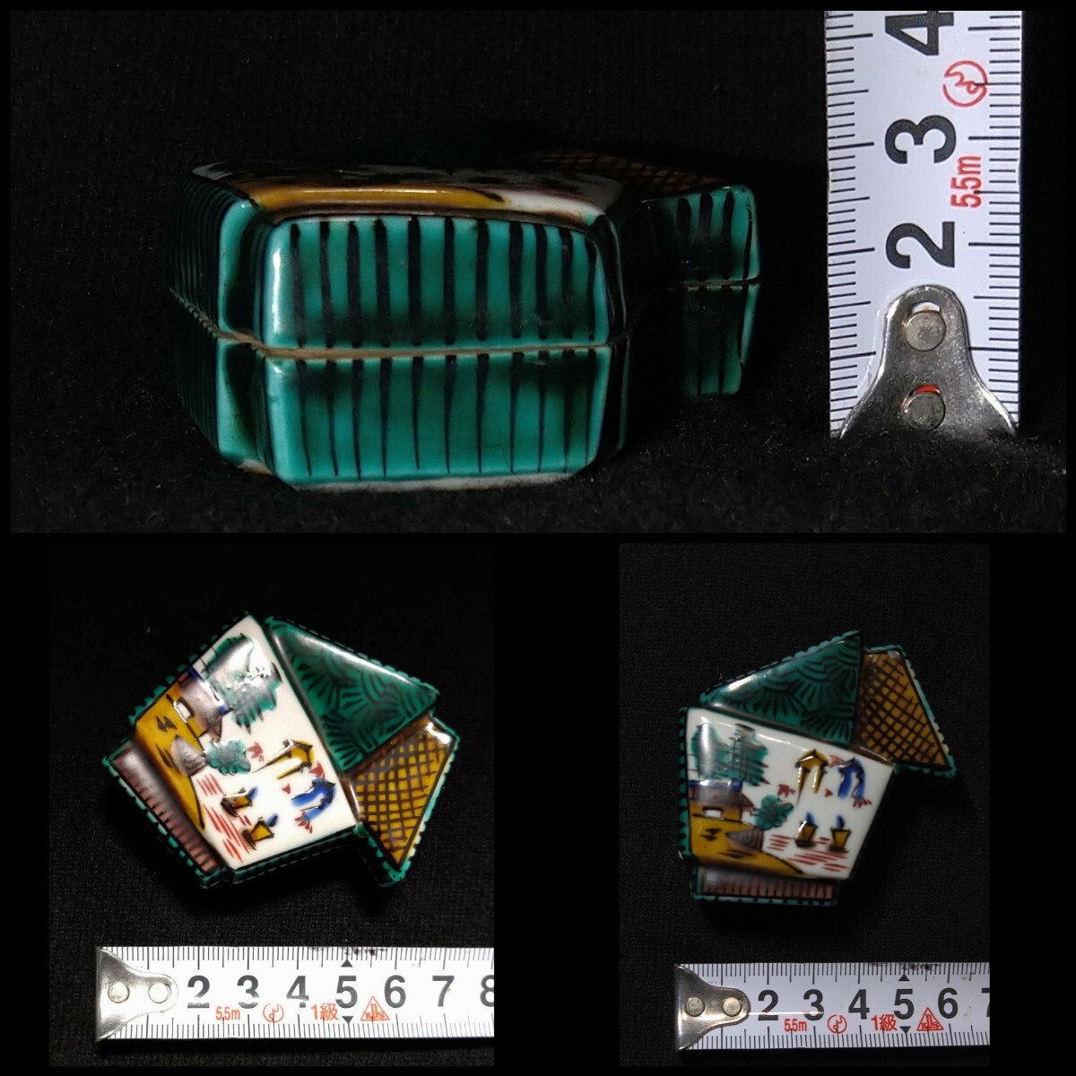 小さい体躯ながらもキリッとした佇まいの美しい香合でございます。素人採寸で申し訳ございませんが、幅7.2cm、6.2cm、高さ2.6cmでございます。