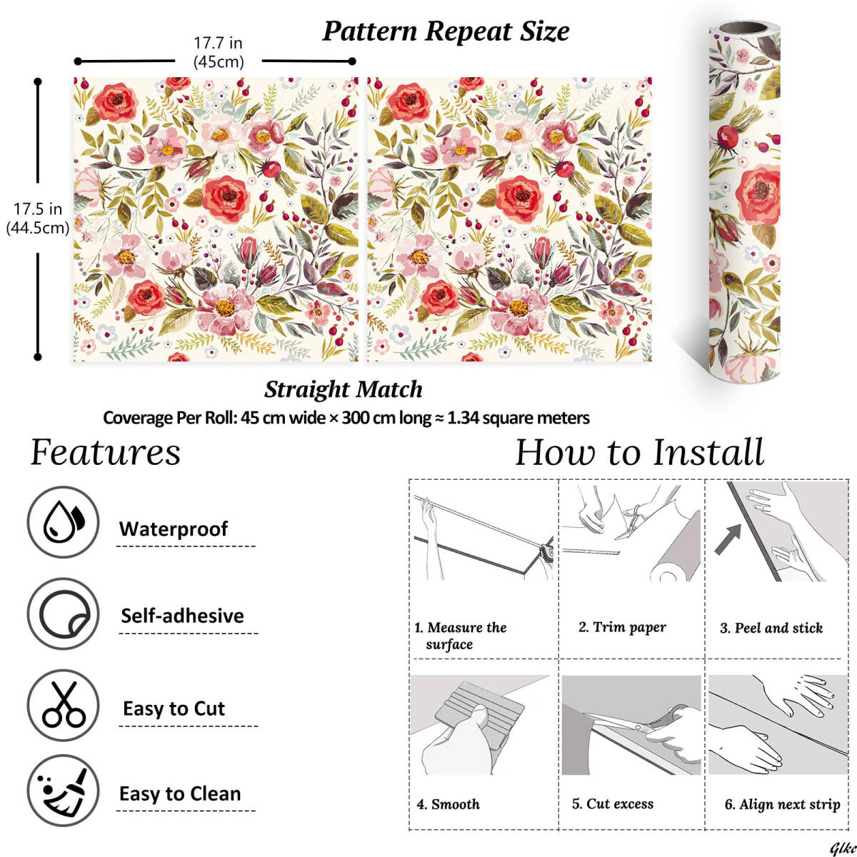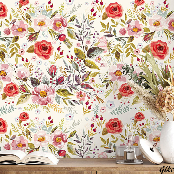 【花柄のデザインが魅力的で、部屋を華やかに装飾できる】壁紙シール 幅44.5cm×長300cm 剥がせる DIY初心者 目盛り付き