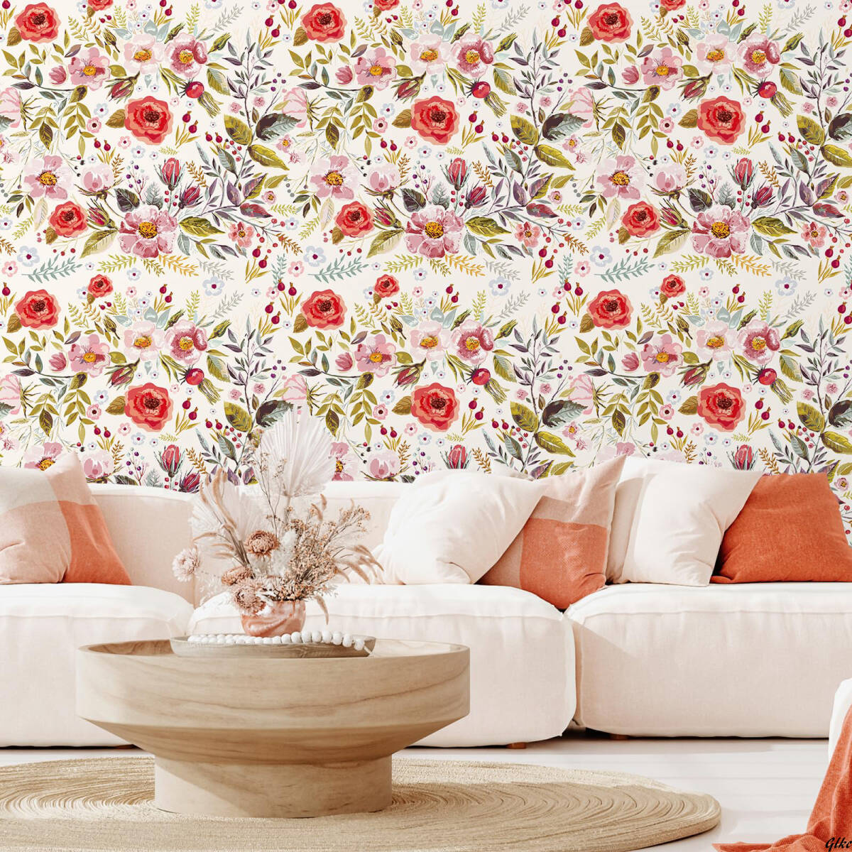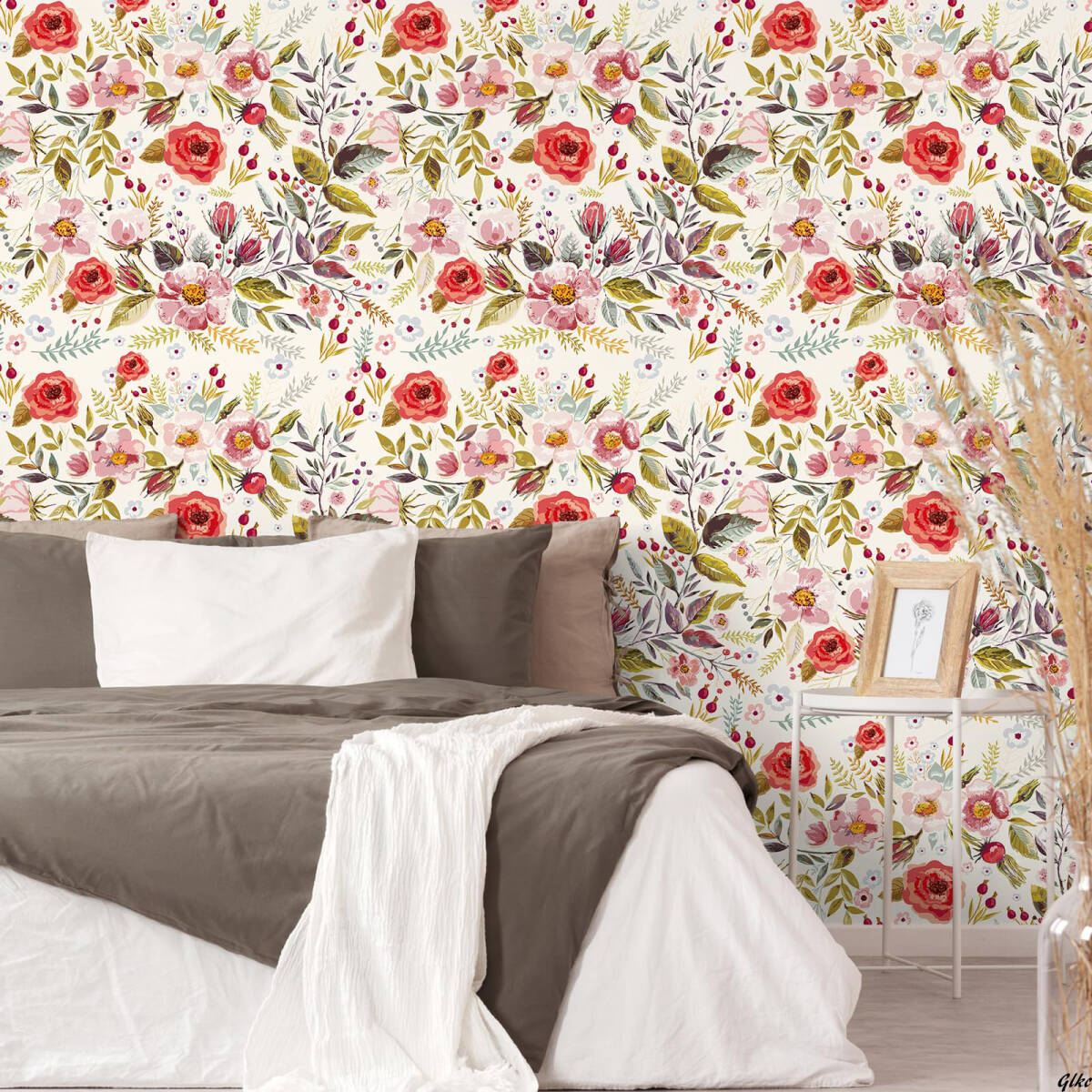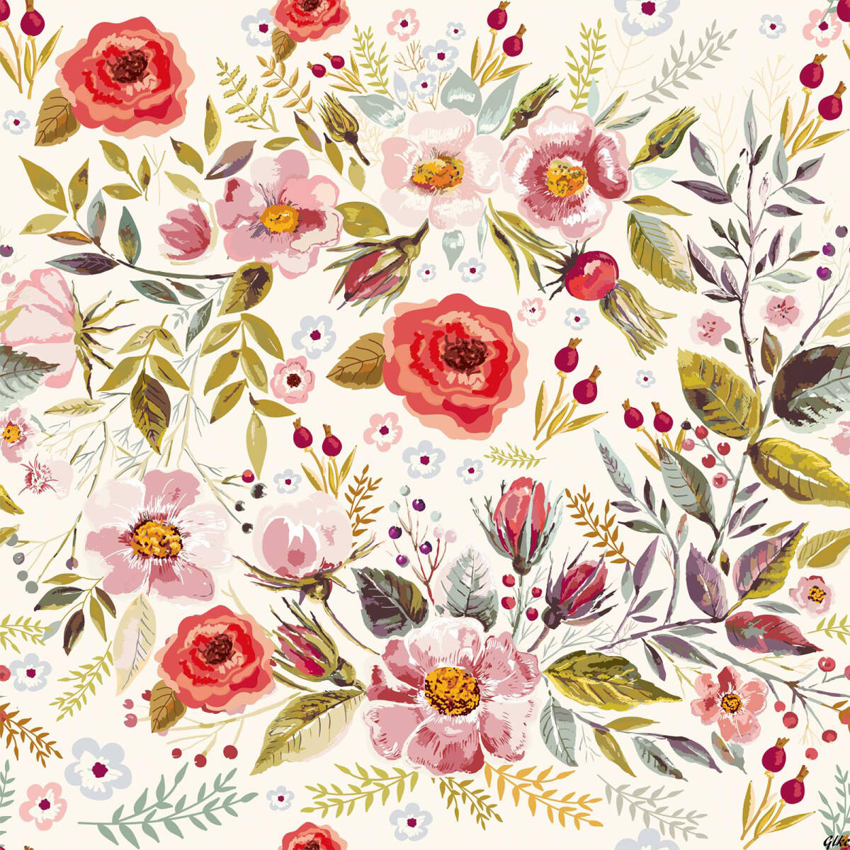 花柄デザインが特徴的で、ベージュを背景にしたピンク、赤、白の花々が華やかに広がります。