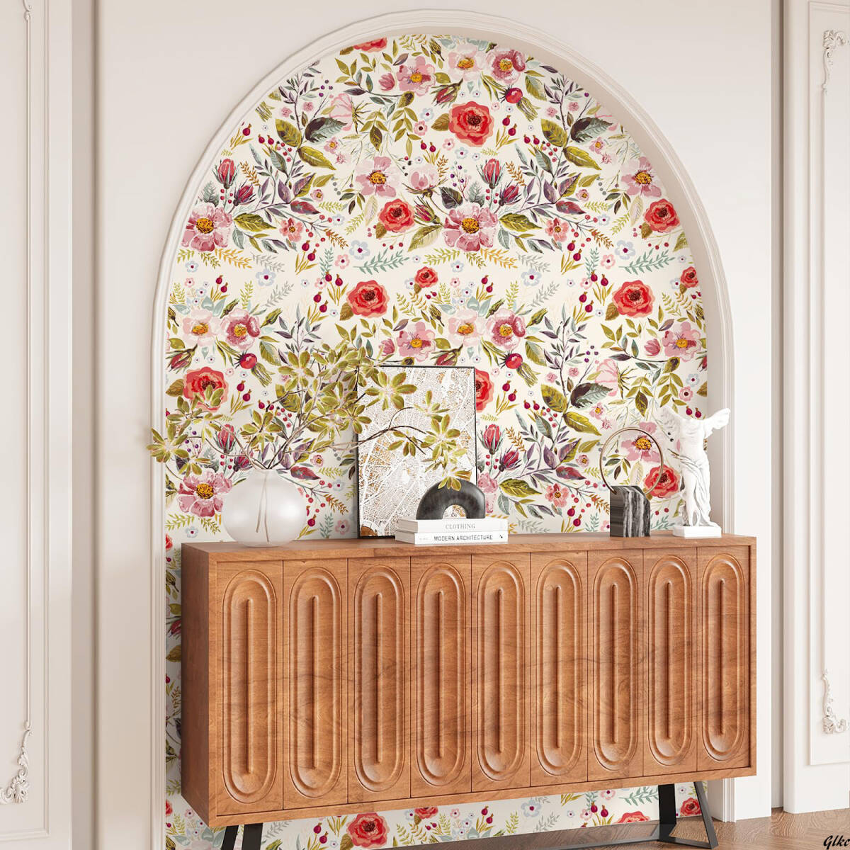 さらに、緑の葉や小さな果実がデザインに取り入れられ、自然で調和の取れた美しい空間を演出します。