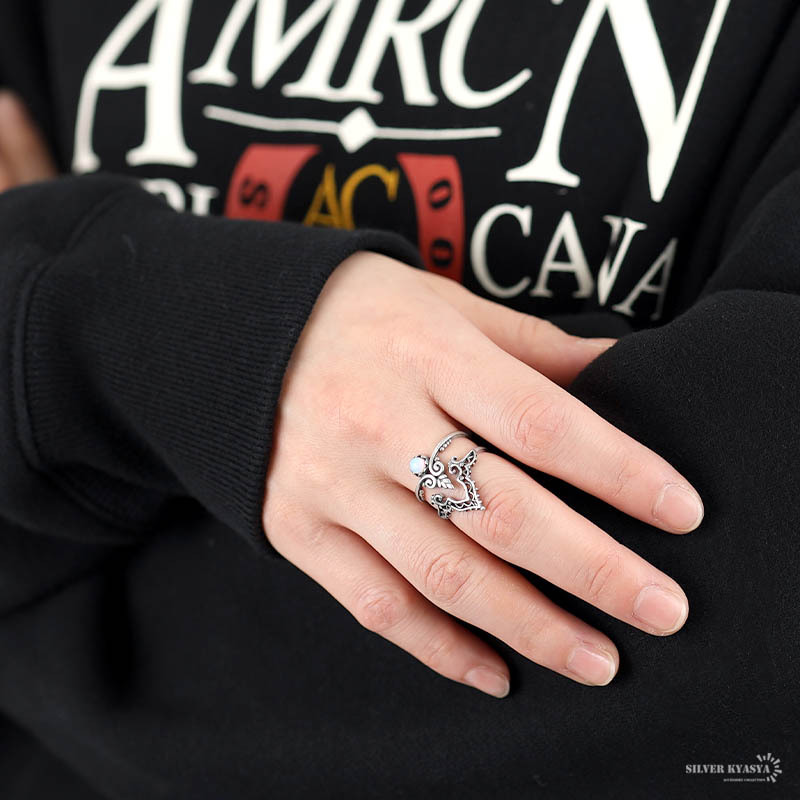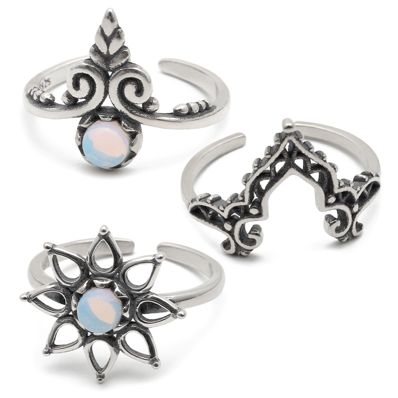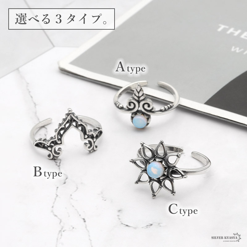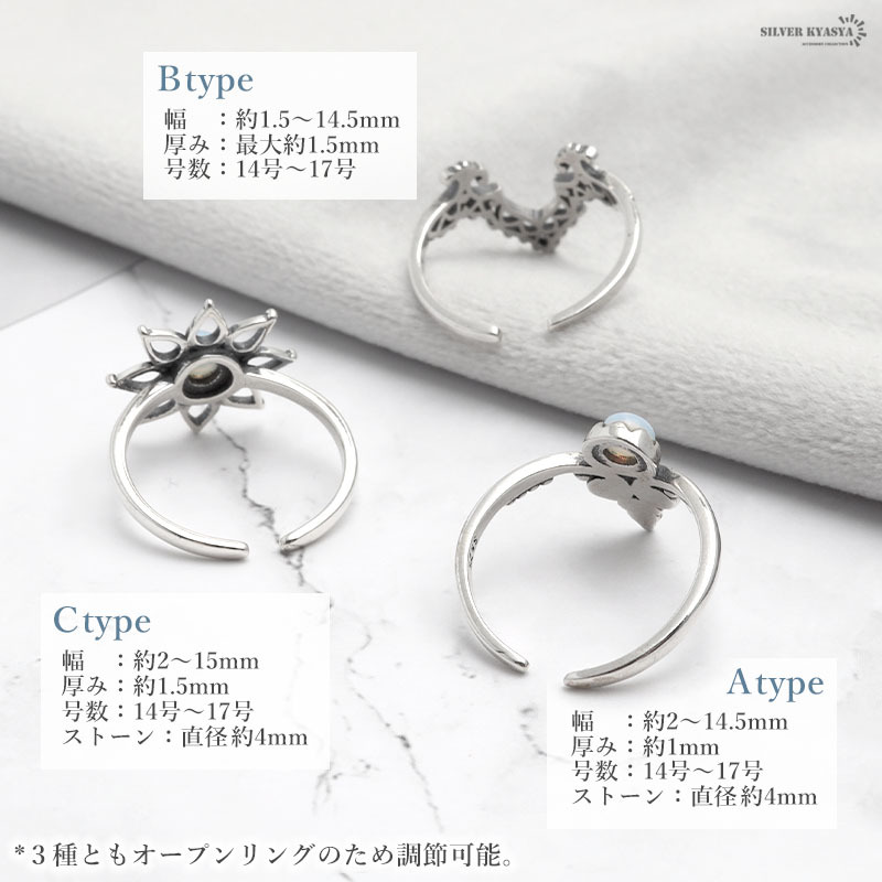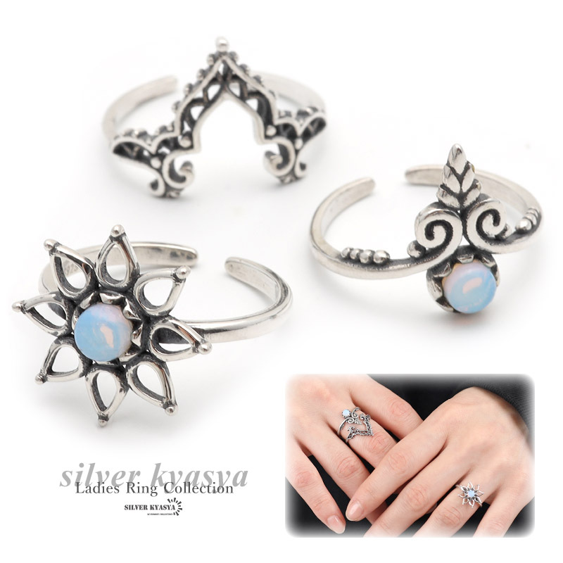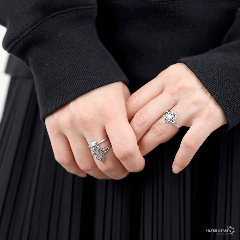 自由なボヘミアンの雰囲気を表現したリング3種。スカイブルーの石が美しいアイテム。単体で着けても、3種集めて重ね付けしても可愛いです。