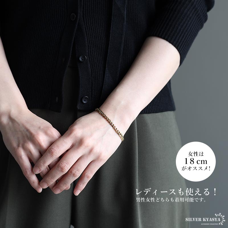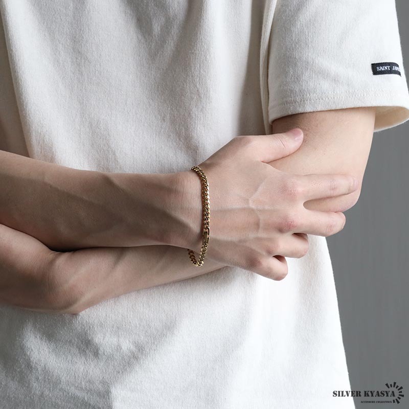 6面カットのコマが輝く喜平チェーンブレスレット。高密度で存在感のある6面カットチェーンは、光を反射しエレガントでこなれ感ある雰囲気を演出します。