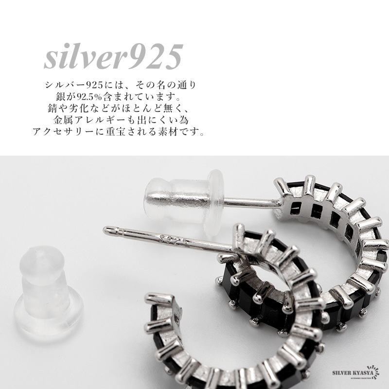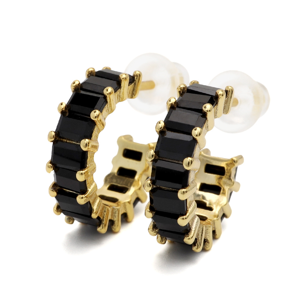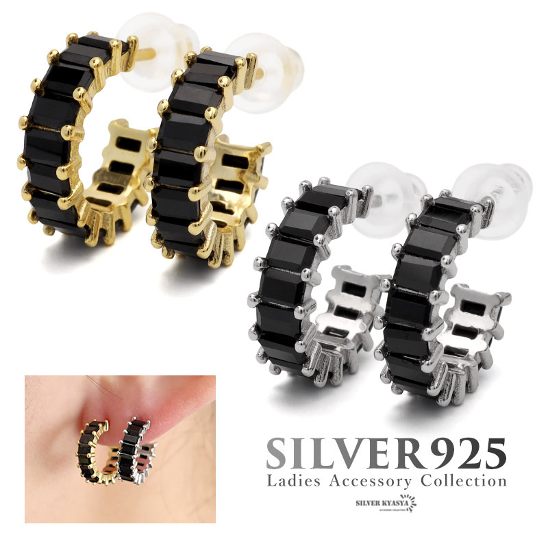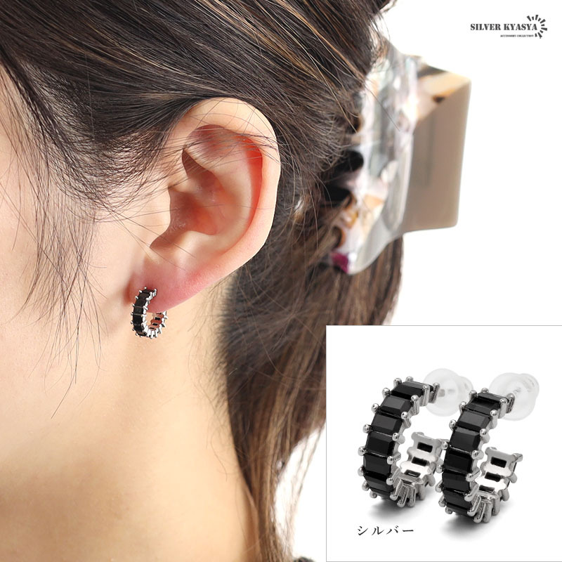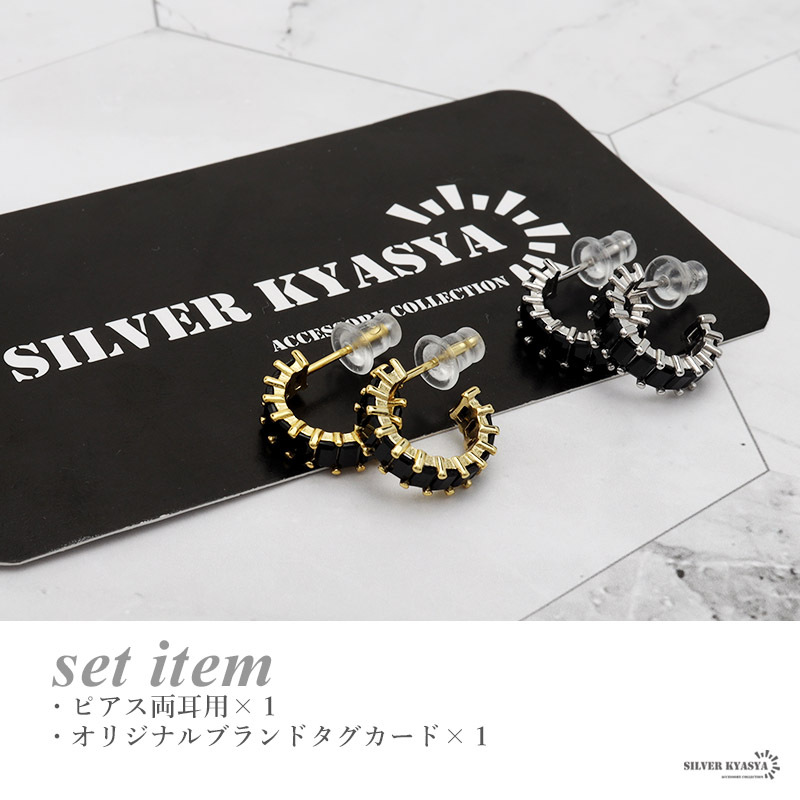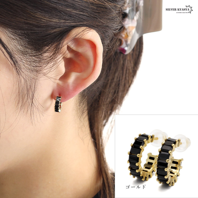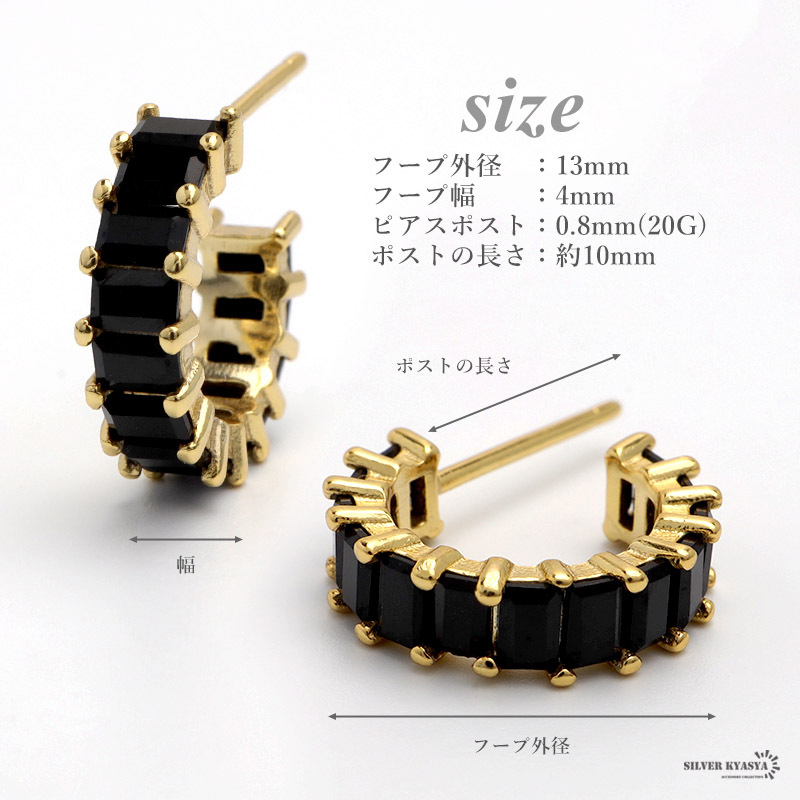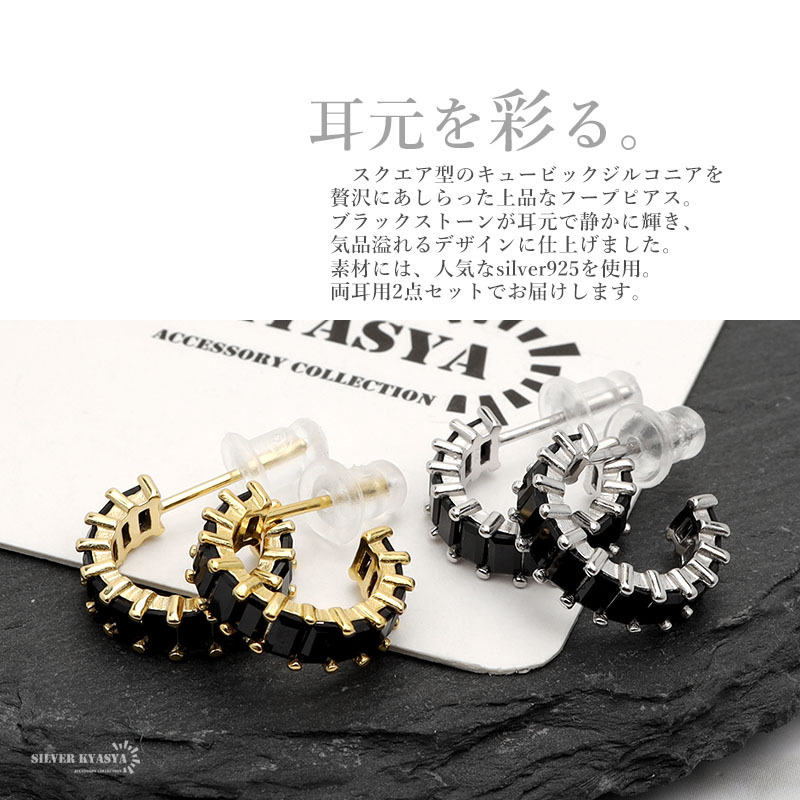 スクエア型のキュービックジルコニアを贅沢にあしらった上品なフープピアス。ブラックストーンが耳元で静かに輝き、気品溢れるデザインに仕上げました。