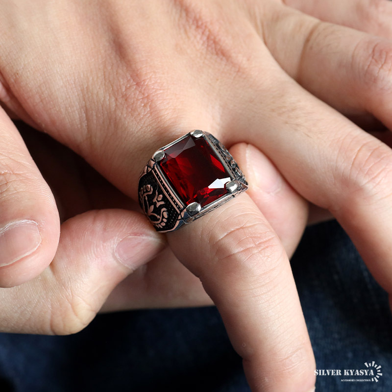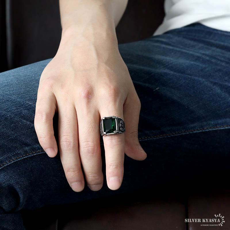 大粒のストーンをセットしたカレッジリング。サイドには雰囲気のある紋章が刻まれています。しっかりとした存在感と重厚感のある仕上がり。