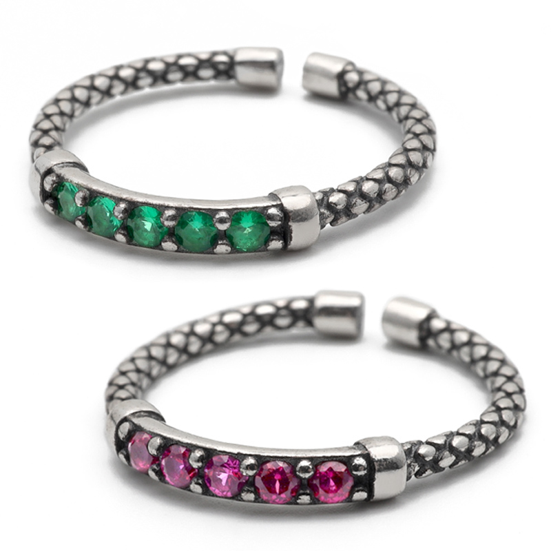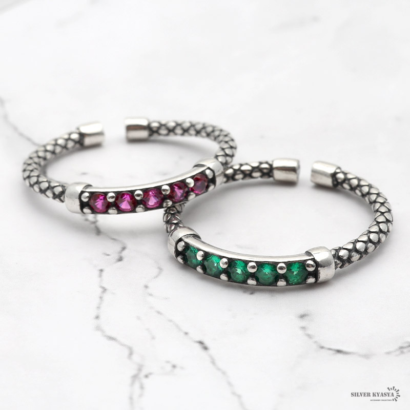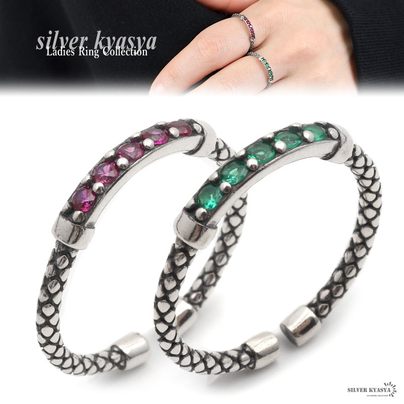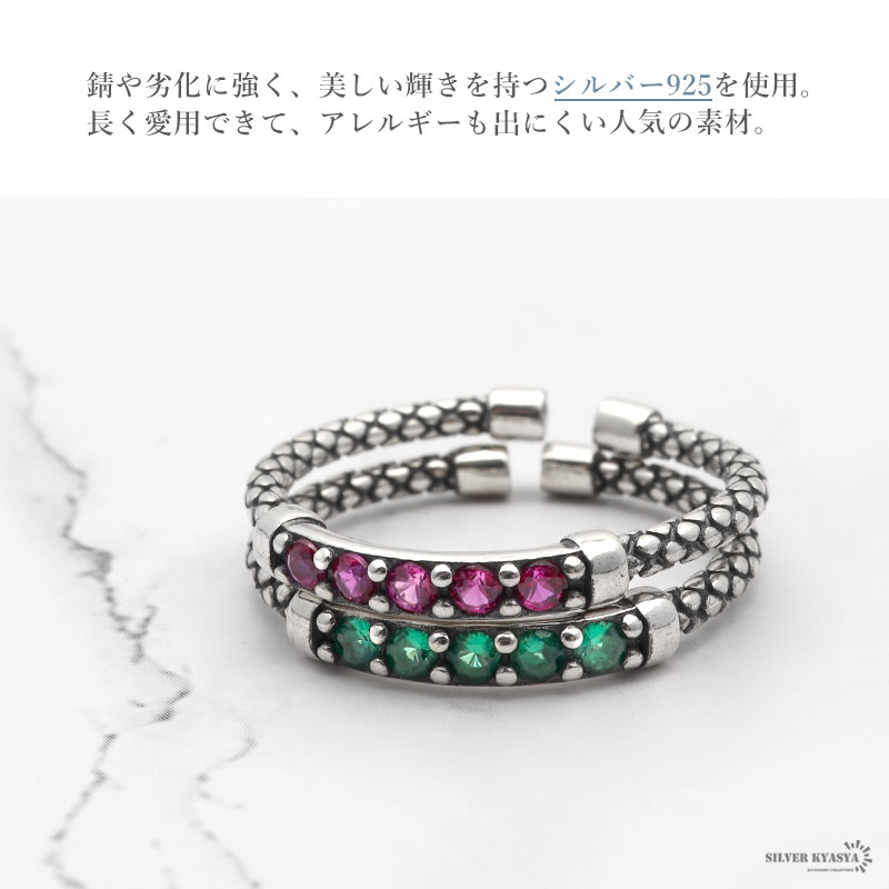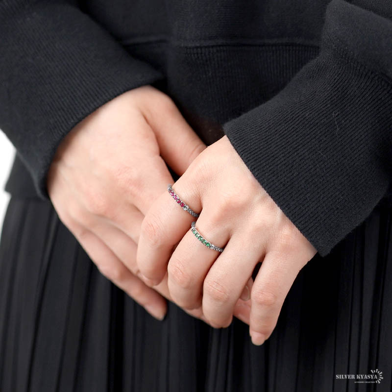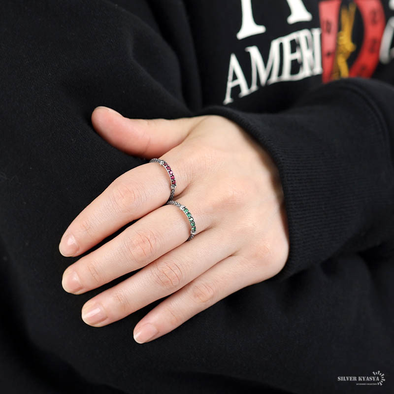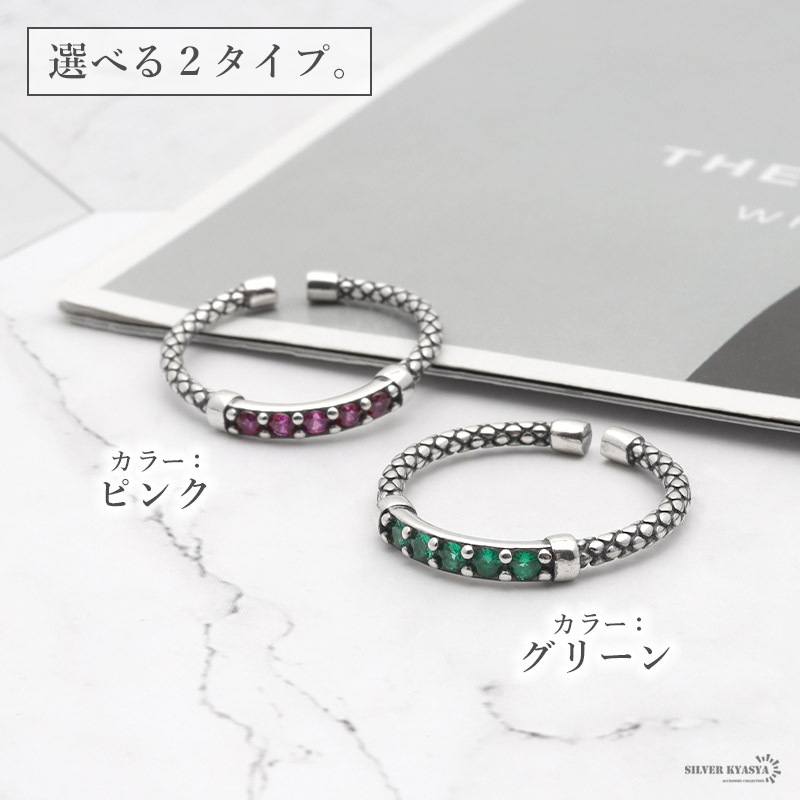 グリーンとピンクのキュービックジルコニアが輝くアイテム。リング部分にラインが彫られていたり、細部まで可愛いデザイン。