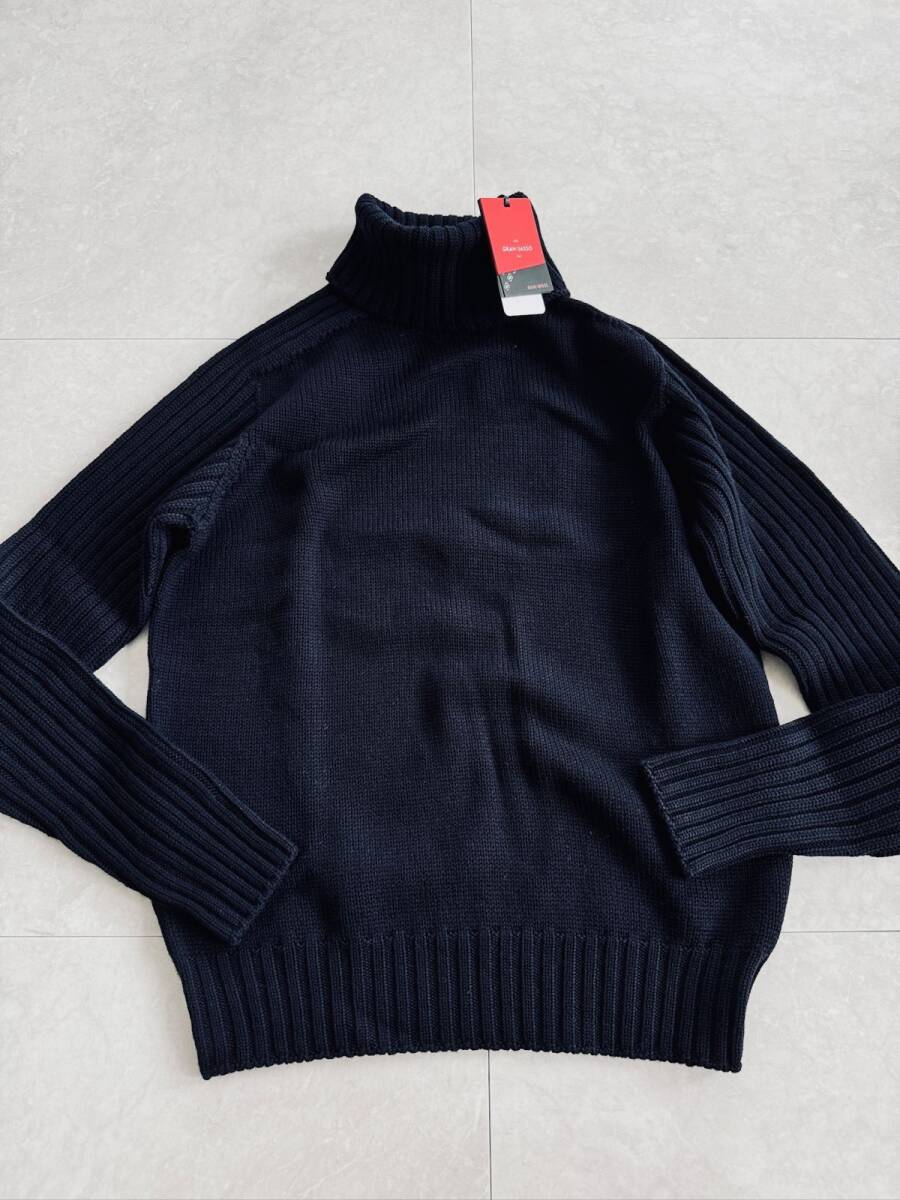 ここ数年、各媒体や各セレクトショップでも目にすることが増えたニット『GranSasso(グランサッソ)』は、1952年イタリア中部の小さな村で作られ創めたニットブランド。 ブランドを認識させるための特徴的なマークやロゴを必要とせず、会社のモットーである“品質が商品を語る”という思いが全てのコレクションの基礎となっています。 リラックステイストを感じられる着こなしが中心となっていることで、愛用者が増えているグランサッソのニットウエア。 Gran Sasso(グランサッソ)が起こした革命かもしれない、ミドルゲージのニット。 オトコのマストアイテムでもあるスタンド型タートルです。 最大の特徴は「RAIN WOOL」レインウールという機能ウールを使用している点。 糸にテフロン加工を施し撥水機能を持たせました。 雨や雪に強いだけでなく 食べこぼしや飲みこぼしにも安心です。 機能素材でありながら色や風合い、通気性は保たれており着心地は上質そのもの。 見た目よりも軽いのも特徴で、気軽に羽織れ合わせもしやすいので、この冬のヘビロテアウターになります。 地厚な雰囲気でフィニッシュするミドルゲージは、ボリューム感に溢れ、リュクスな雰囲気を演出します。 ケーブル編みが施され、起毛感があったり素材の風合いにウォーム感が出やすい秋冬アウターとの相性が良く、季節的に違和感のないスタイルを楽しむことが出来るニットに仕上がっています。 ブランド:GRAN SASSO / グランサッソ 素材:ラナヴァージンウール100% サイズ:54 着丈:64cm 袖丈:ラグラン 肩幅:ラグラン 身幅:59cm 裄丈:85cm ※実寸値となりますが誤差はご了承ください。 ※迅速なお取引を心がけさせていただいております。オークション終了より24時間以内にご連絡をいただけない場合、土日祝日を除き48時間以内にお支払い手続きをいただけない場合は、お取引の意思なしと判断させていただき取引キャンセルとさせていただきます。 万が一上記が不可の場合は事前にご連絡いただくか、入札をお控えいただきますようお願い申し上げます。 ※なるべく現物に近いお色味で撮影するよう心掛けておりますが、閲覧環境の違い等によって違いが出る場合があります。 差し替えトラブルを避ける意味でも上述した旨含め、イメージと違う等での返品は受け付けておりません。 百貨店並みのサービスを求める方や神経質な方の入札はお控えいただきますようお願い申し上げます。 また、差替えやSNS使用後の返品等を防止するためためにも、原則返品には応じられません。 疑問点や心配事等がある場合は入札前に質問欄にてお問い合わせください。 ※当方が出品するすべての商品は間違いなく本物ブランド品となりますので、安心してオークションにご参加ください。 万が一、第三者等により偽物と判断された場合、商品の返品、お支払いただきました全額を返金をいたします。  |