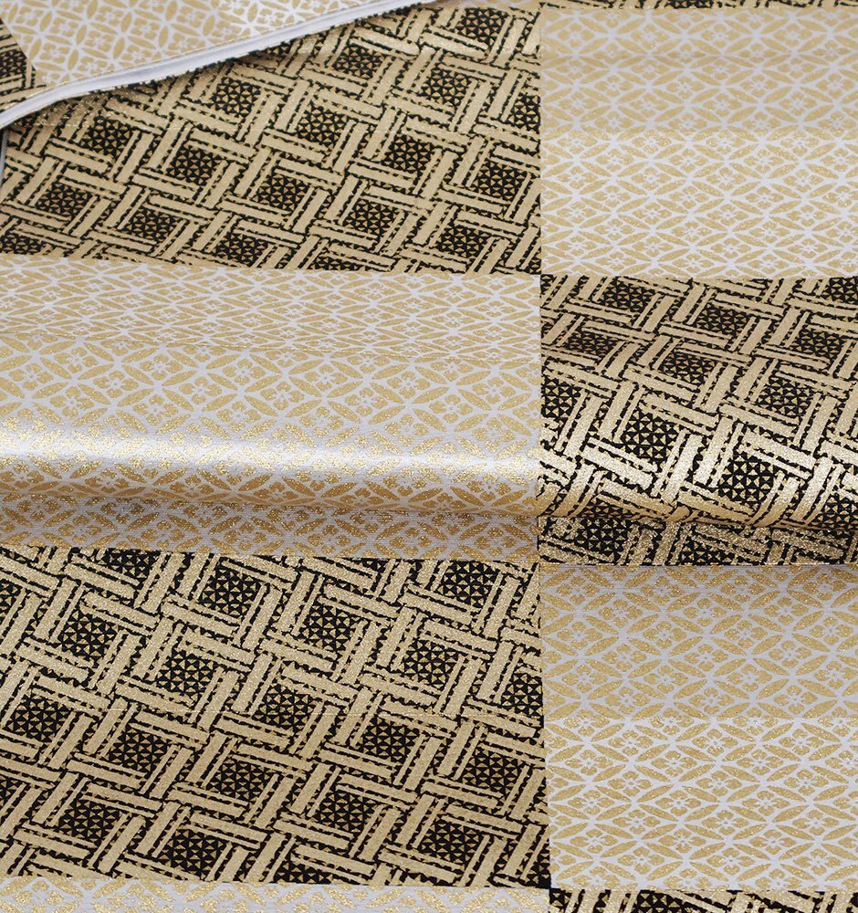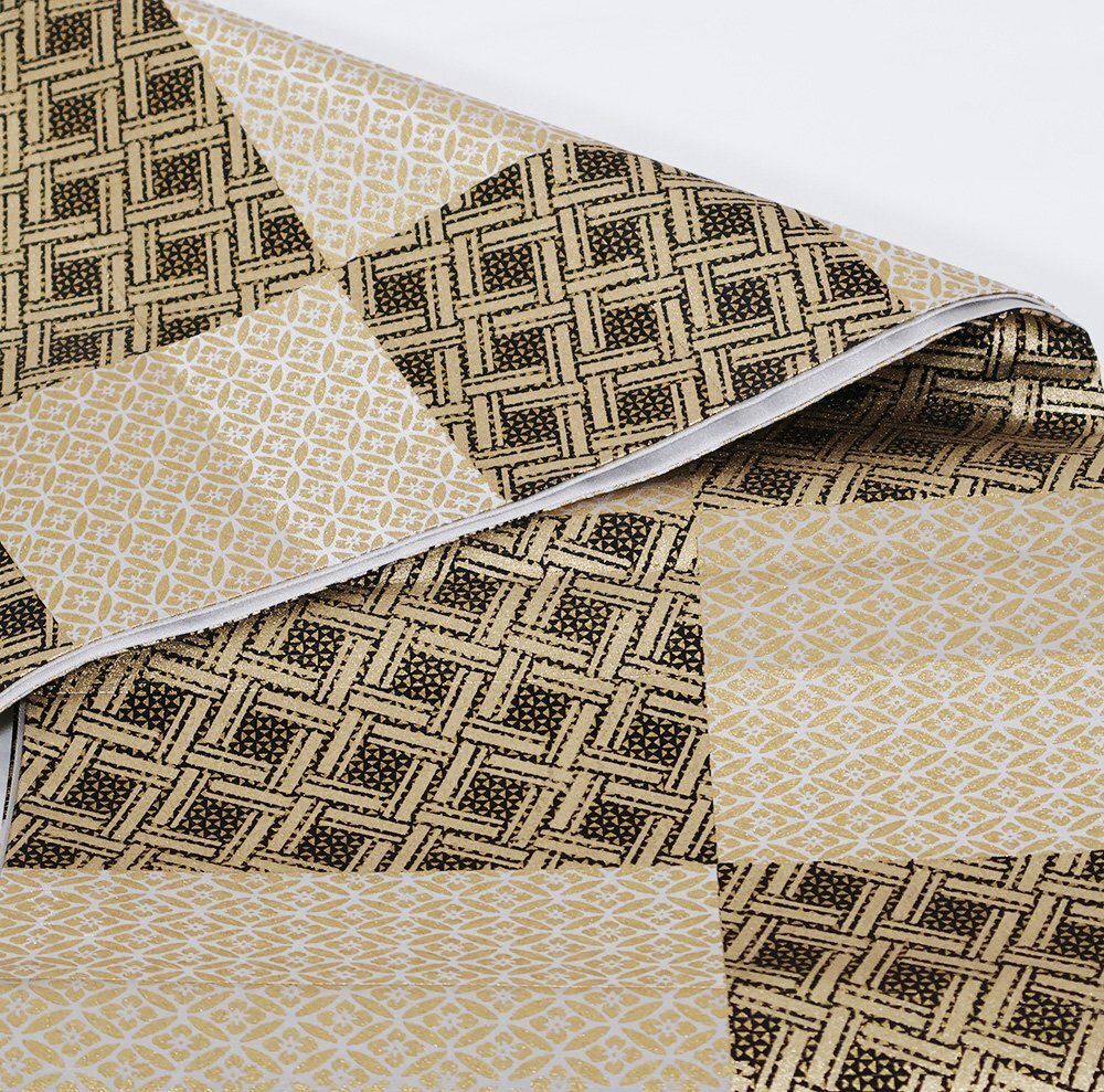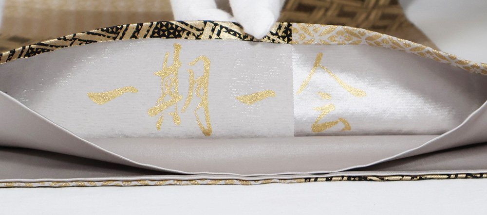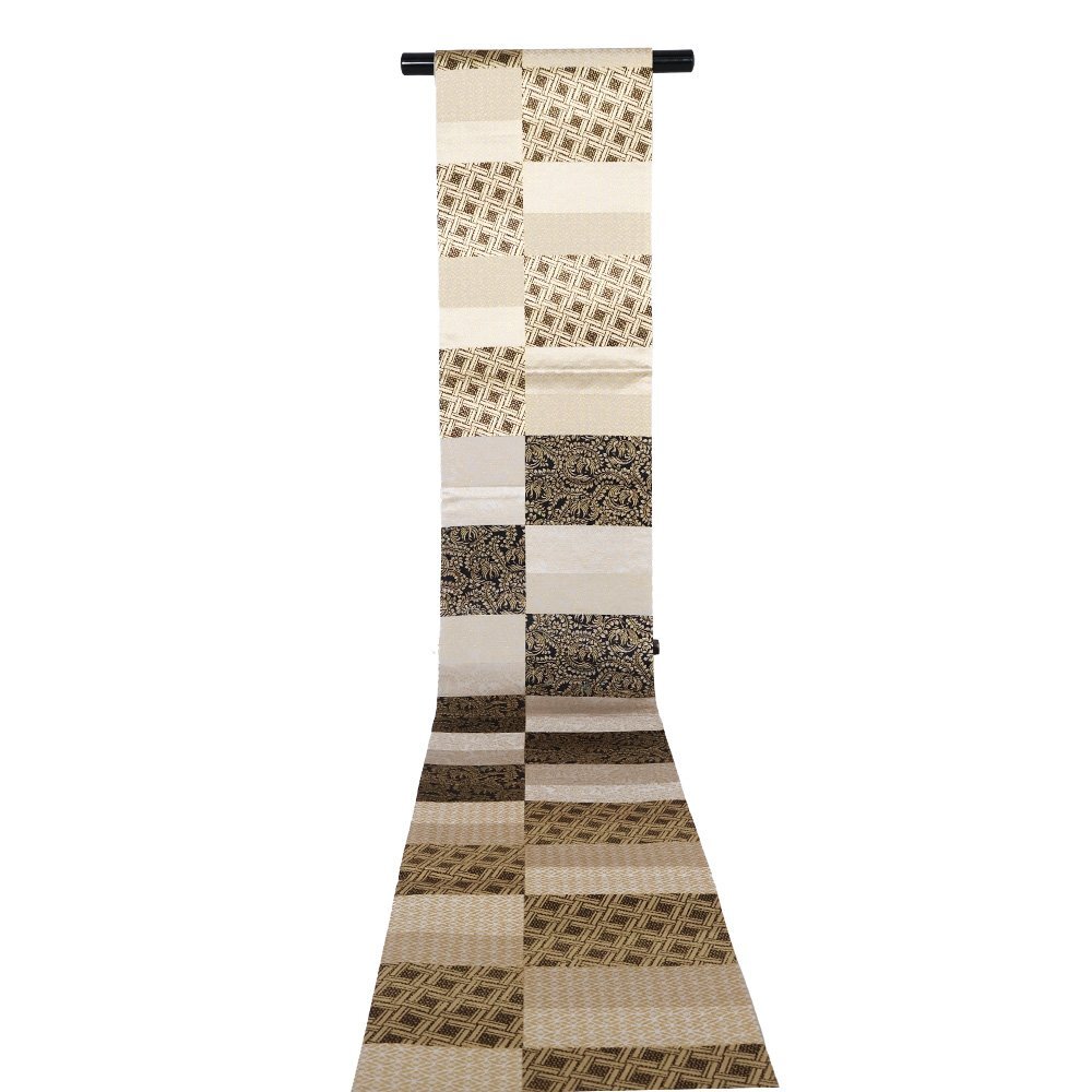 | 出蔵善之助 一期一会 西陣織袋帯 金箔・ベージュ・黒地 七宝文・網代文 未使用品 仕立て上がり |