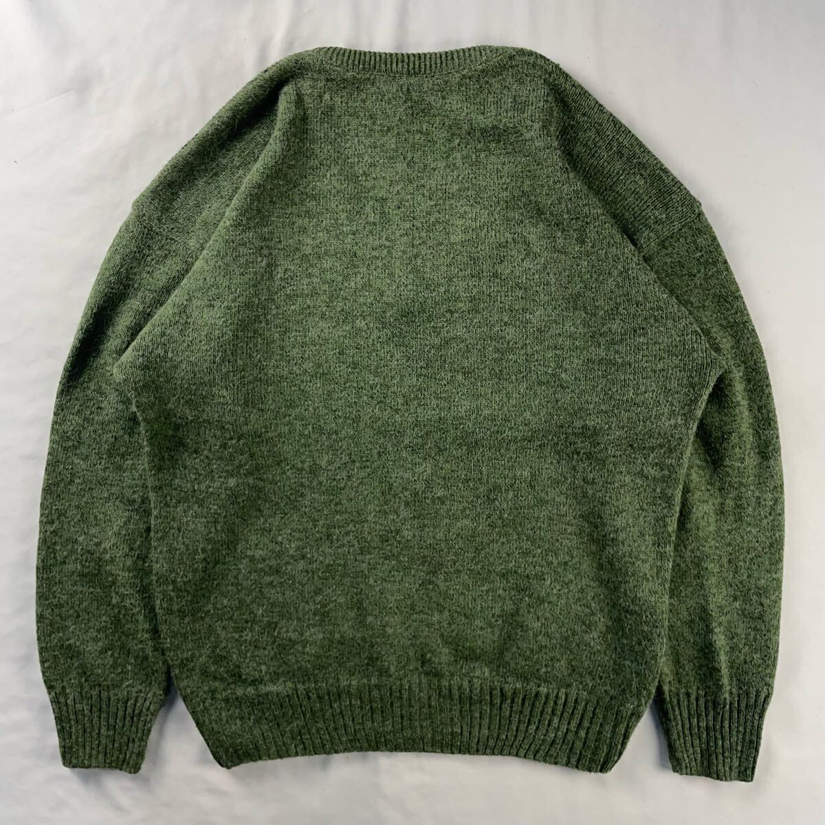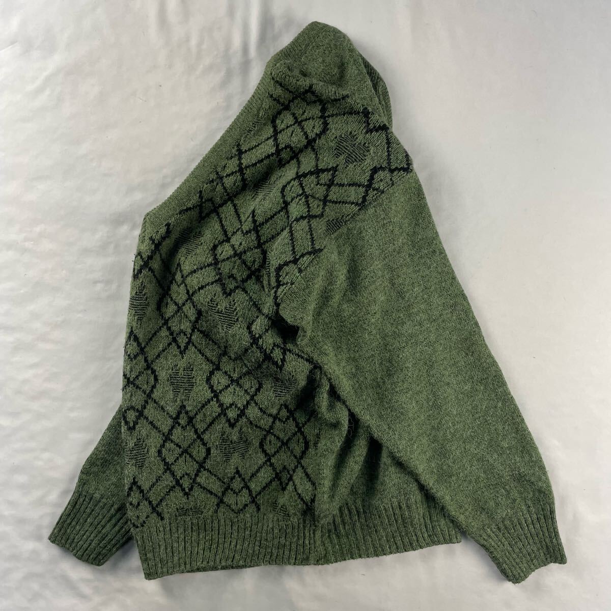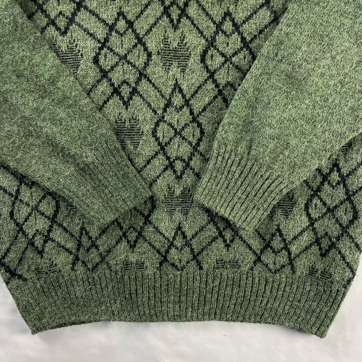 ポイント: 秋冬にぴったりな柔らかく若干シャギーなアクリルベースにポリアミド(ナイロン)混素材、ユーロな雰囲気のVネックに抜群のカラーリングの濃淡のある渋いメランジカラーのグリーン、幾何学模様のようなアートパターンとポイントの立体的なパターンが総柄で施された素敵な1枚です。
