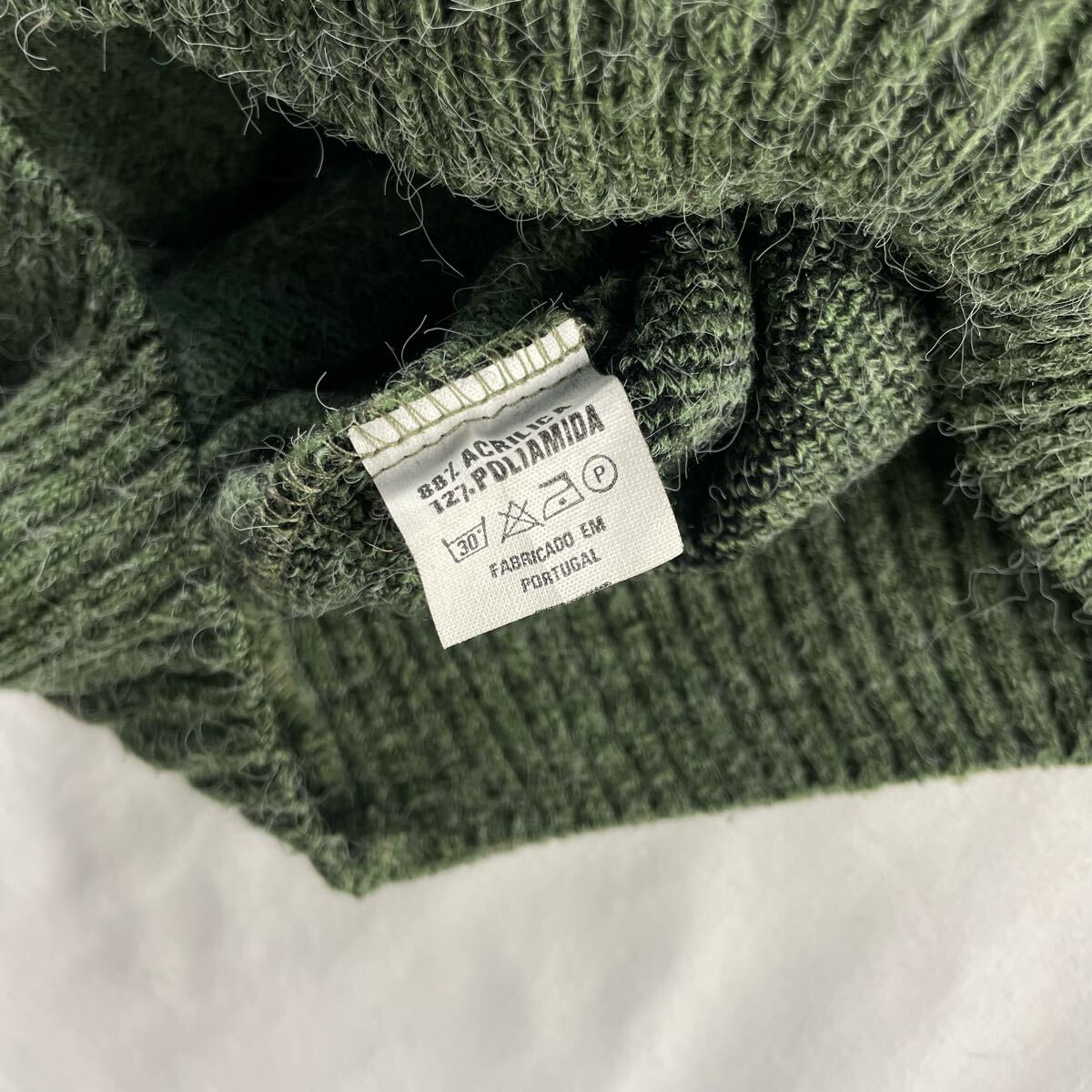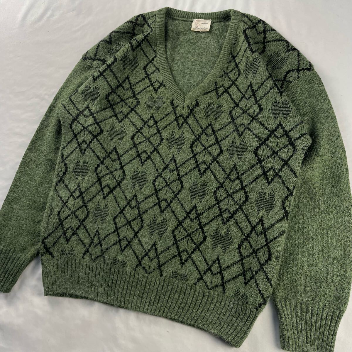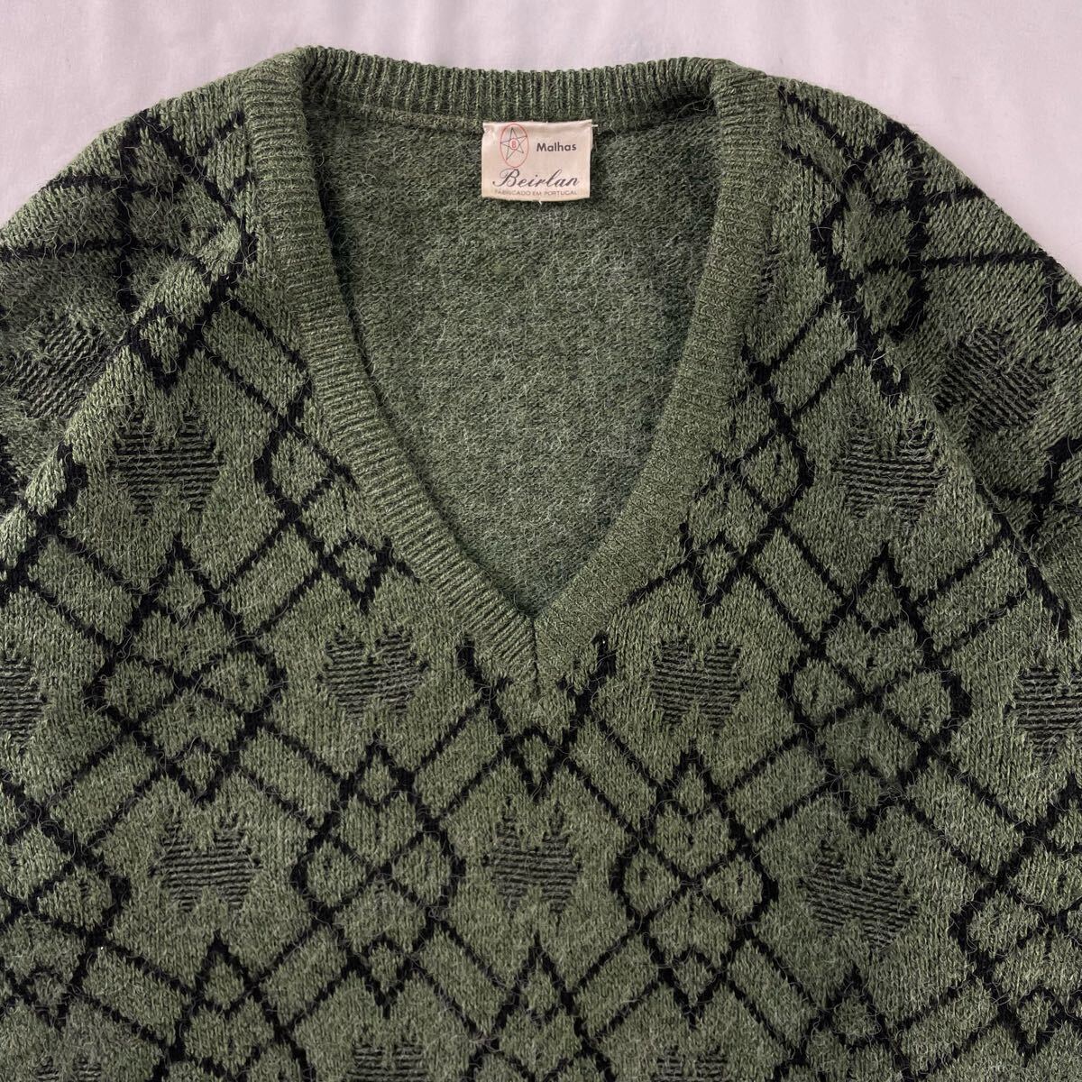 Euro Vintage ポルトガル製 80s Malhas Beirlan アクリル88% ナイロン12% Vネック 好配色 シャギー 立体 3D 幾何学模様 アート メランジ グリーン 総柄 デザインニット