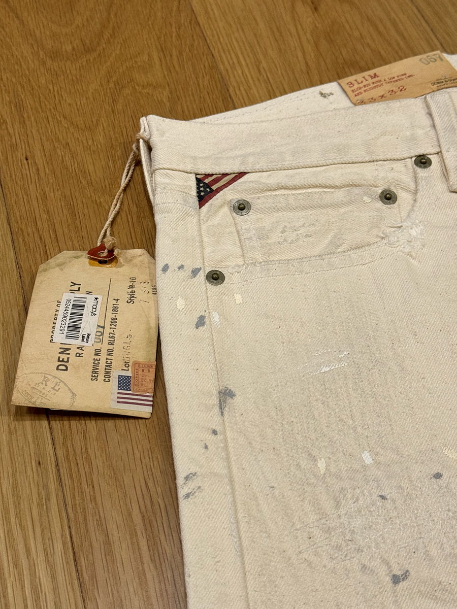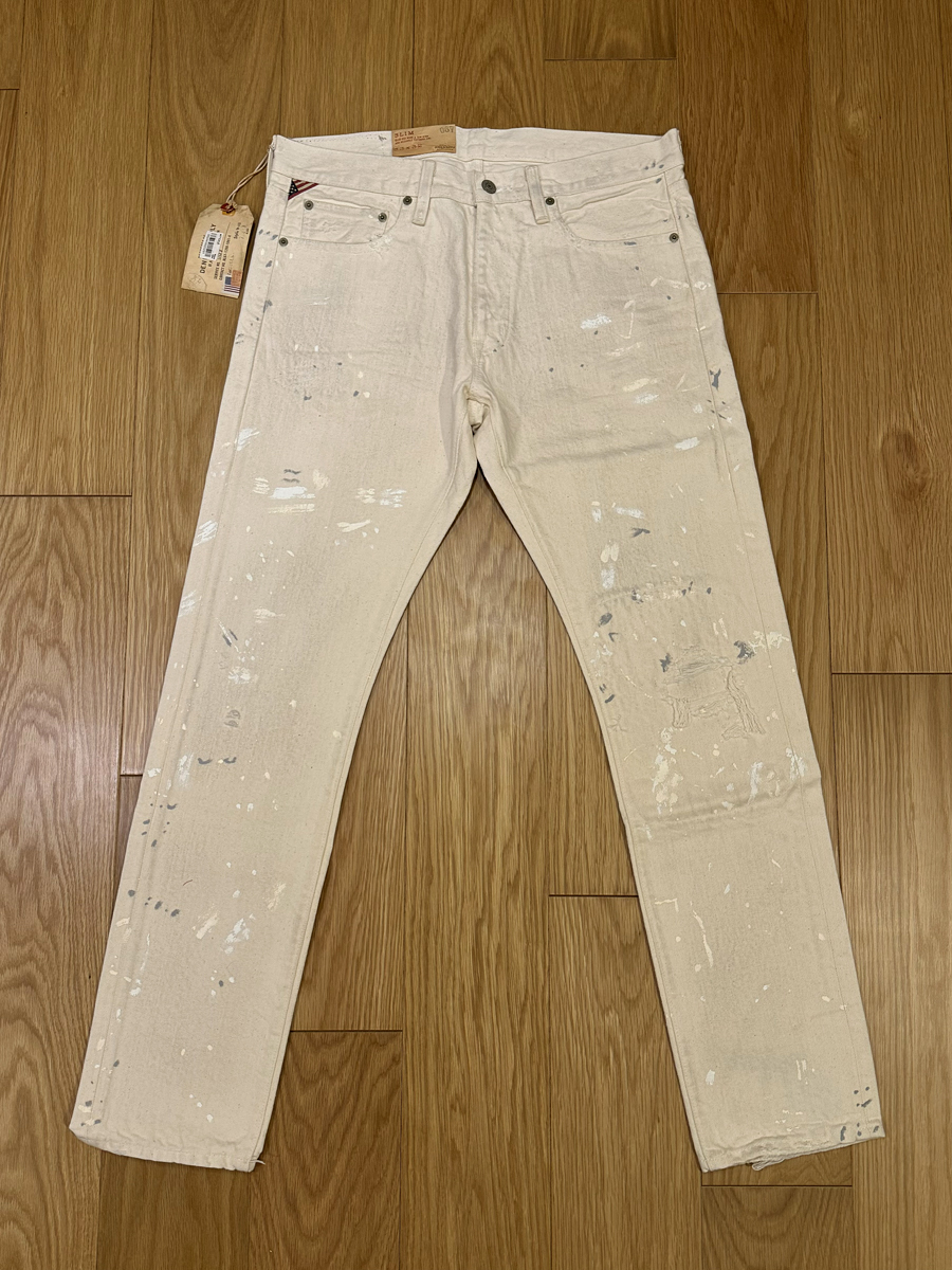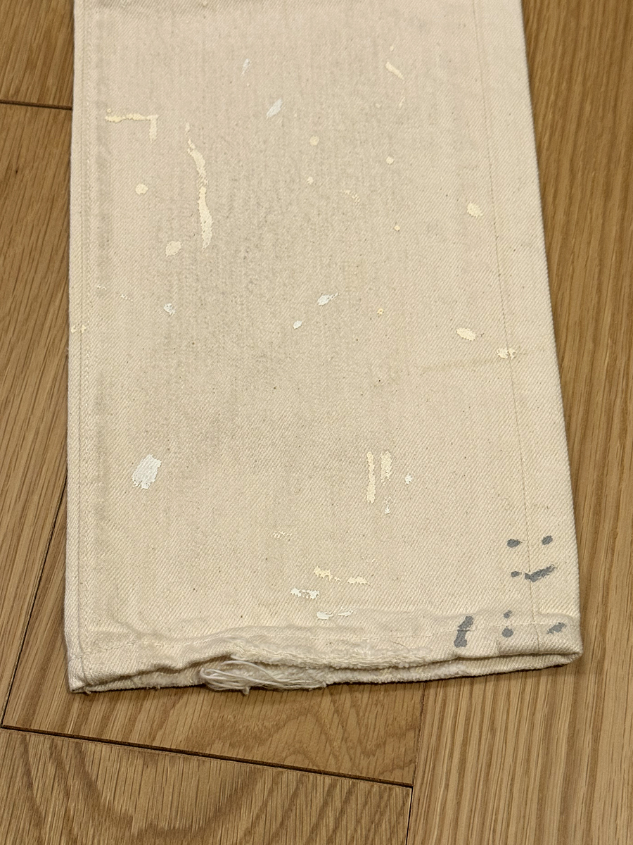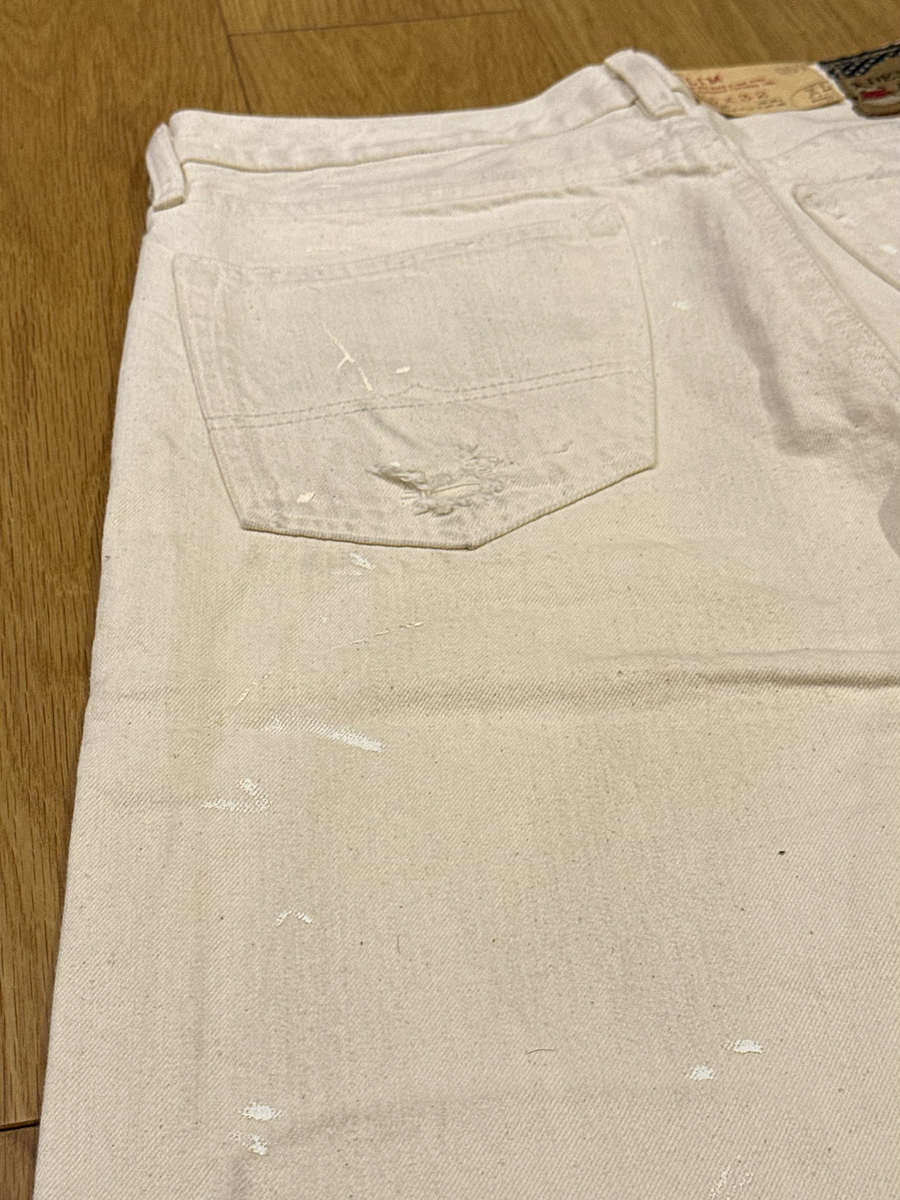 元々きつめのヴィンテージ加工品になりますが、ホワイトデニムの店頭在庫品購入品になりますので画像のように多少のくすみや薄汚れのような箇所もございましてどこまでが元々の加工か正確には分かりかねますのでご理解ご了承頂けます方のみご入札くださいませ。