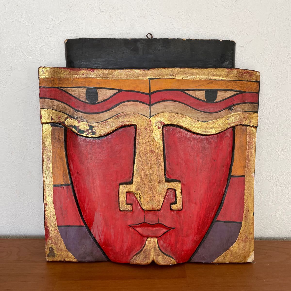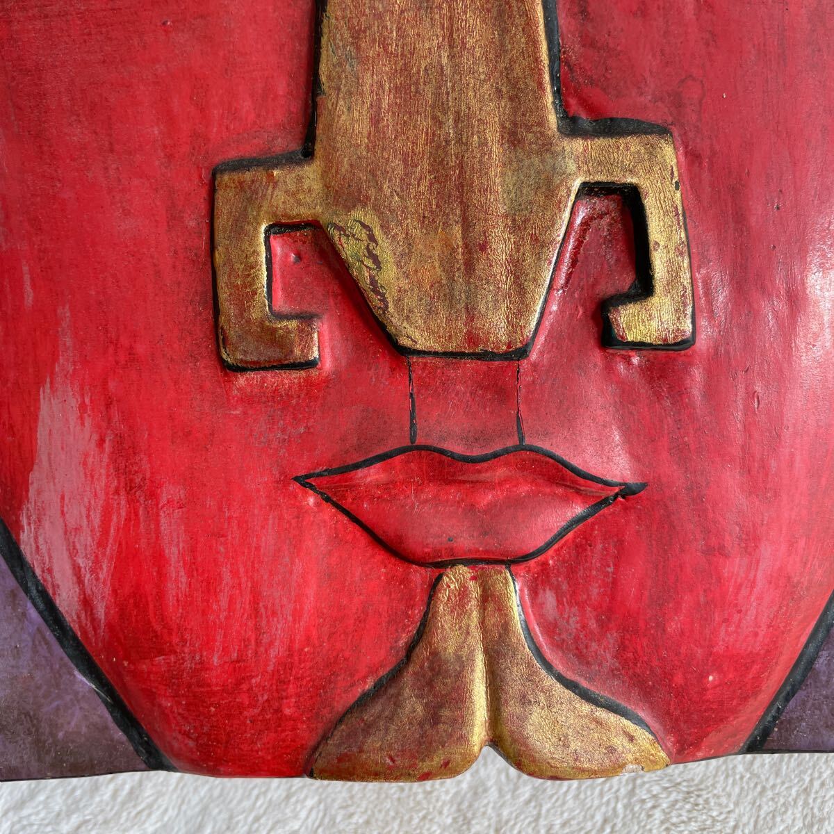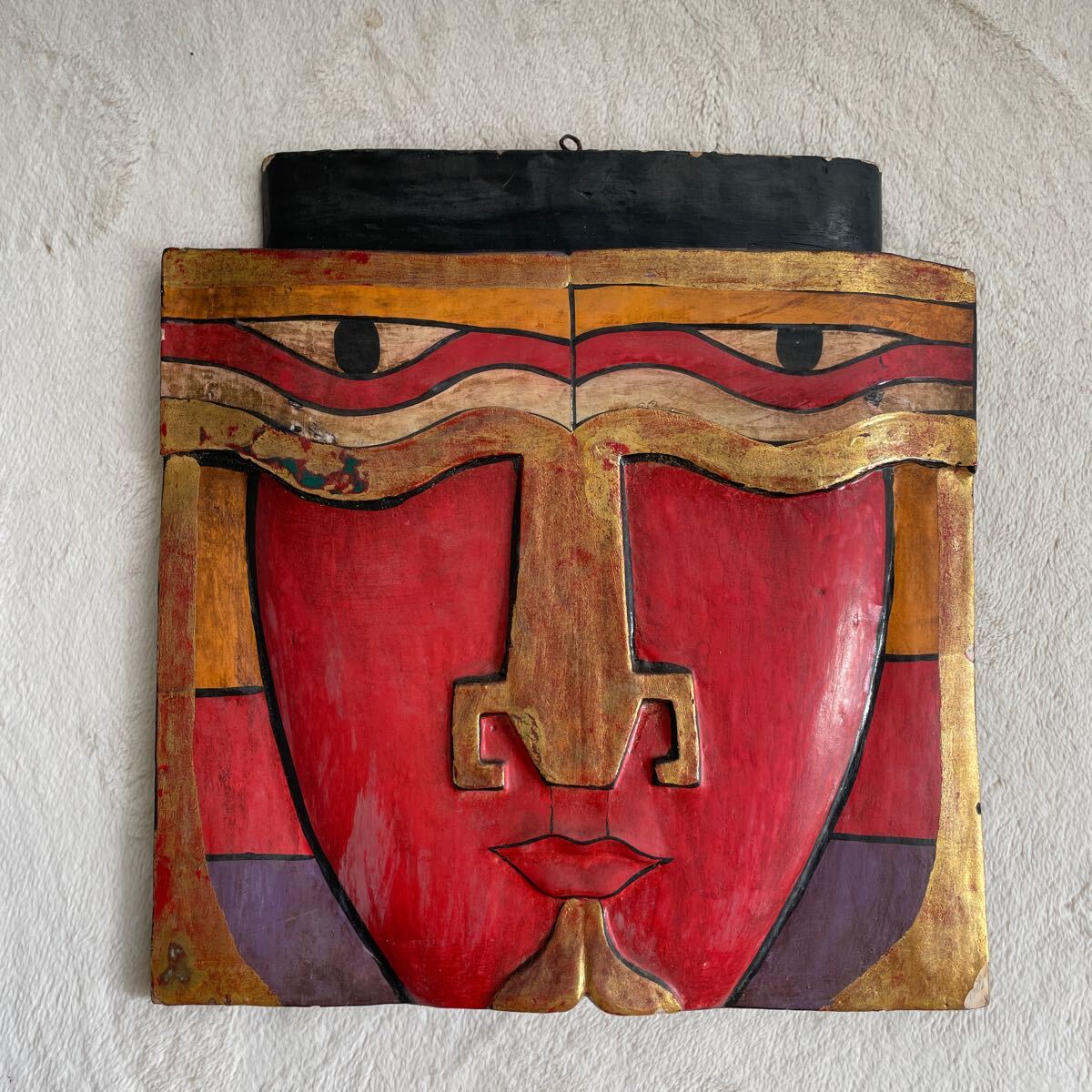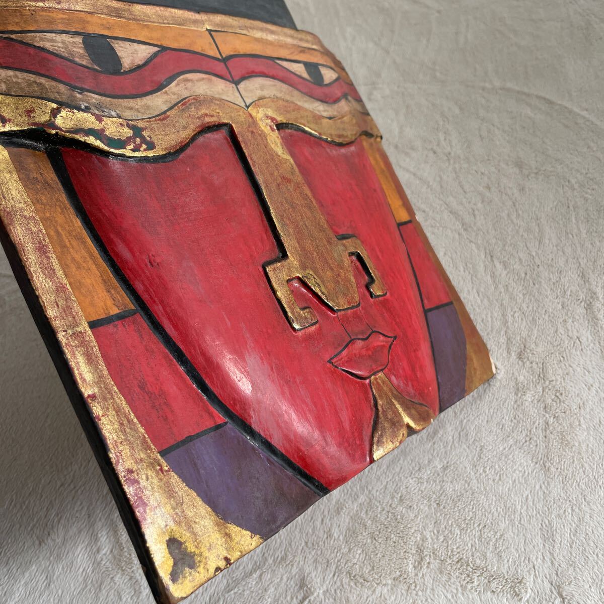 こちらはインドネシアの職人による木彫りマスクの壁掛けアートです。手彫りとハンドペイントによる鮮やかなデザインが特徴で、エスニックな雰囲気を演出します。お部屋のアクセントやコレクションにも最適です。ヴィンテージ品のため多少の使用感がありますが、全体的に良好な状態です。ぜひこの機会にいかがでしょうか?ご質問があればお気軽にどうぞ!