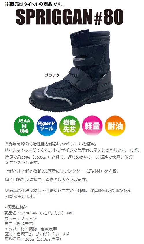 日進ゴムNISSHIN RUBBER滑らない作業靴を追求したハイパーVソール搭載SPRIGGAN #80 ブラックサイズ:25.0cm■特長世界最高峰の防滑性能を誇るHyper Vソールを搭載。ハイカット&マジックベルトデザインで着用者の足をしっかりとホールド。片足で約360g(26.0cm)と軽く、返りの良いソール構造で快適な作業をアシストします。上部ベルト部と後部の2箇所にリフレクター(反射材)を内蔵。履き口筒部は袋状で、異物の混入を防ぎます。■商品仕様・商品名:SPRIGGAN(スプリガン) #80・カラー:ブラック・先芯:樹脂先芯・アッパー材:編物、合成皮革・底材:合成ゴム(ハイパーVソール)・平均重量:360g(26.0cm片足)