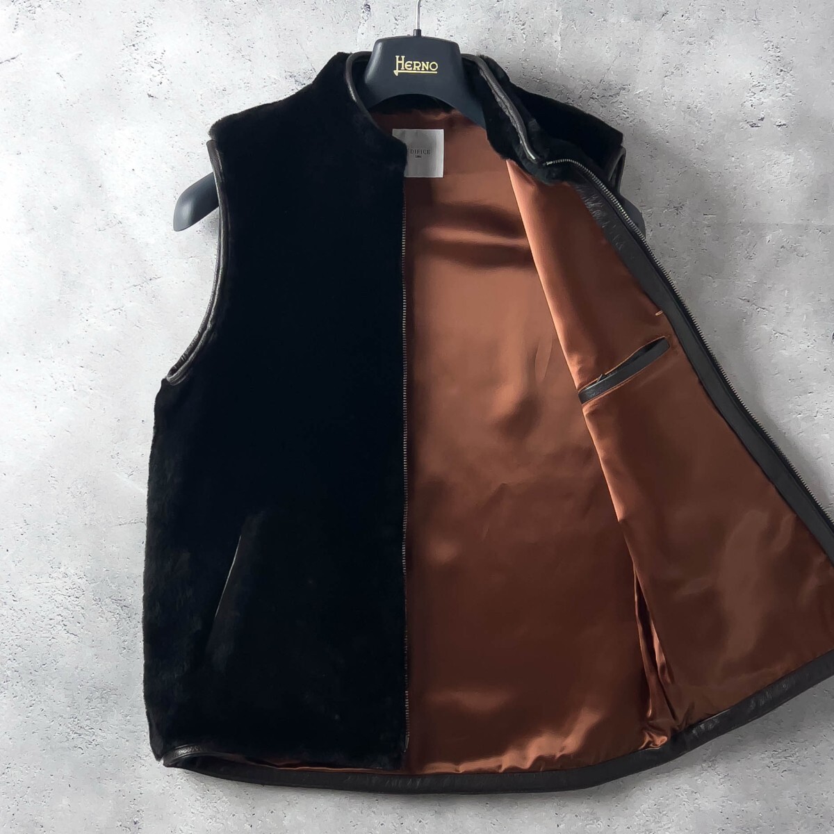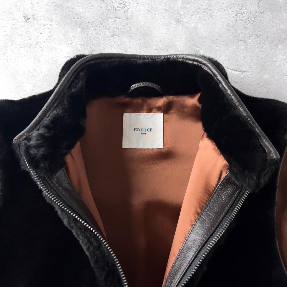 ◆上質なシープスキンを使用したEDIFICE(エディフィス)の最高級ムートンベスト。柔らかくしなやかな羊革が高級感を演出し、裏地には滑らかなキュプラを採用。