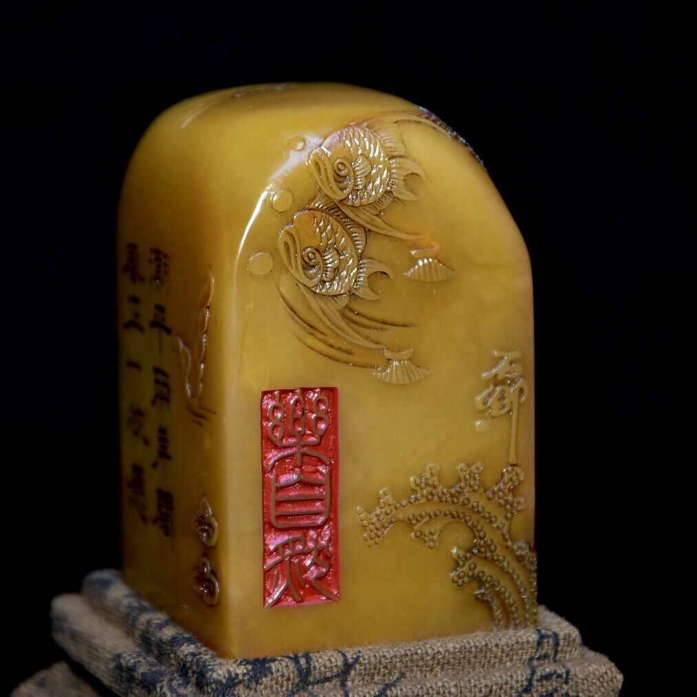 【瓏】寿山石 田黄石彫 双魚印章 清代 石卿作 極細工 手彫り 置物擺件 中国古賞物 古美術 蔵出