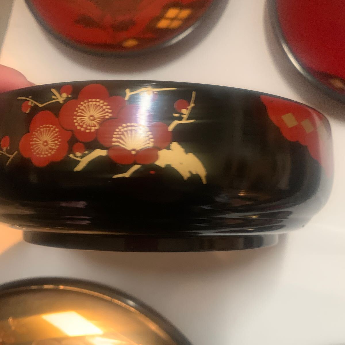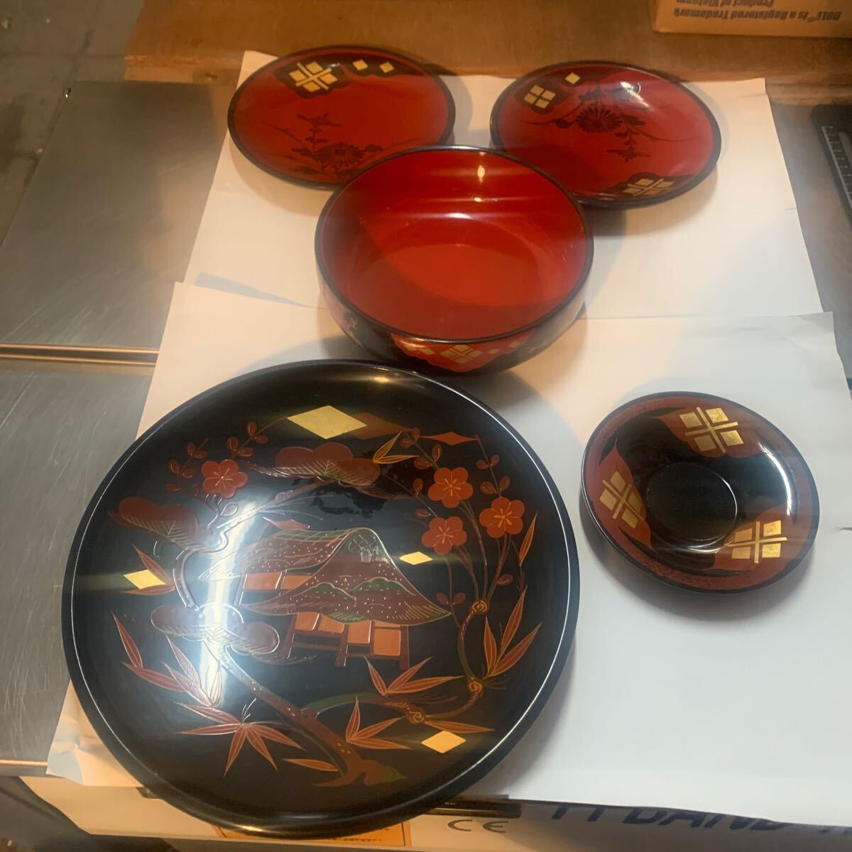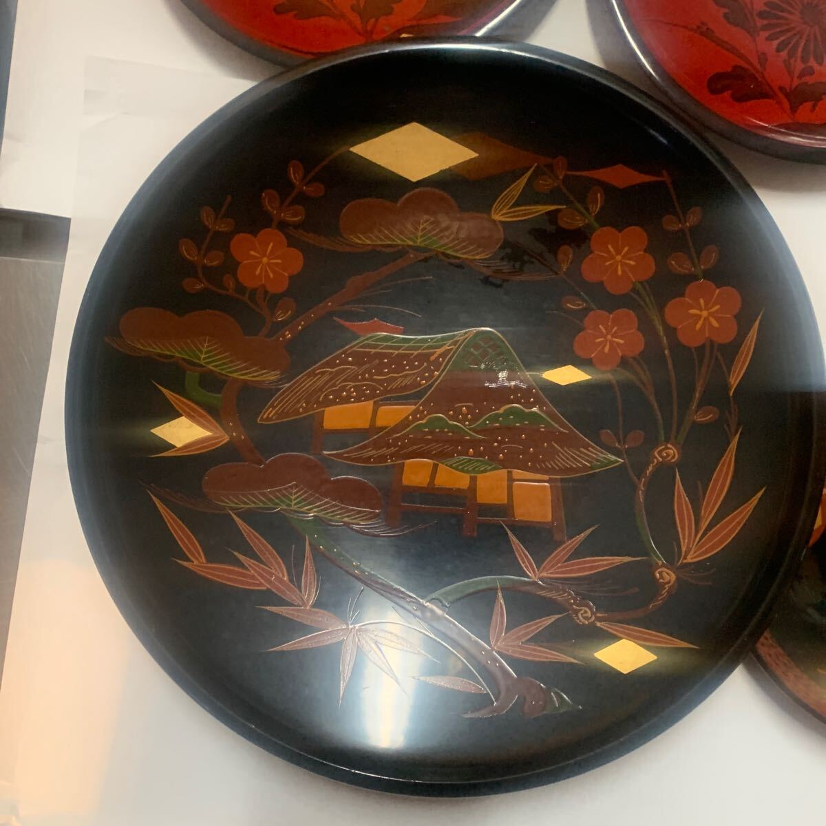 秀衡塗りの菓子器になります。大きい絵皿直径約25センチ中位の皿直径17センチ直径13センチ菓子入れ直契約18セン高さ5センチ木製になります。ノークレームノーリターンでお願いします。長期保存品になりますので、多少の汚れ傷等があります。ご理解の上ご入札ください。