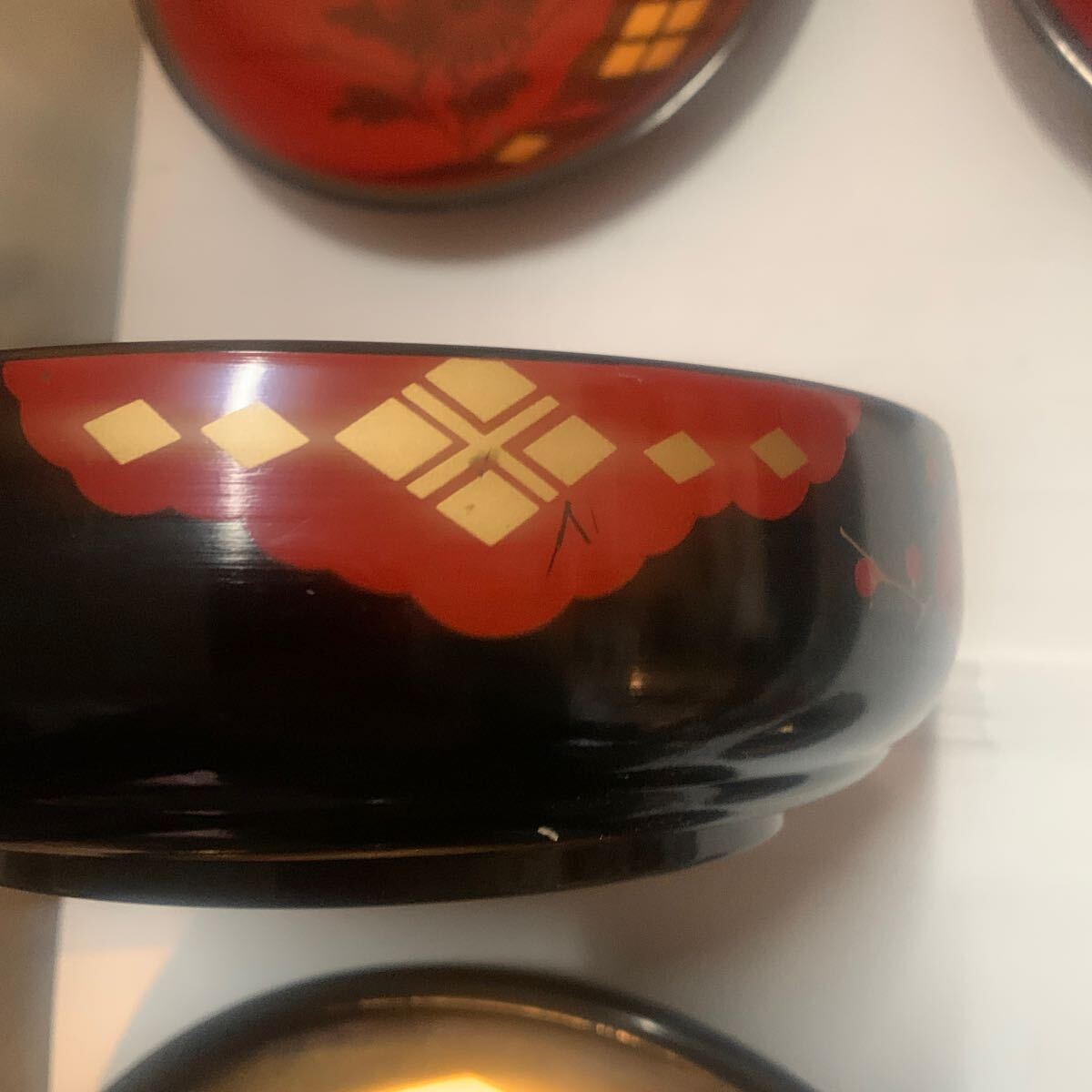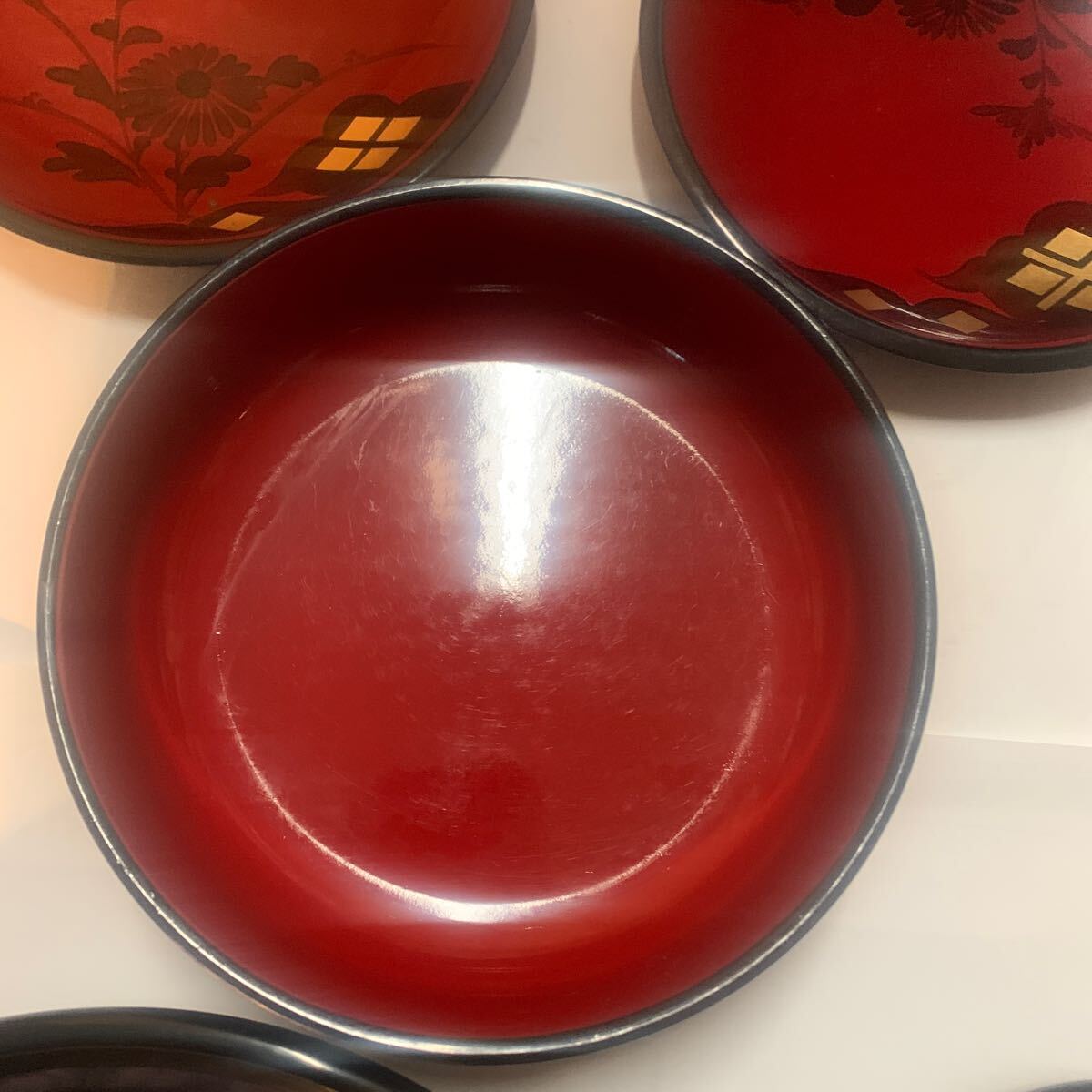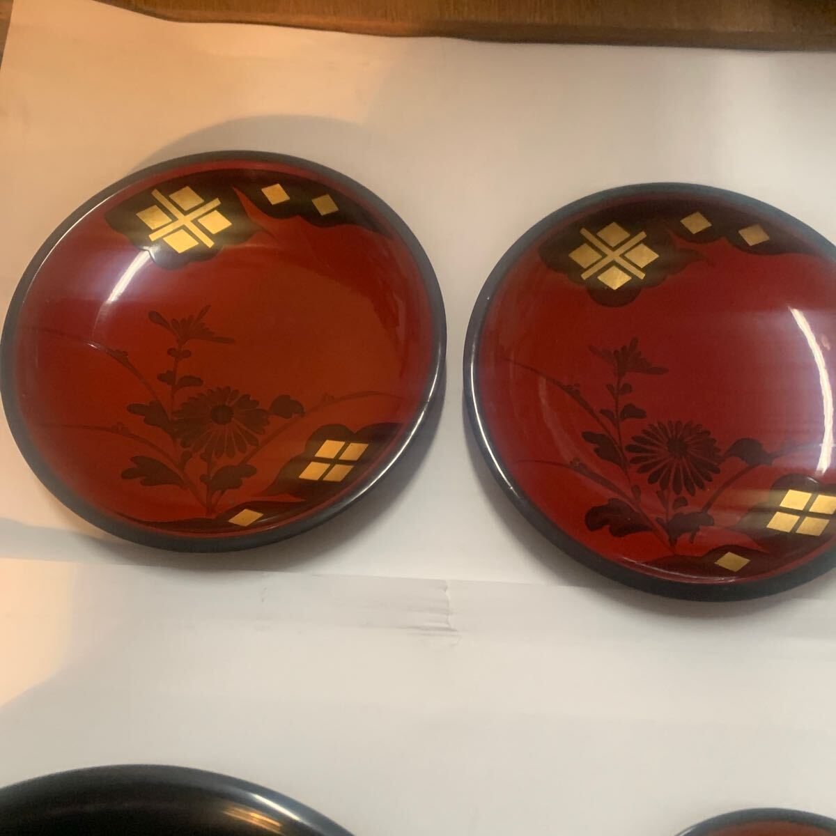 秀衡塗りの菓子器になります。大きい絵皿直径約25センチ中位の皿直径17センチ直径13センチ菓子入れ直契約18セン高さ5センチ木製になります。ノークレームノーリターンでお願いします。長期保存品になりますので、多少の汚れ傷等があります。ご理解の上ご入札ください。
