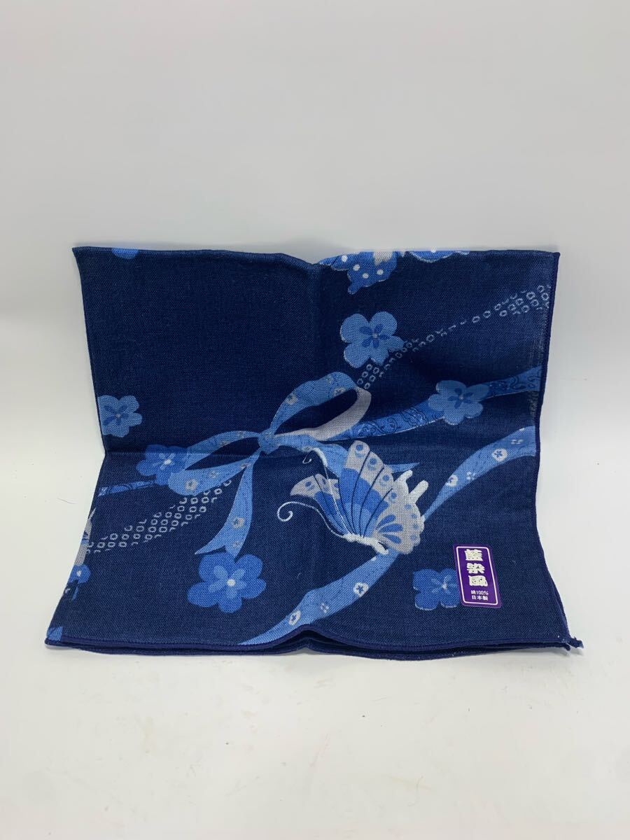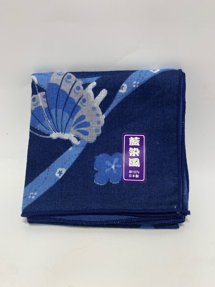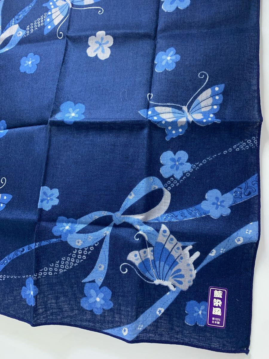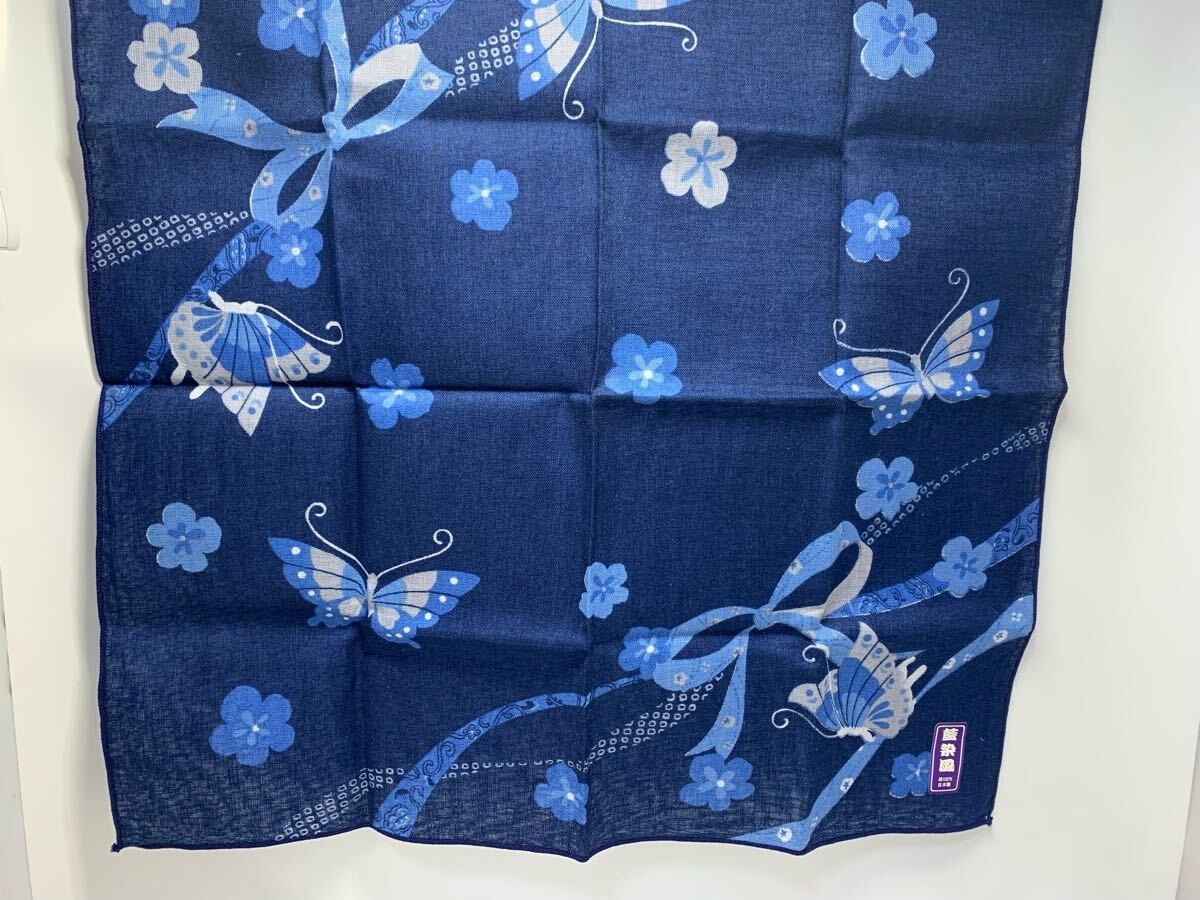 蝶と花の美しいデザインのネイビーのハンカチ。