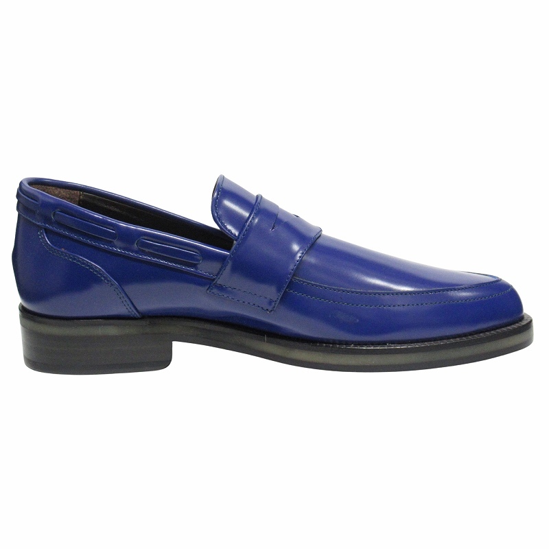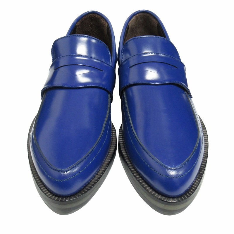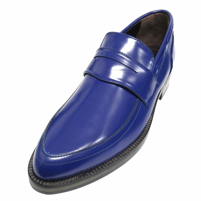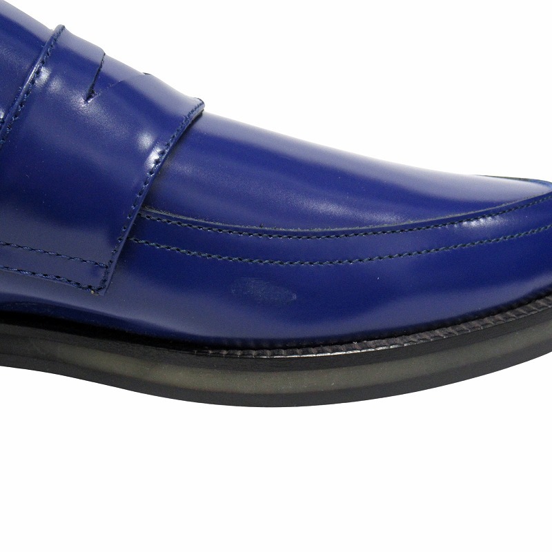 【仕様】光沢とブルーの発色が美しいシャイニーレザーのコインローファー ポインテッドトゥデザイン
