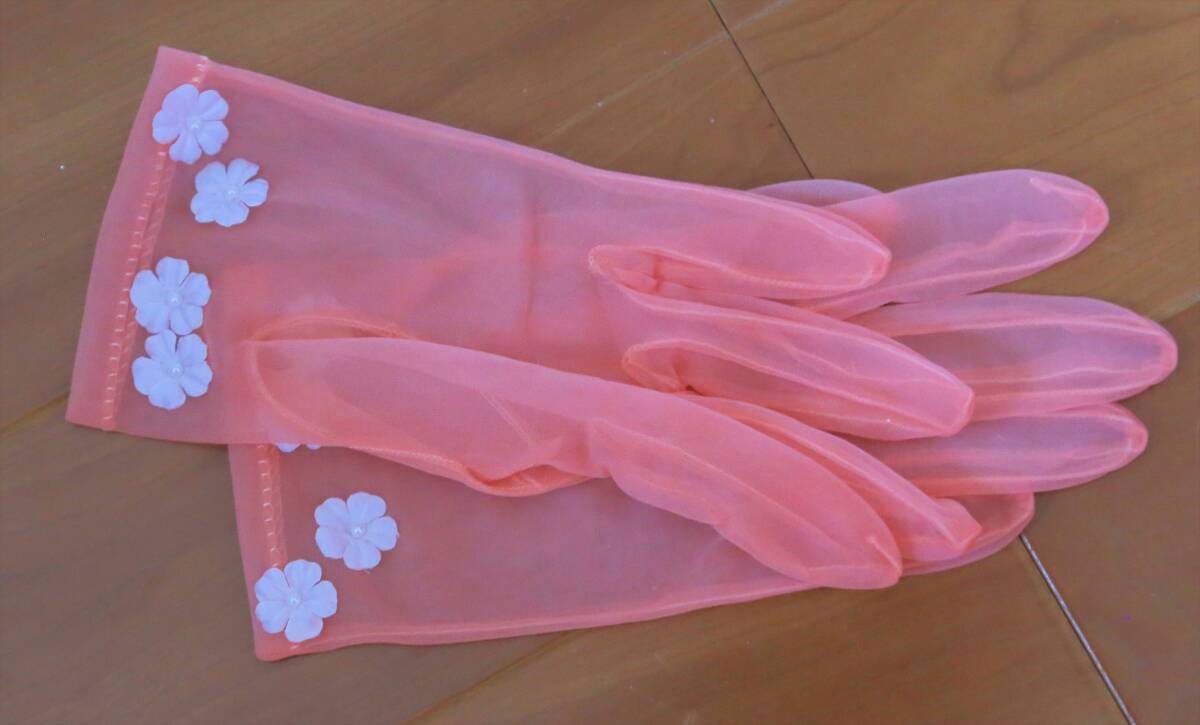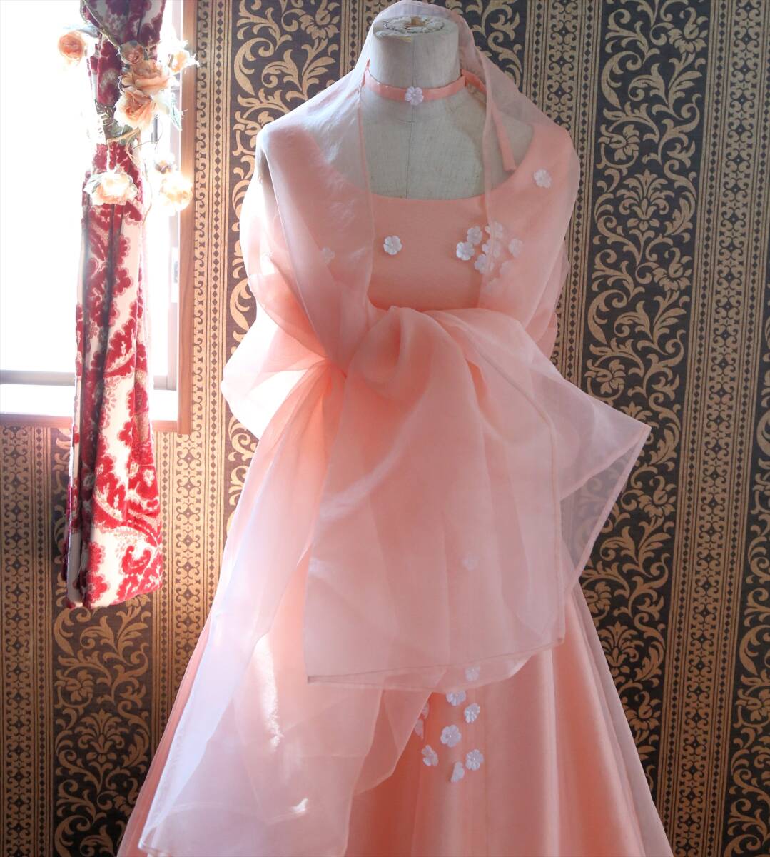 ドレスとお揃いのオーガンジーストール、チョーカー紐、オーガンジーグローブがセットで付きます