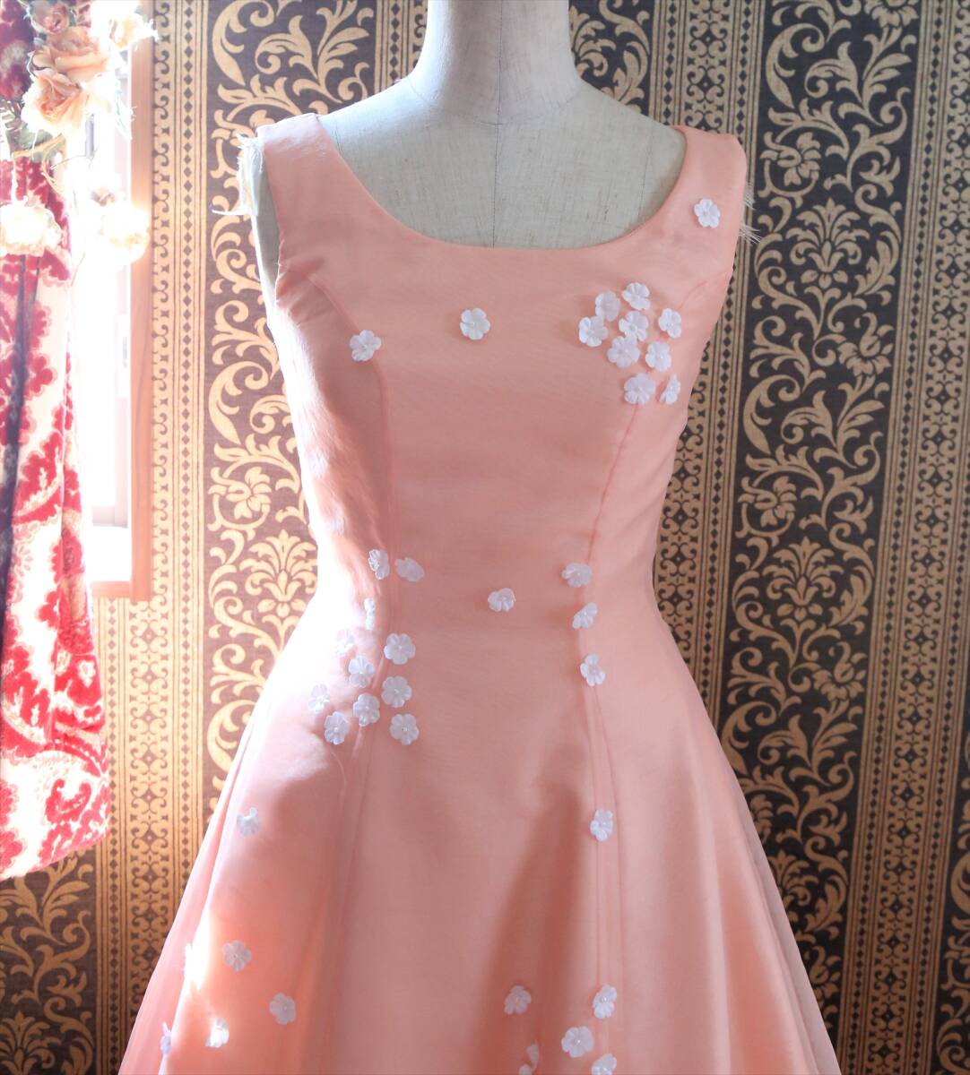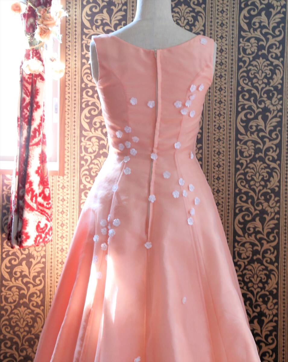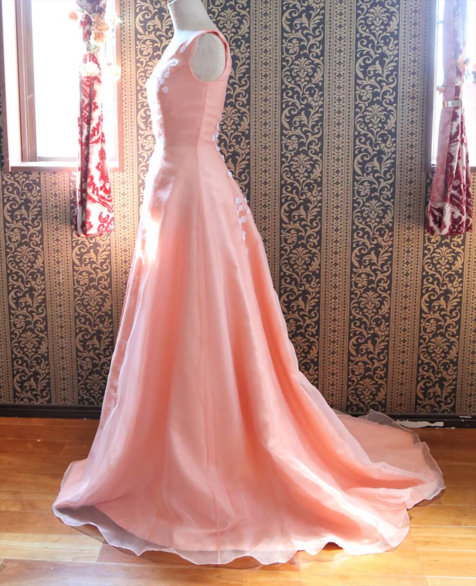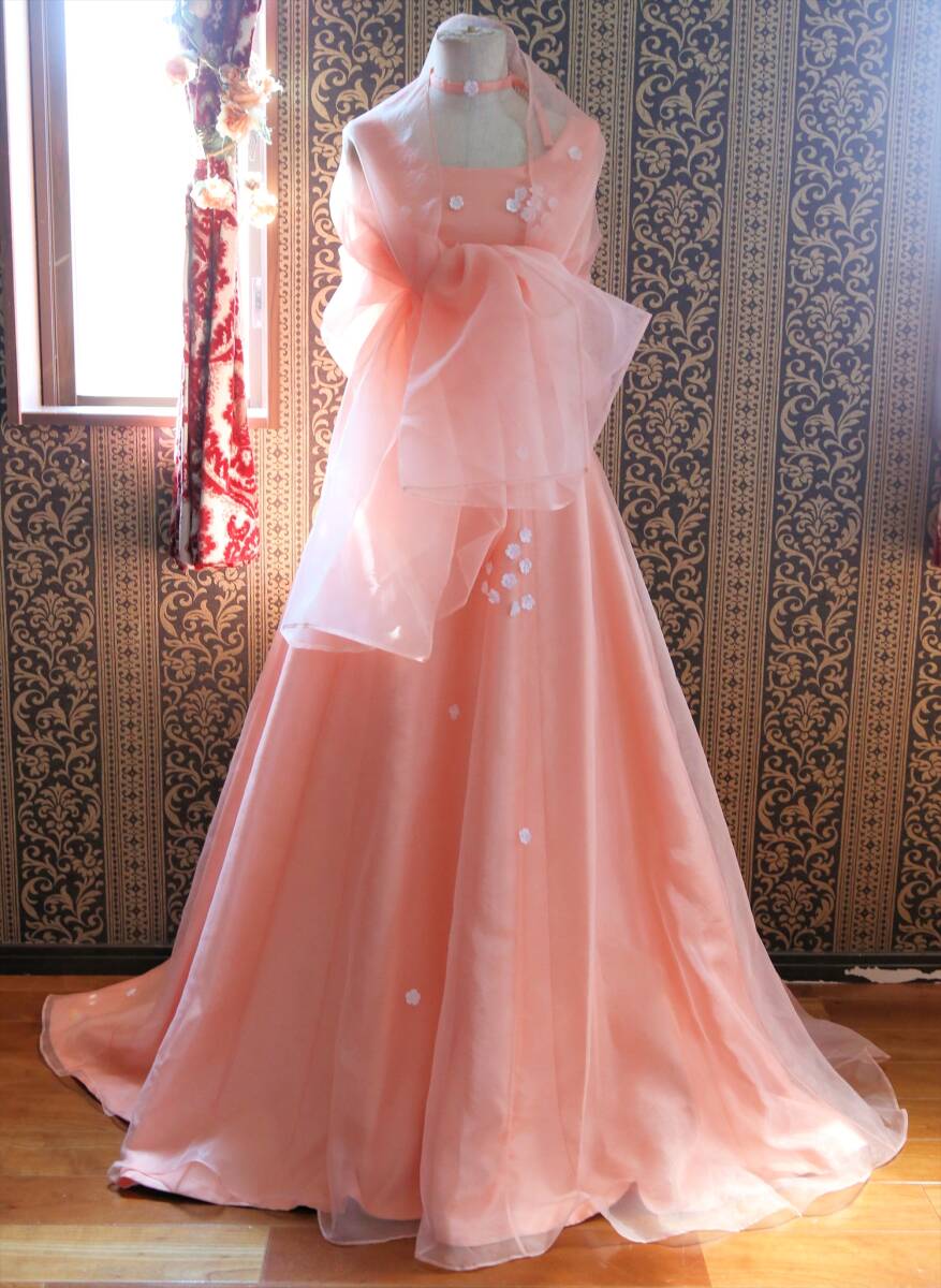 小物付きサーモンピンクのカラードレスウエディングドレス7号Sサイズ