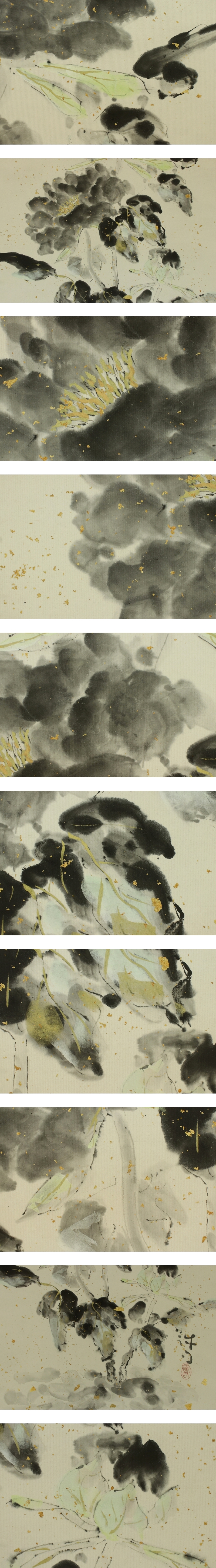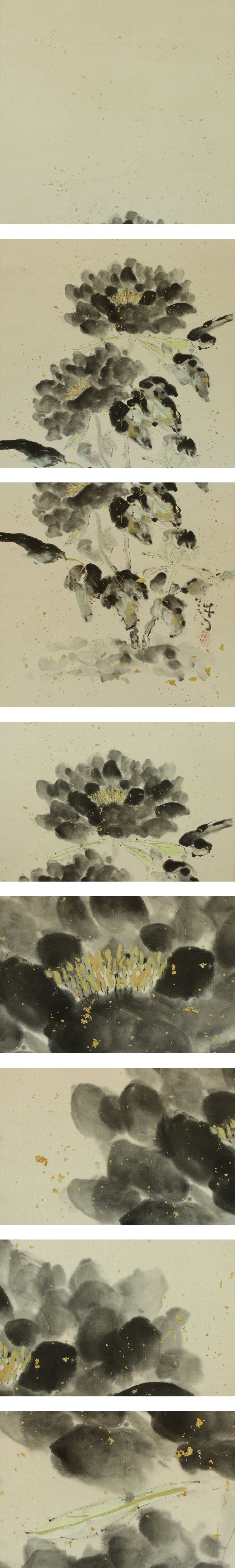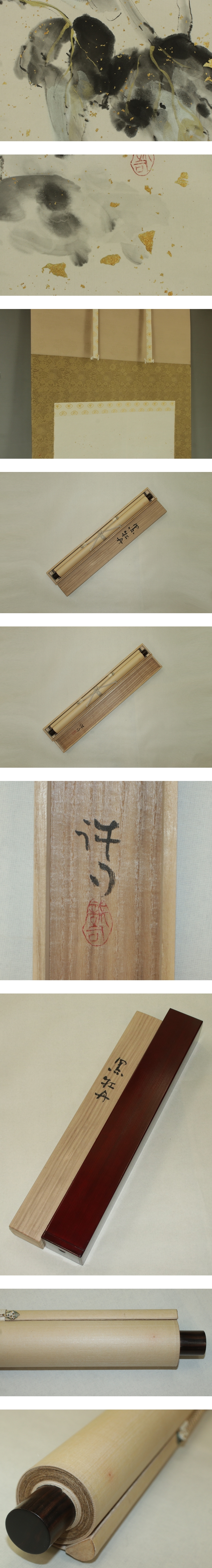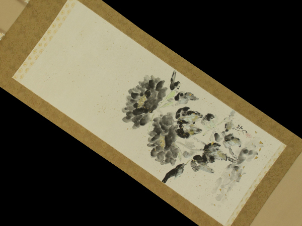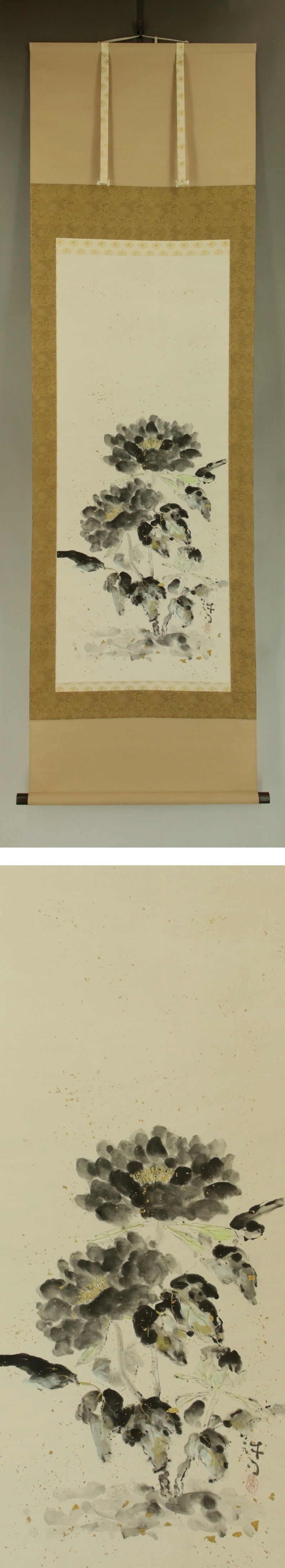 | №2412004【模写】川合誠司【黒牡丹】◆紙本◆共箱◆二重箱◆金砂子背景◆掛軸 | |