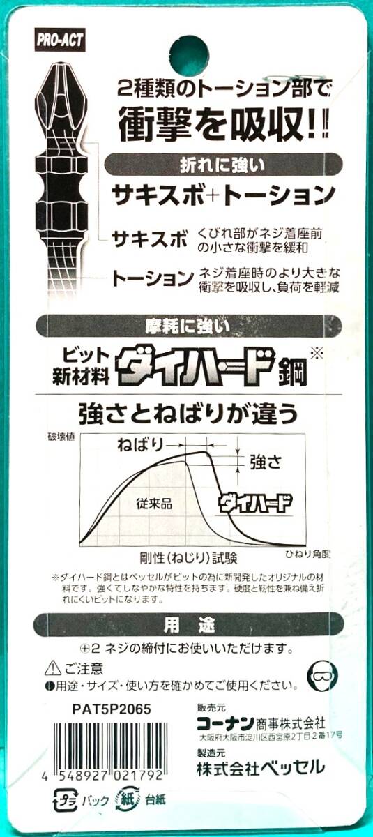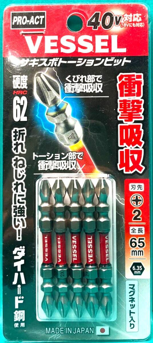 | 商品説明 | カテゴリー:電動インパクトドリルドライバー用ビット メーカー:VESSEL(株式会社ベッセル) 品番:PAT5P2065 数量・内容:5本セット L:65mm×6.35mm 両頭 (+2ネジ用) 材質:ダイハード鋼(HRC62) マグネット 対応機種:40V対応品(18Vにも対応) 状態:新品未使用・未開封 日本製(MADE IN JAPAN) ★ダイハード鋼の採用で、折れ・ねじれに強い。 強さとねばりが違う ※ダイハード鋼とはベッセルがビットの為に新開発したオリジナルの材料です。 強くてしなやかな特性を持ちます。 硬度と靭性を兼ね備え折れにくいビットになります。 ★2種類のトーション部で衝撃を吸収(折れに強い) サキスボ くびれ部がネジ着座前の小さな衝撃を緩和 トーション ねじ着座時のより大きな衝撃を吸収し、負荷を軽減 |