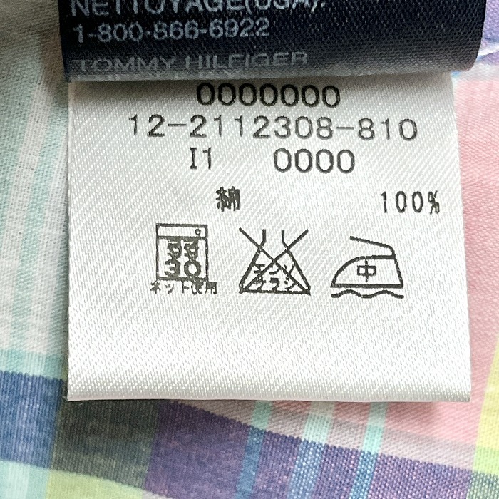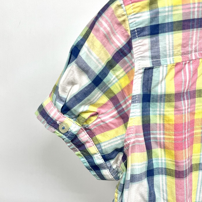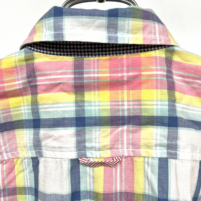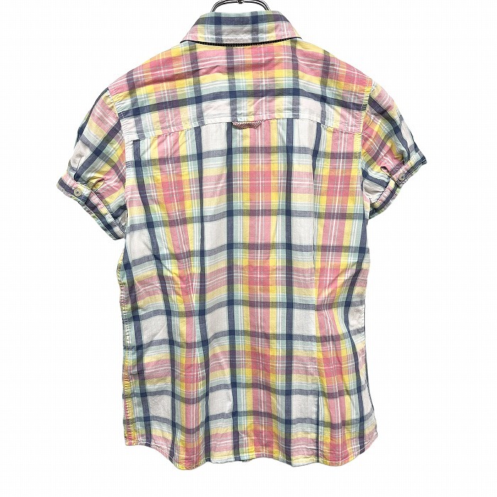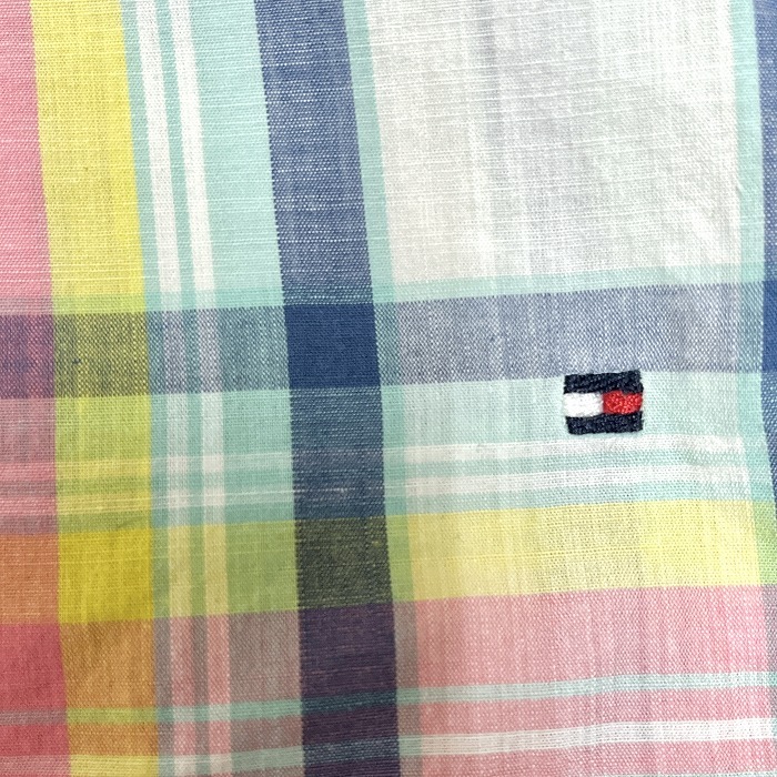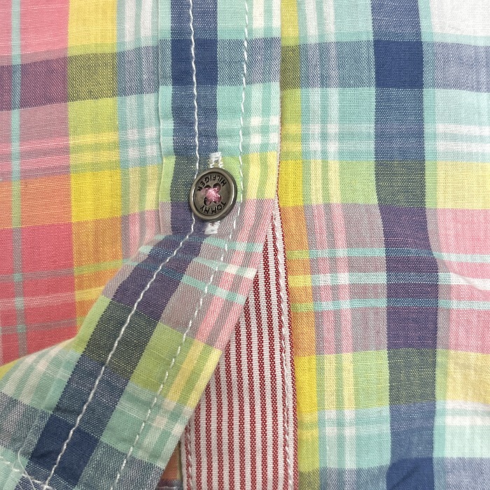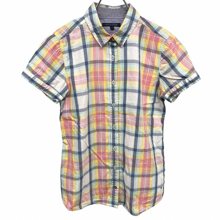 商品タイトル | トミーヒルフィガー TOMMY HILFIGER 少し薄手 シャツ チェック 半袖 ポケット無し 裾にロゴ刺繍 綿100% 6 ピンク×青×黄×白 レディース |