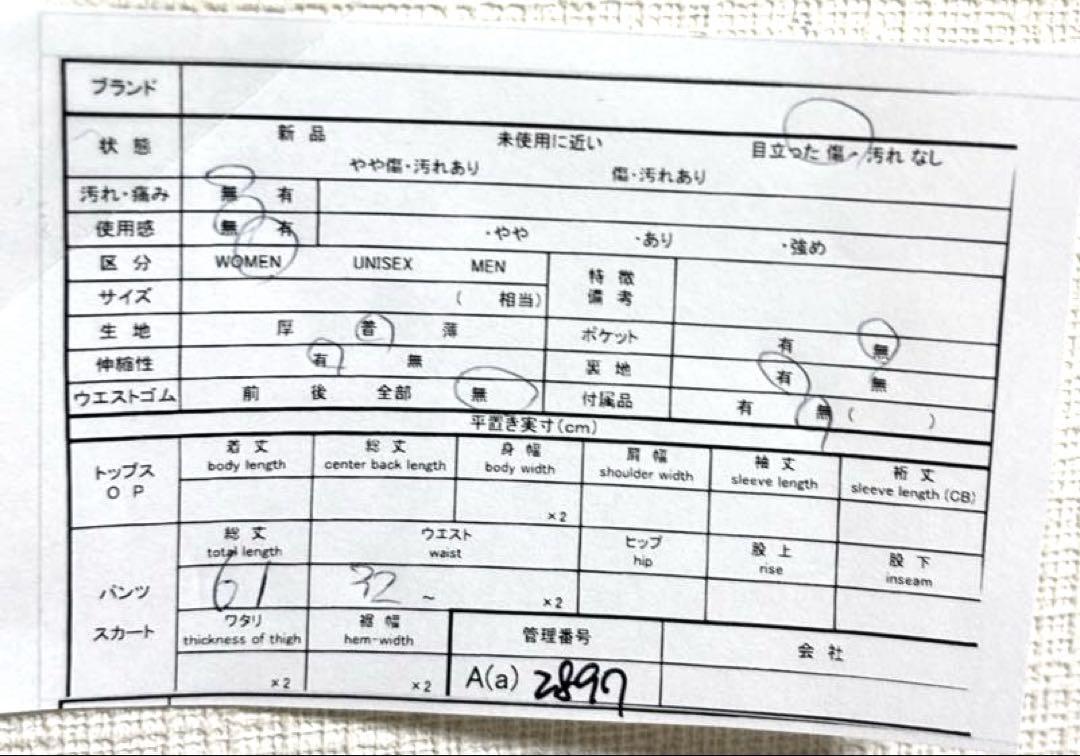 ※アパレルのブランドによりサイズ基準が異なるので、必ず採寸表をご確認の上、ご購入お願いいたします