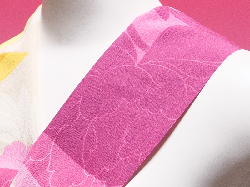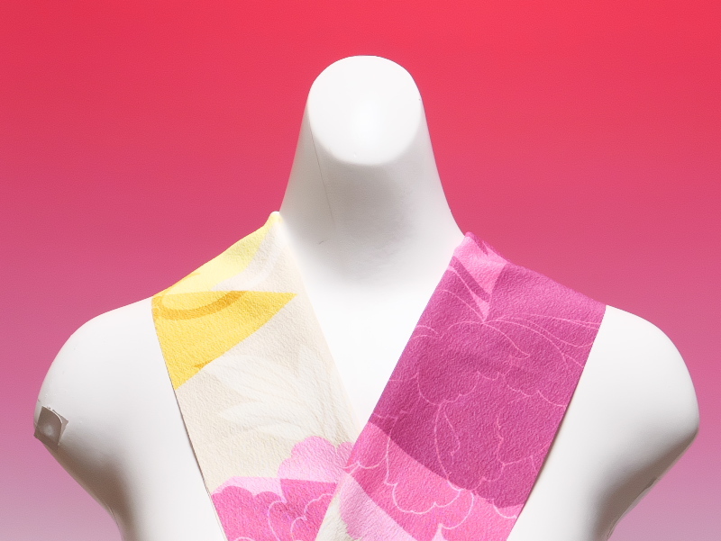 振袖用半衿 810 東レシルック 短尺  サンドベージュの地色に赤紫の花と辛子色濃淡の角錐風柄 微訳有 クリックポスト発送