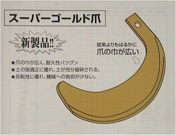 -------------------------------------------------------------------------省エネ耕運に最適 スーパーゴールド爪 *爪ネジM10(スパナサイズ17mm)をご確認ください。今や耕運爪の主流になりつつある 高反転・省燃費 のスーパーゴールド爪です。黒爪3回耕運がゴールド爪2回耕運で完了!(弊社仕様実績によりますが保障値ではありません) ナタ爪と偏心爪のセットです。交換の機会に一度使ってみては? ---------------------------------------------------------------------------------------- 返品交換についてのお知らせ*落札後の返品・交換はできませんので、ロータリー型式等を十分ご確認のうえ落札願います。*佐川急便の代引(離島を除きます)でも領収証発行可能です。代引手数料440円●送料無料 (離島の方は送料着払です)出品時のシステム上 離島の方も「送料無料」と表示されますが離島の方は送料着払での発送になります。---------------------------------------------------------------------------------------- ワンタッチピン式にはお使いいただけません。*ピン式は爪を固定する穴が表側とも丸穴になっています(ねじ止めは片側が6角穴です)