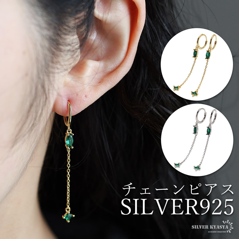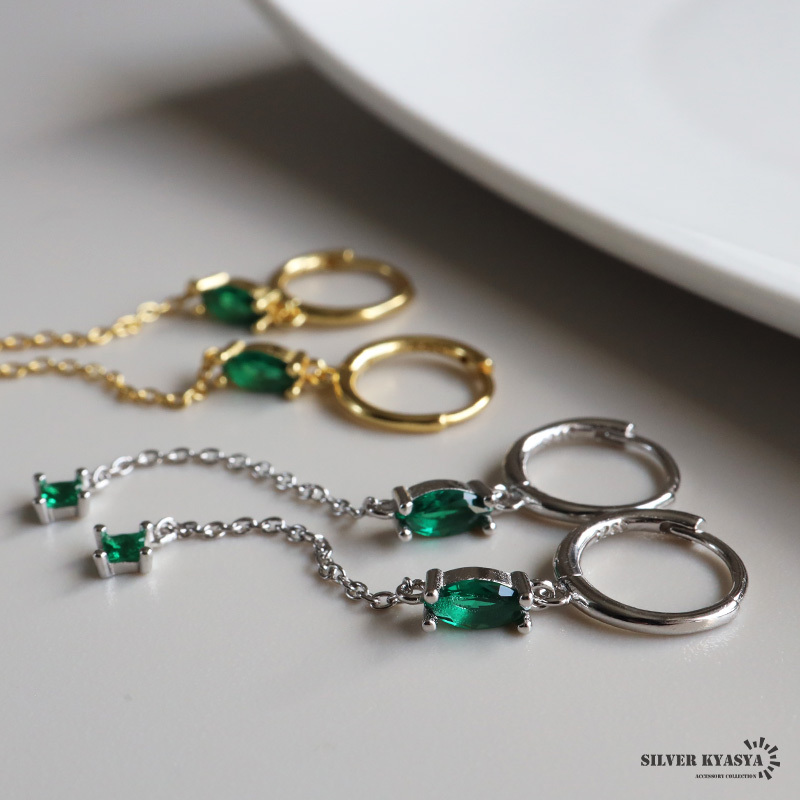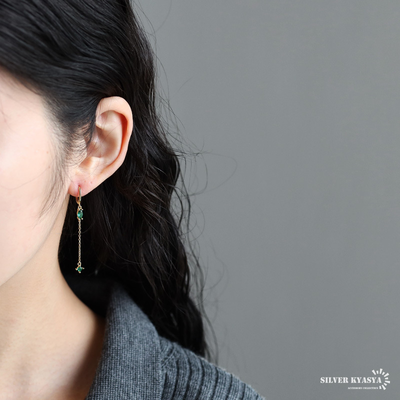 揺れ動くチェーンが目を惹くフープピアス。エメラルドカラーのストーンが魅力的なアイテム。カラーは全2色からお選びいただけます。