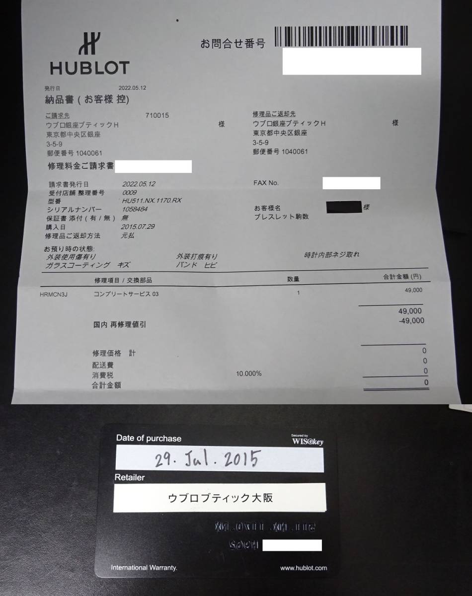 純正内外箱(内箱ベタあり)、国際保証書、冊子類、正規店修理納品書