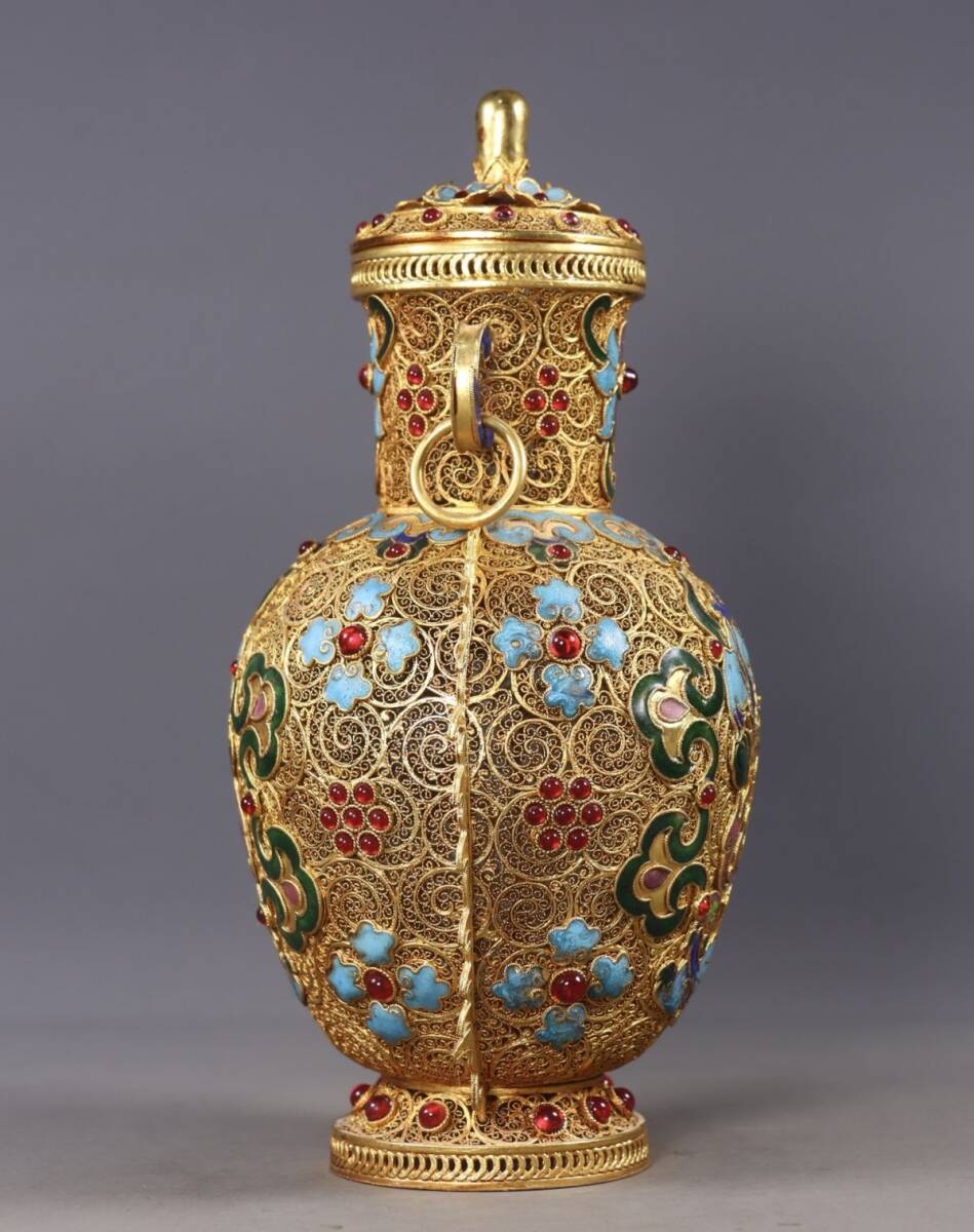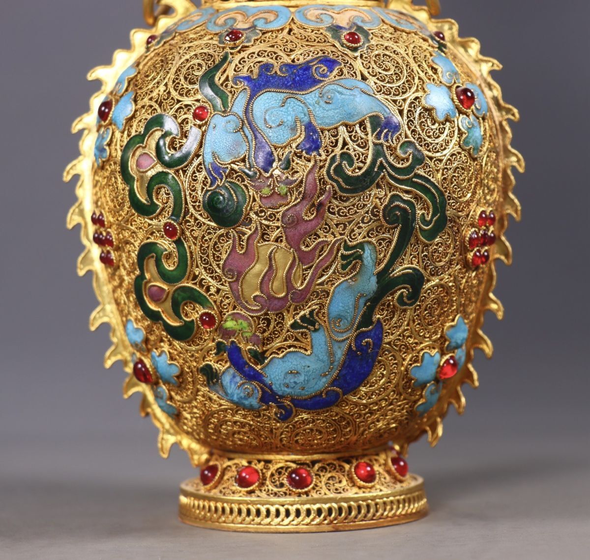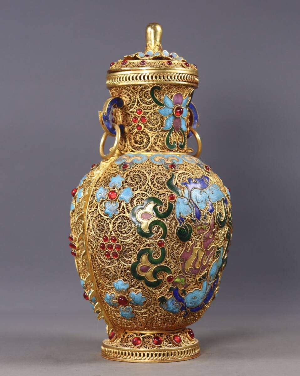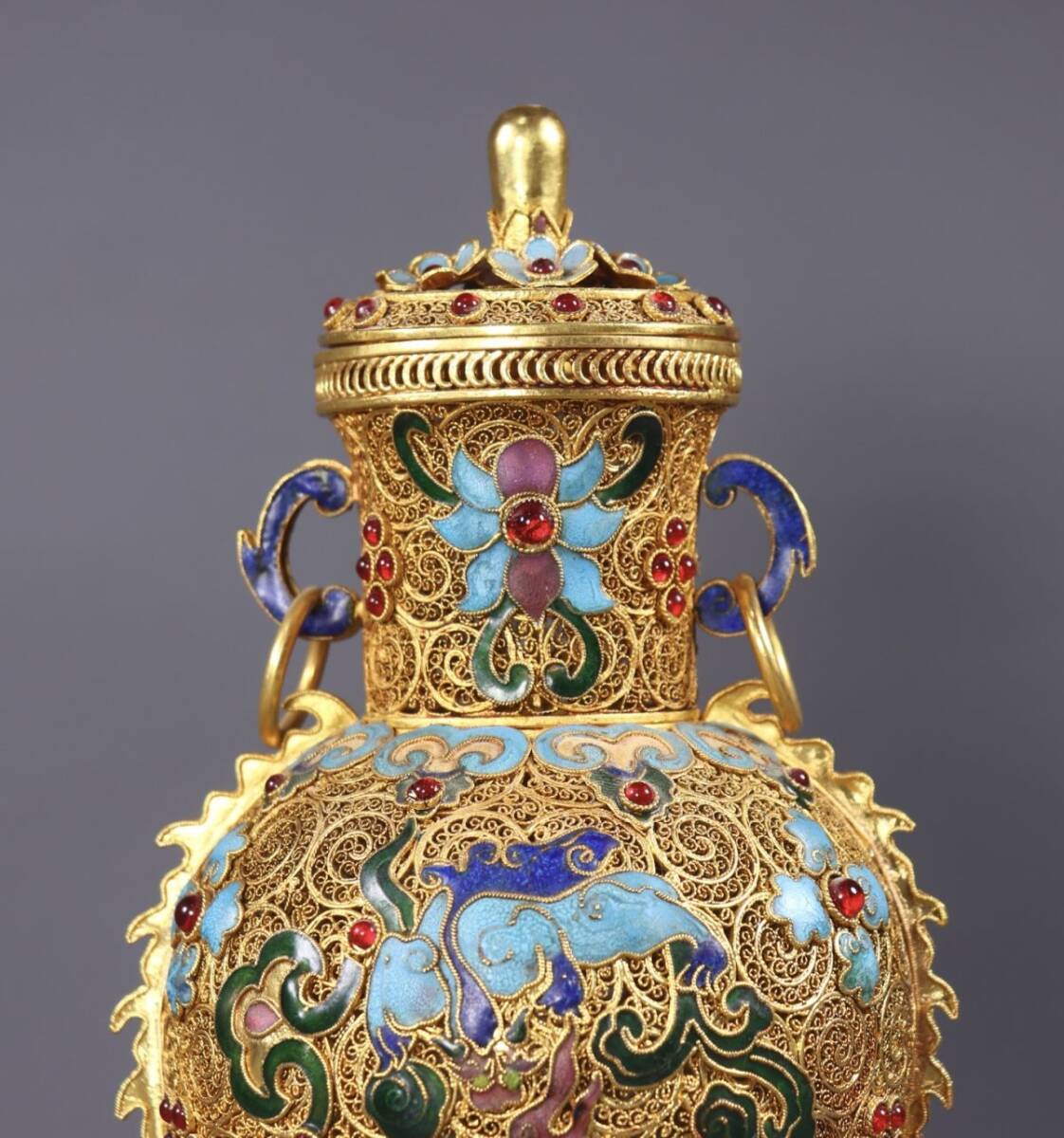 永し 清時代 乾隆御製 花絲塗金 焼藍 嵌寶石 花卉紋瓶 極細工 置物擺件 古美術品 時代物 古董品 収集 旧家蔵出 中国唐物 551g
