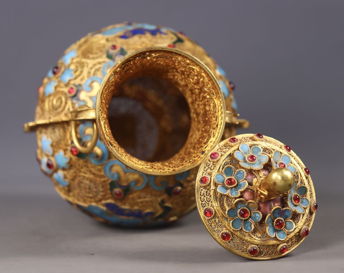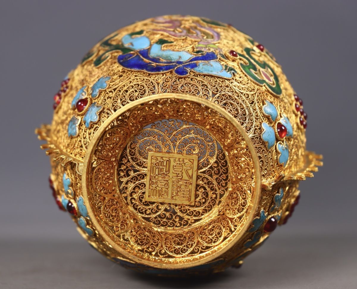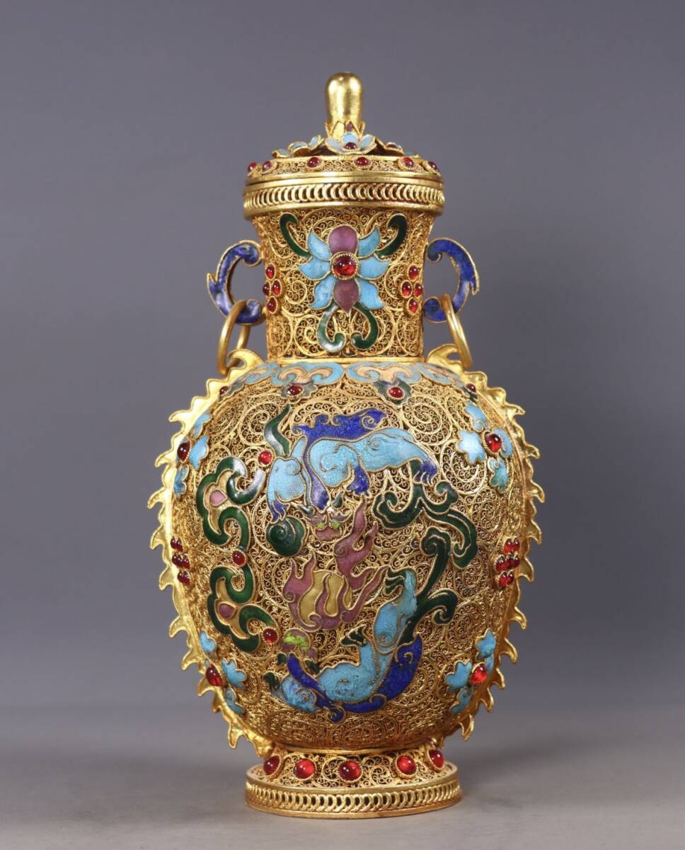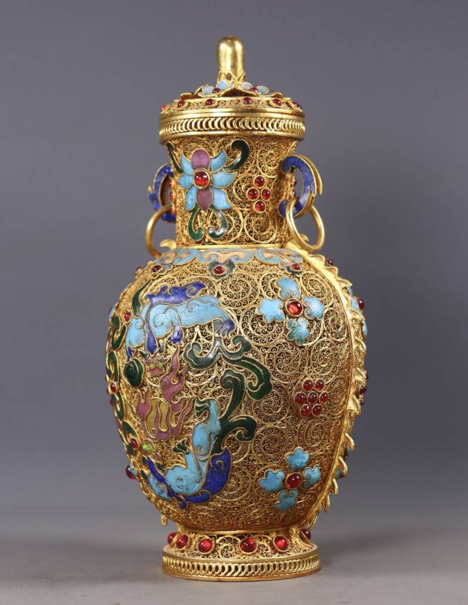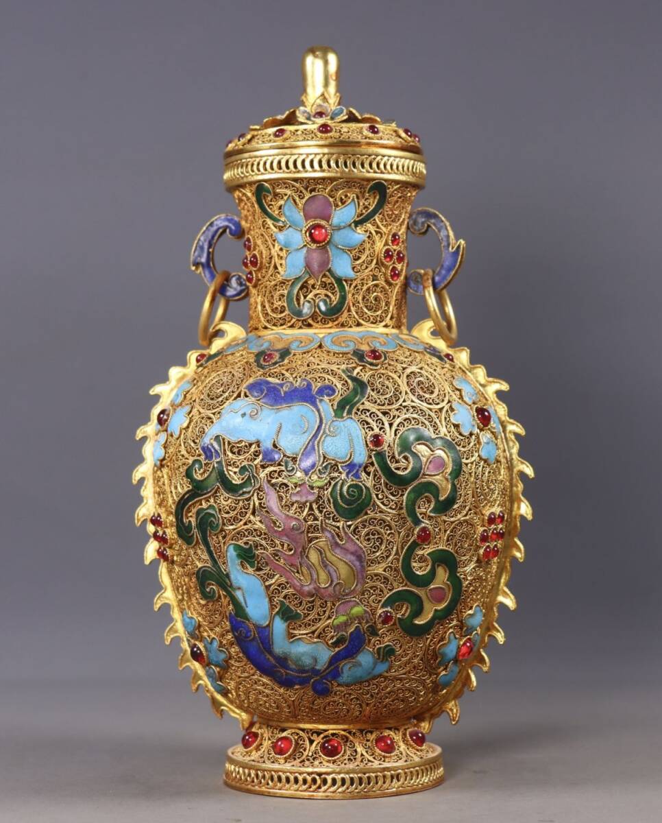 永し 清時代 乾隆御製 花絲塗金 焼藍 嵌寶石 花卉紋瓶 極細工 置物擺件 古美術品 時代物 古董品 収集 旧家蔵出 中国唐物 551g