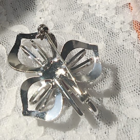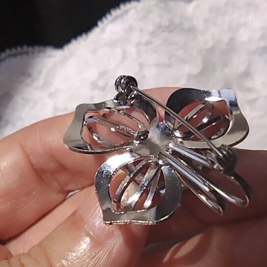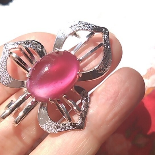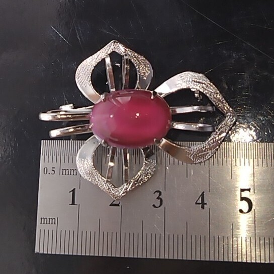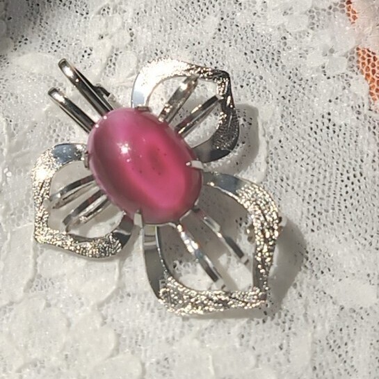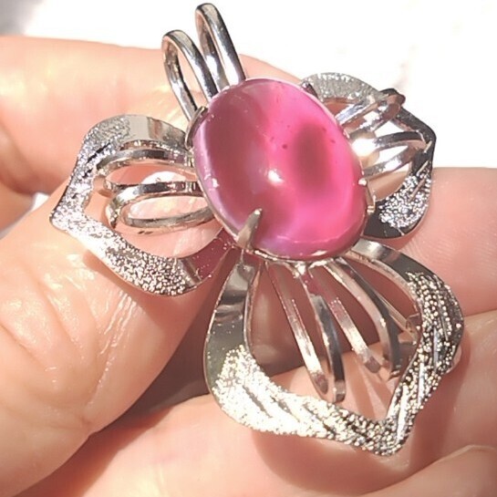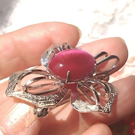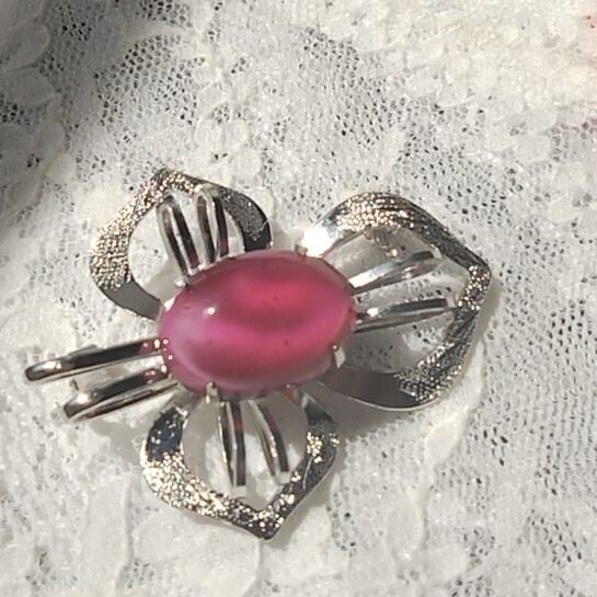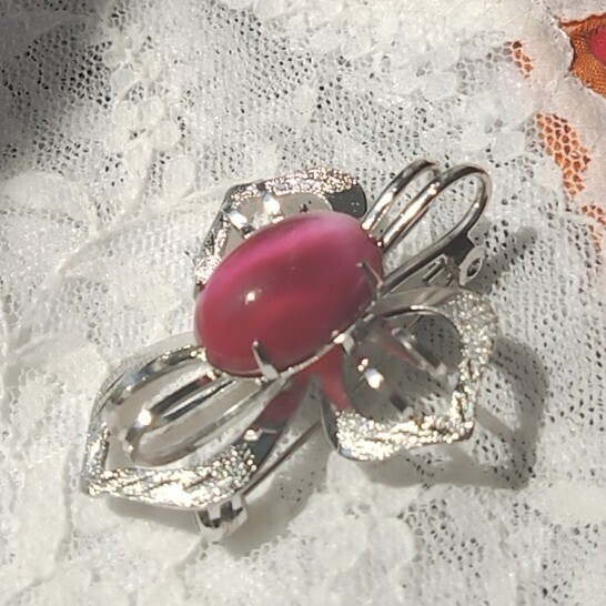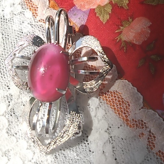 光沢のある金属製の花形台座に、ピンク〜紫系のオーバルカットストーンがあしらわれています。