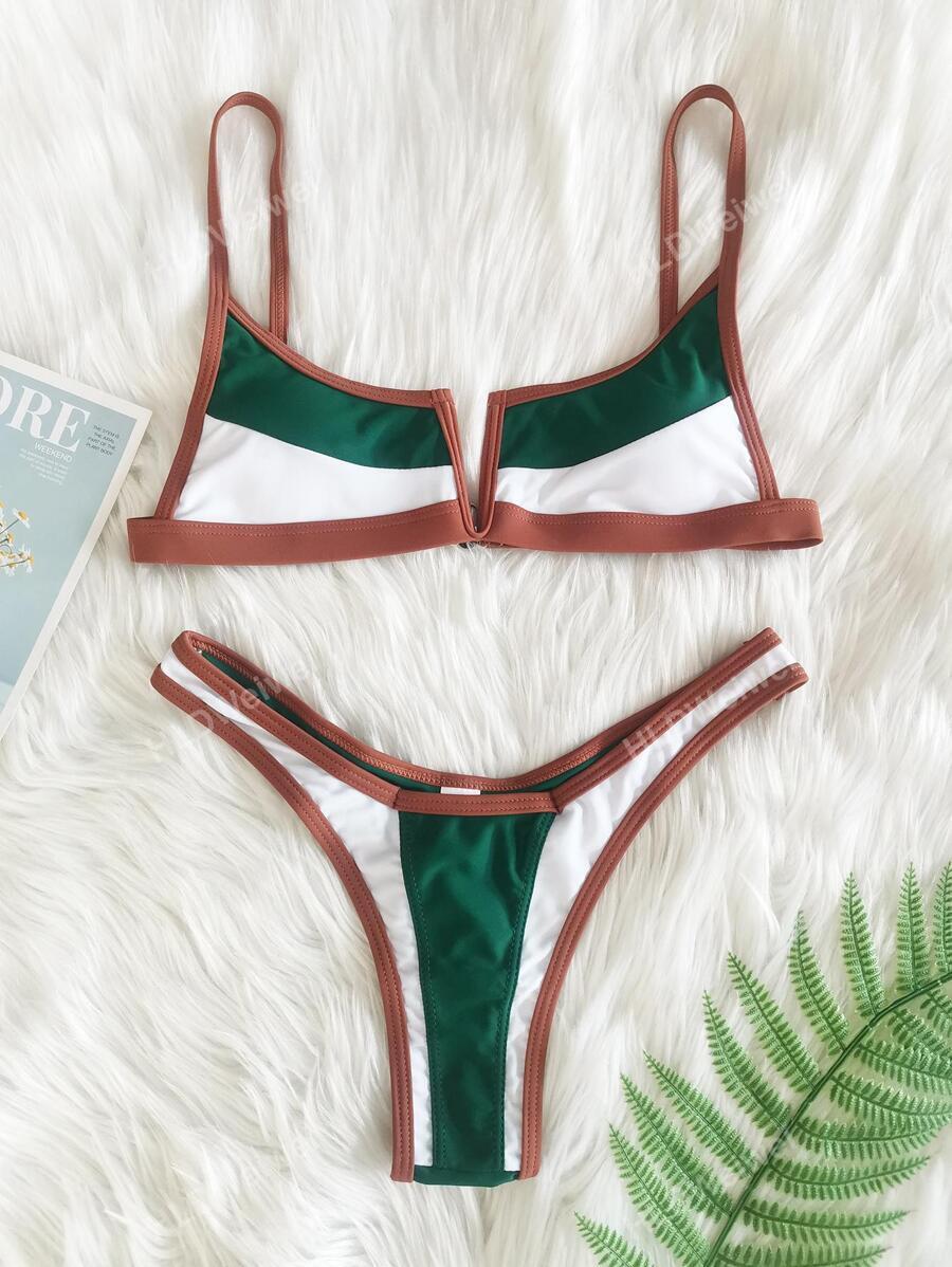 レディース 水着 ビキニセット カラーブロック コントラストバインディング ビキニ水着 女性用 夏のビーチアウトフィット スイミン