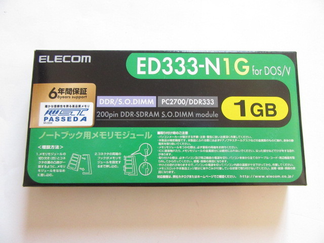 ・ELECOM(エレコム)の、PC2700(DDR333)対応 200ピン S.O.DIMM メモリーモジュール(主にノートブック、薄型デスクトップPC用) 「ED333-N1G、容量:1GB X 1枚」 です。