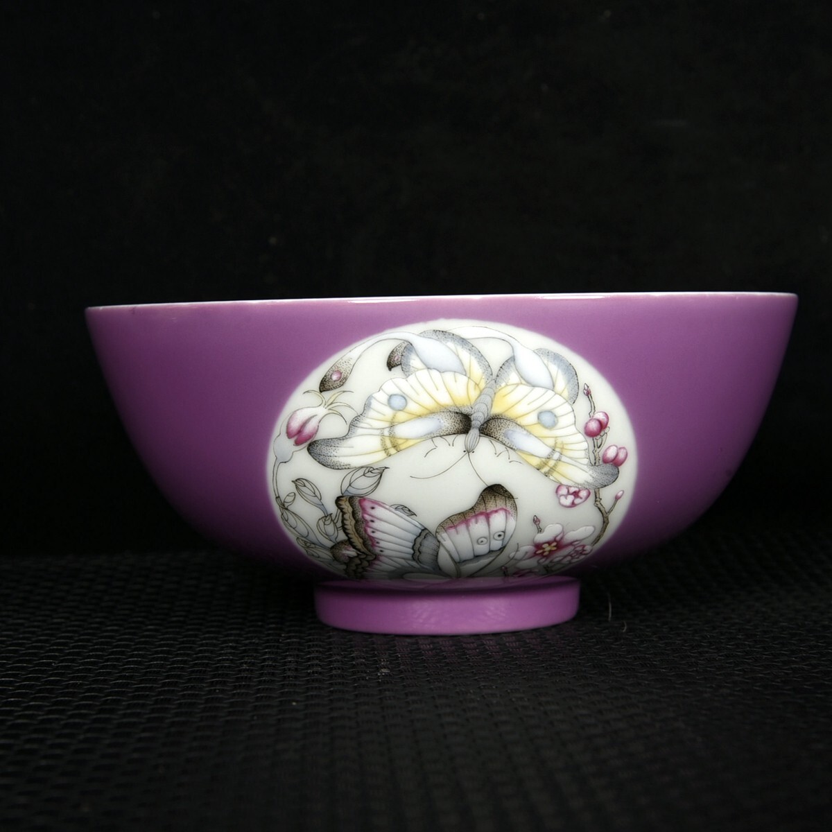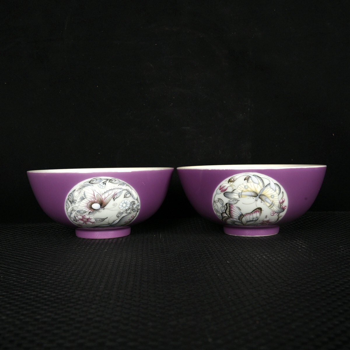 【瓏】陶磁器 紫釉開窗琺瑯彩蝶戀花紋碗一対 大清雍正年製 染付 置物擺件 古賞物 古美術 陶芸 蔵出