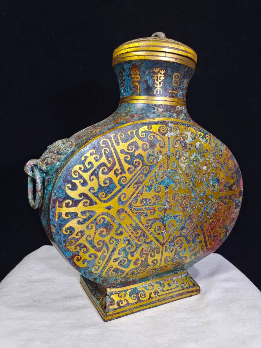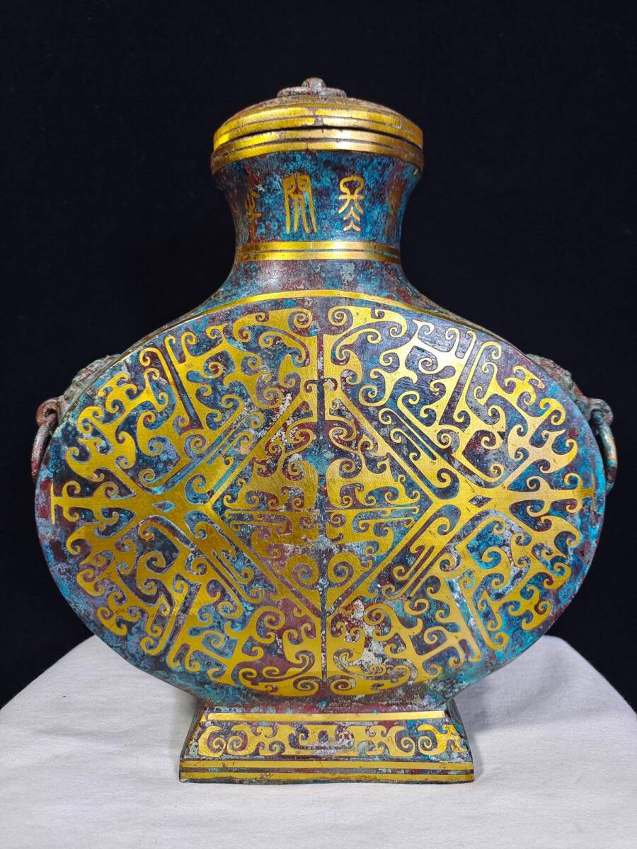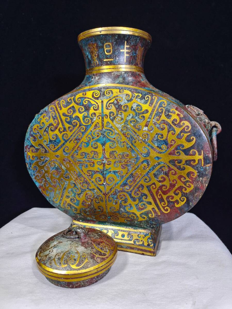 | 【蔵友館蔵品・戦・青銅製・錯金銘文扁壺】・希少珍品・置物・賞物・中国時代美術 |