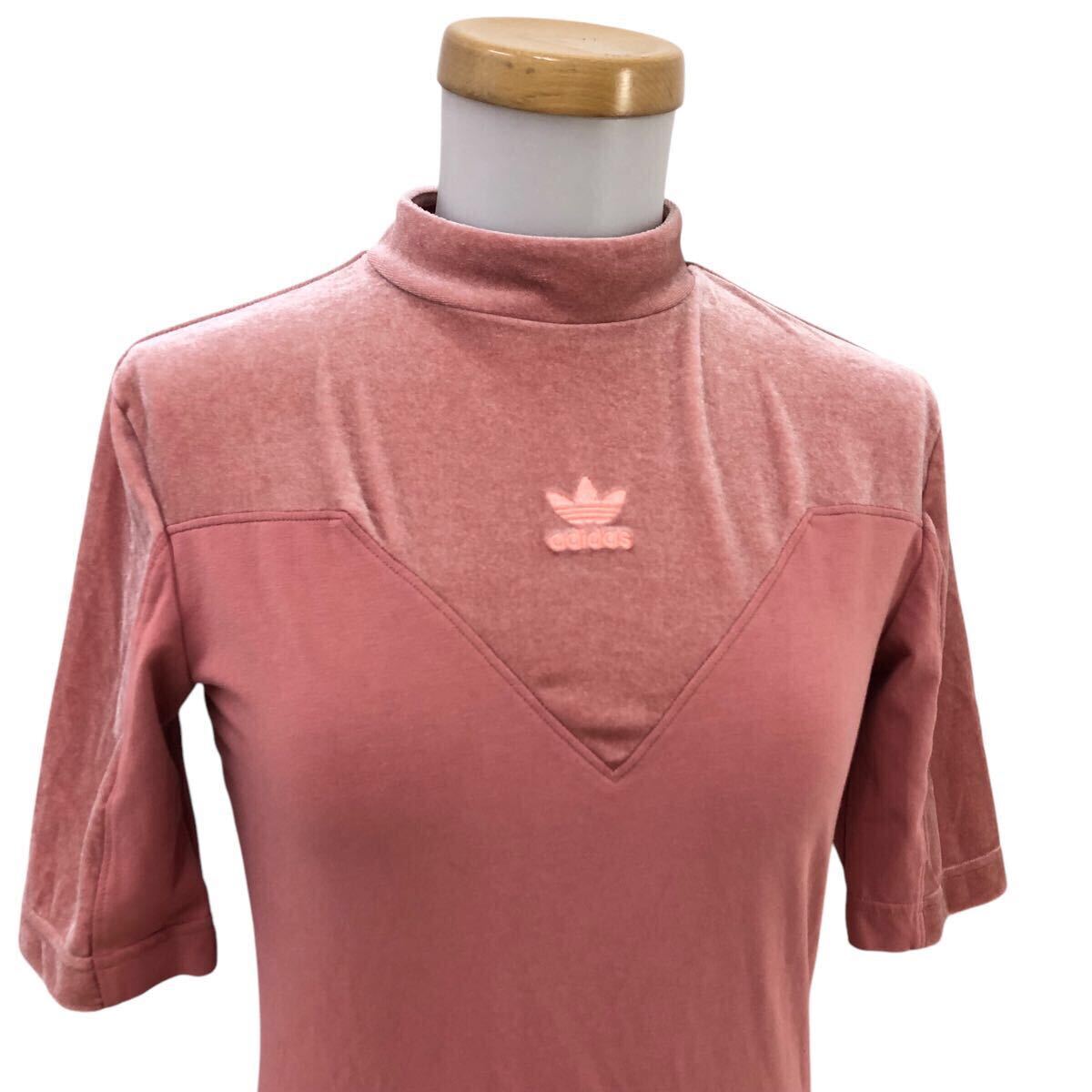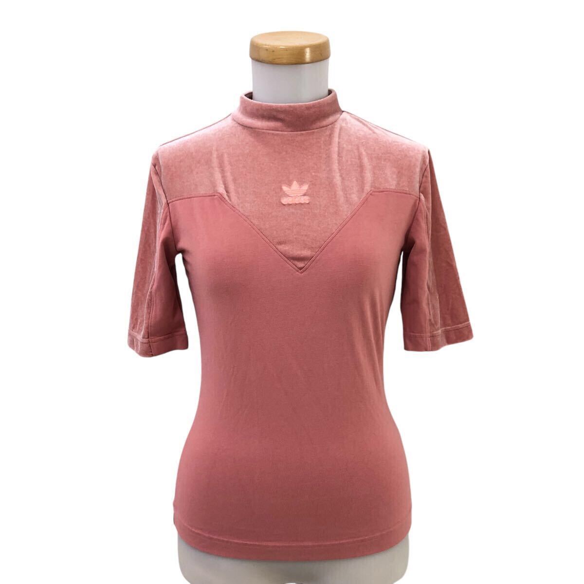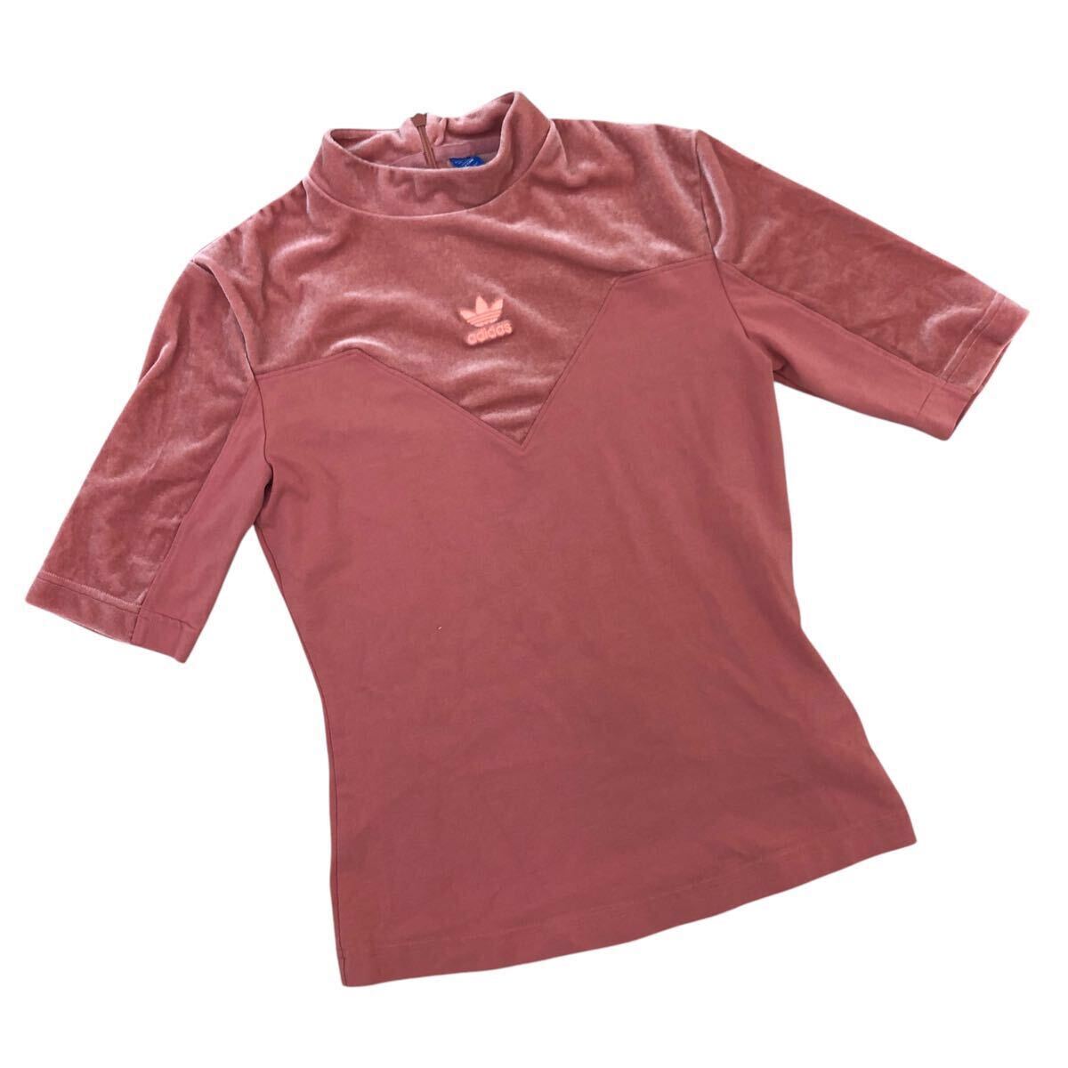 Nm298-22 adidas アディダス ベロア モックネック 半袖 Tシャツ シャツ カットソー トレフォイル 刺繍 トップス ピンク レディース L